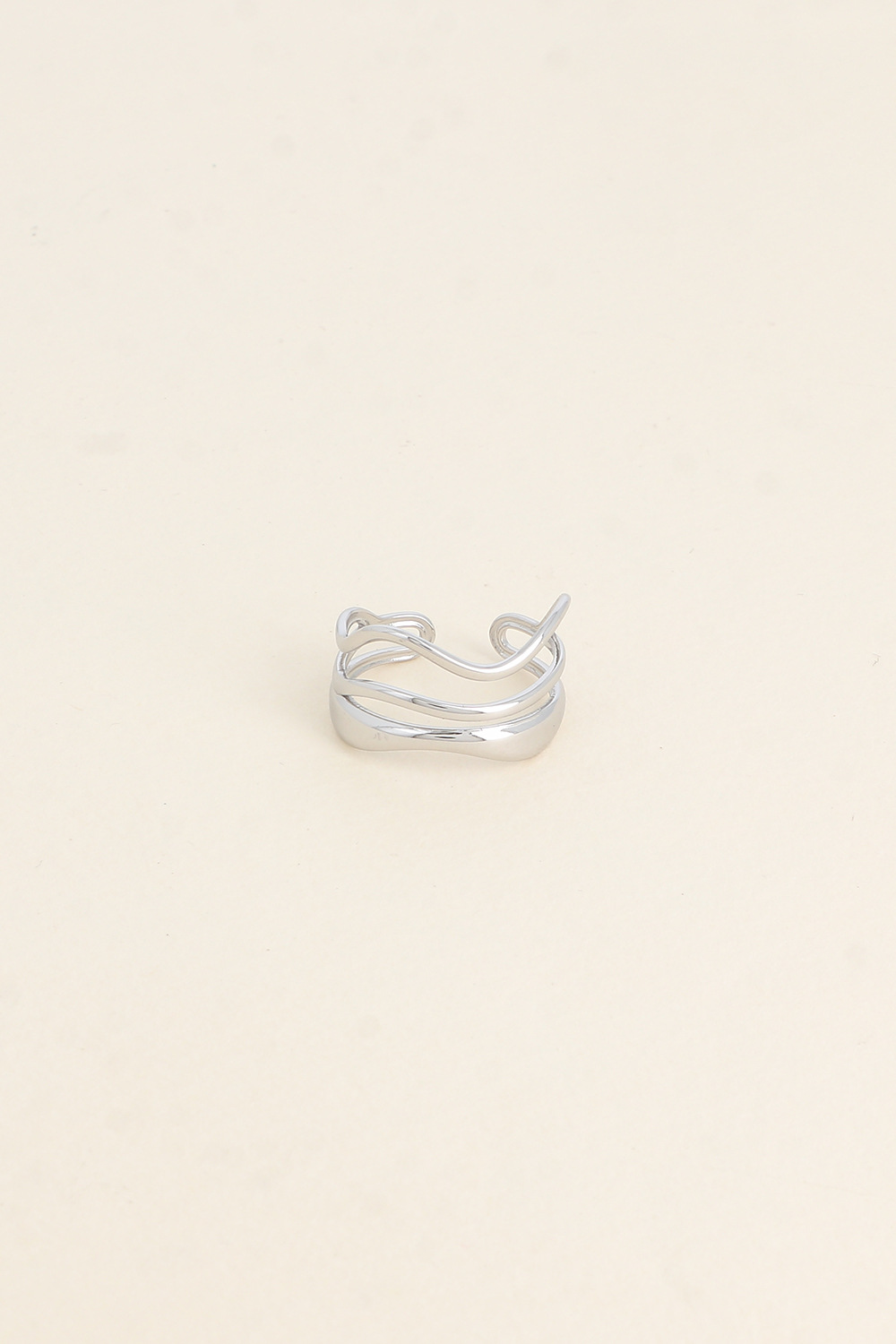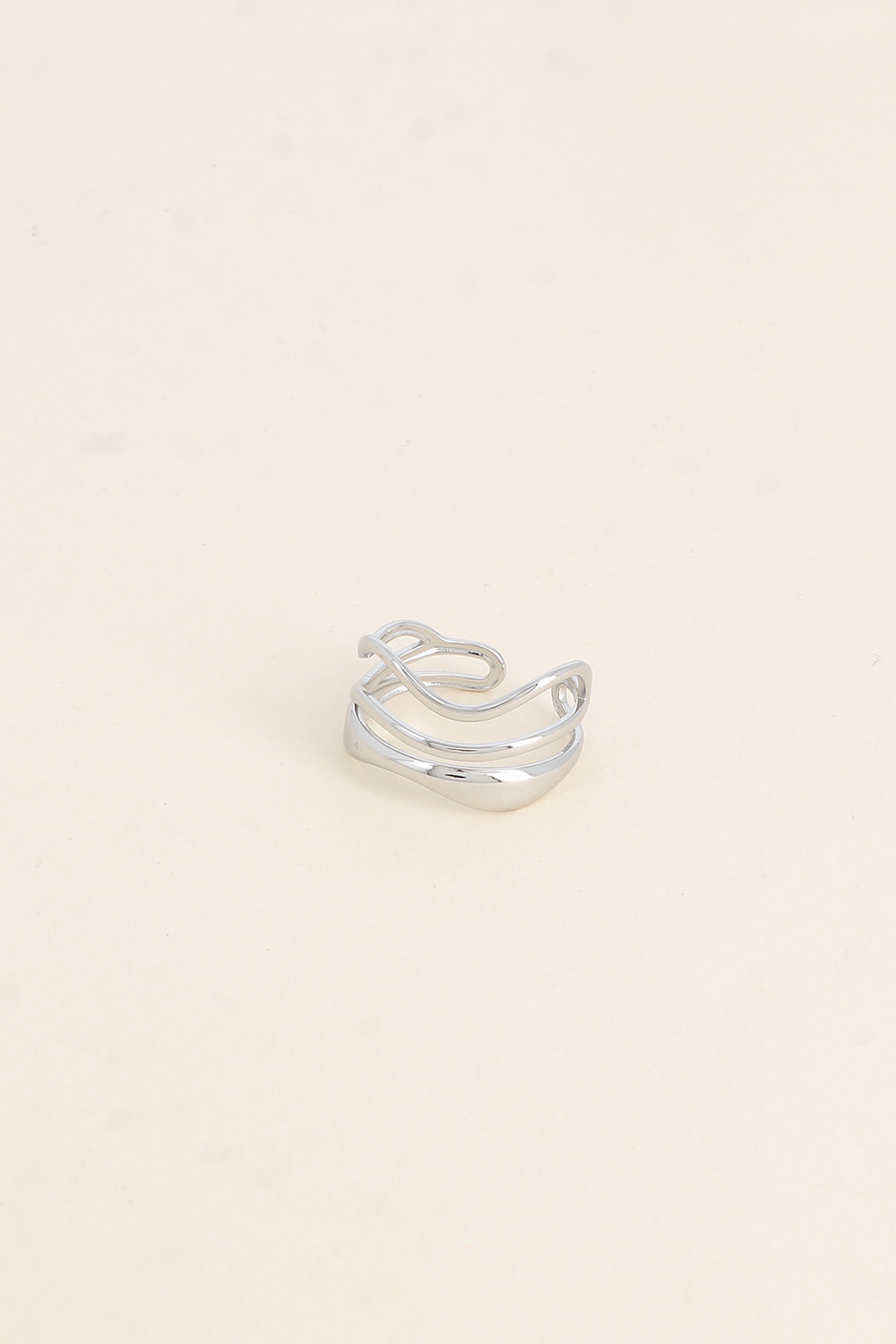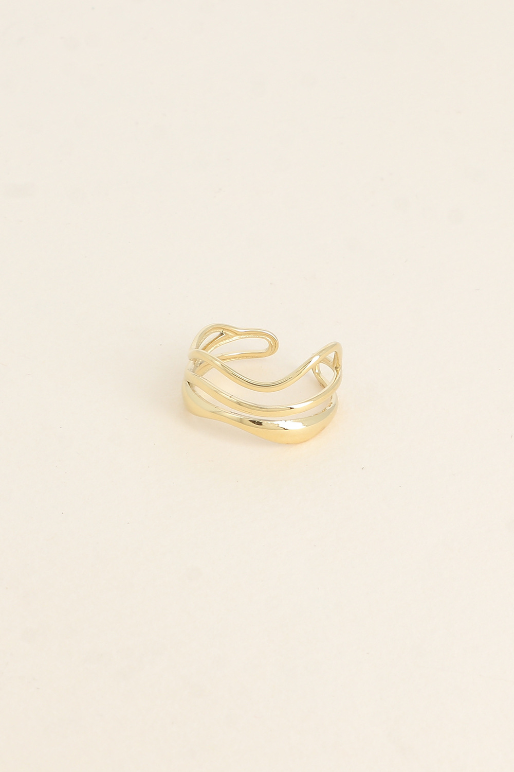 Anel de inspiração minimal e elegante com três linhas com efeito ondulado e assimétrico, em aço, ajustável.
