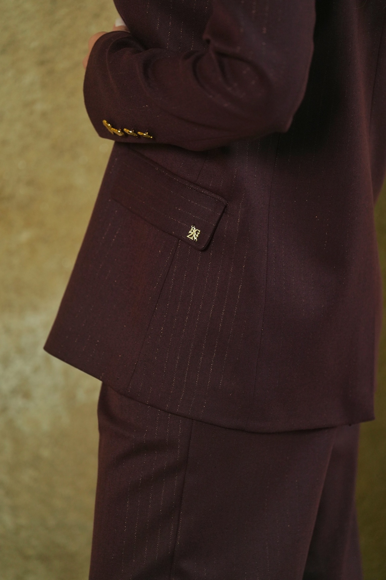 Blazer preto num tecido rico e composto com risca dourada em todo o tecido.