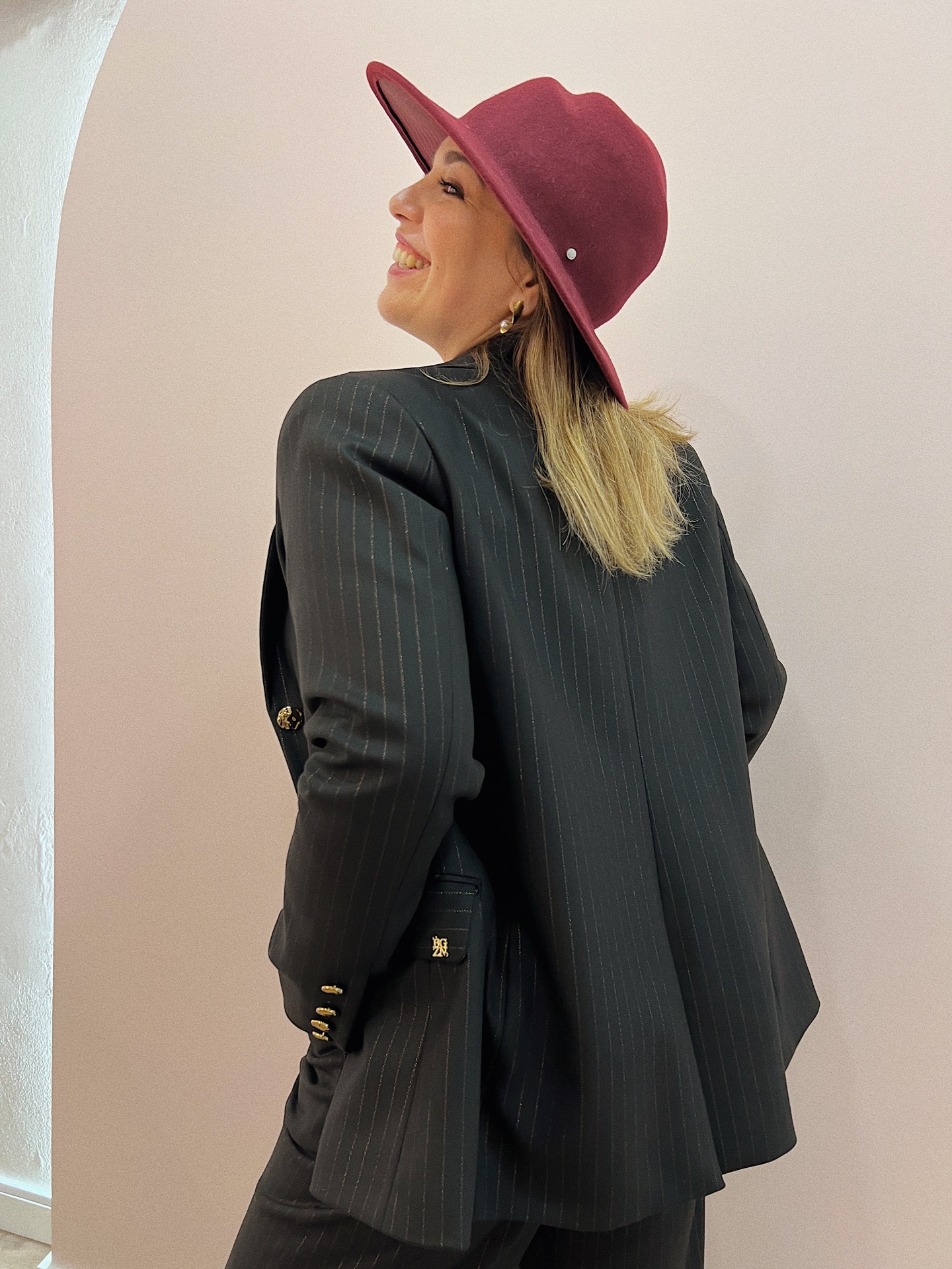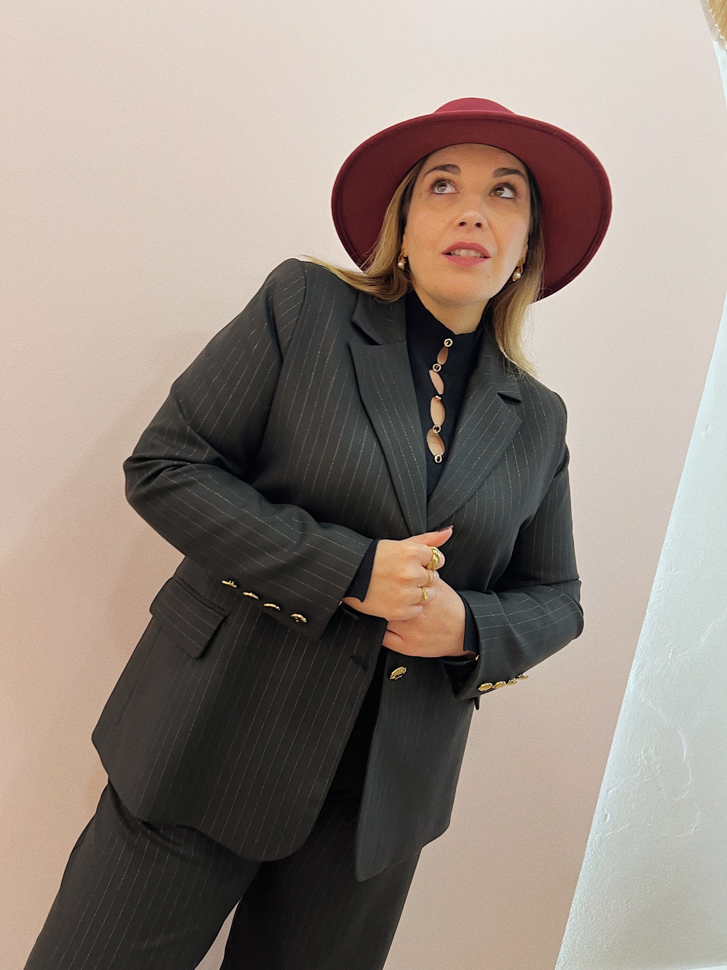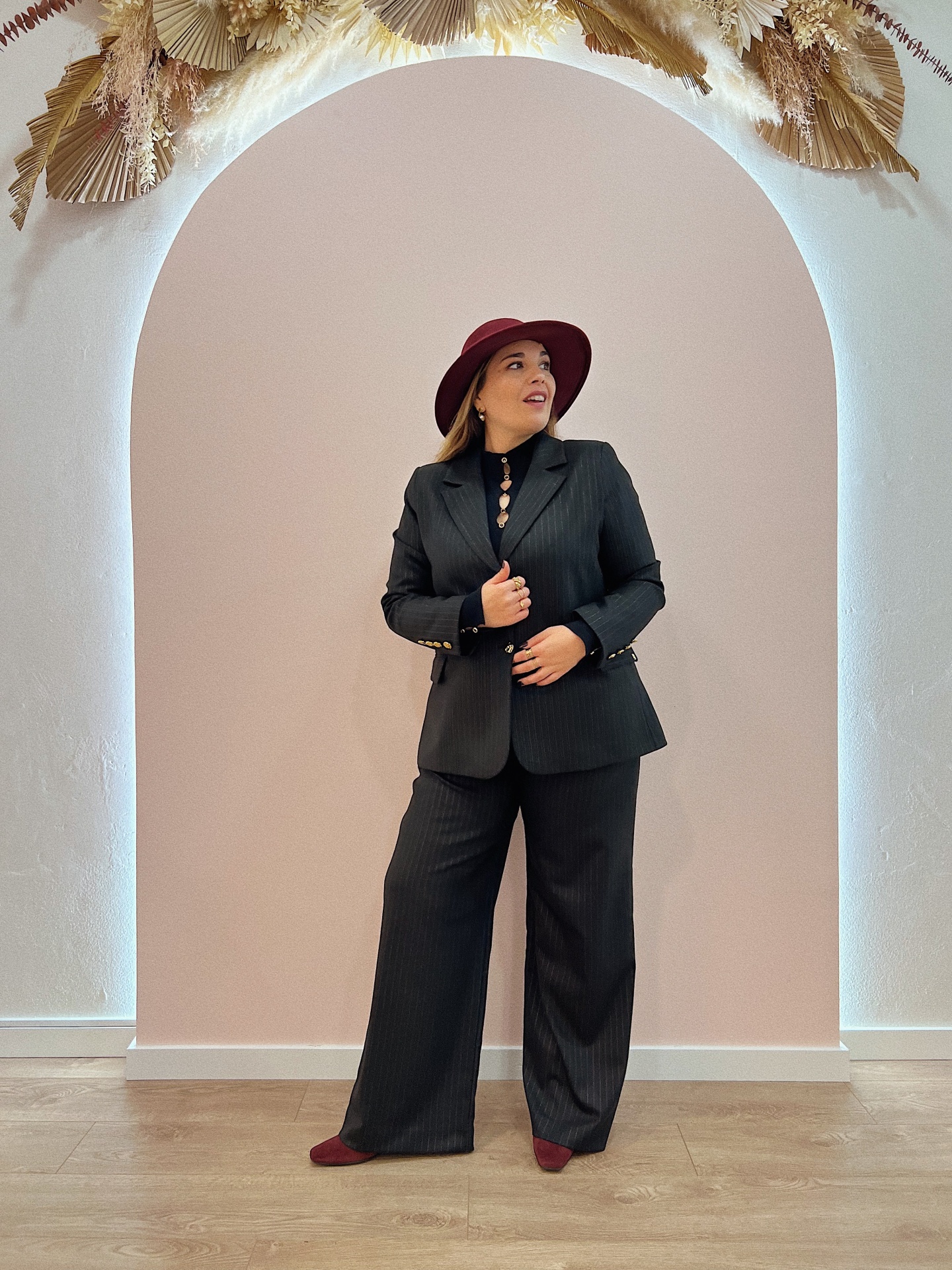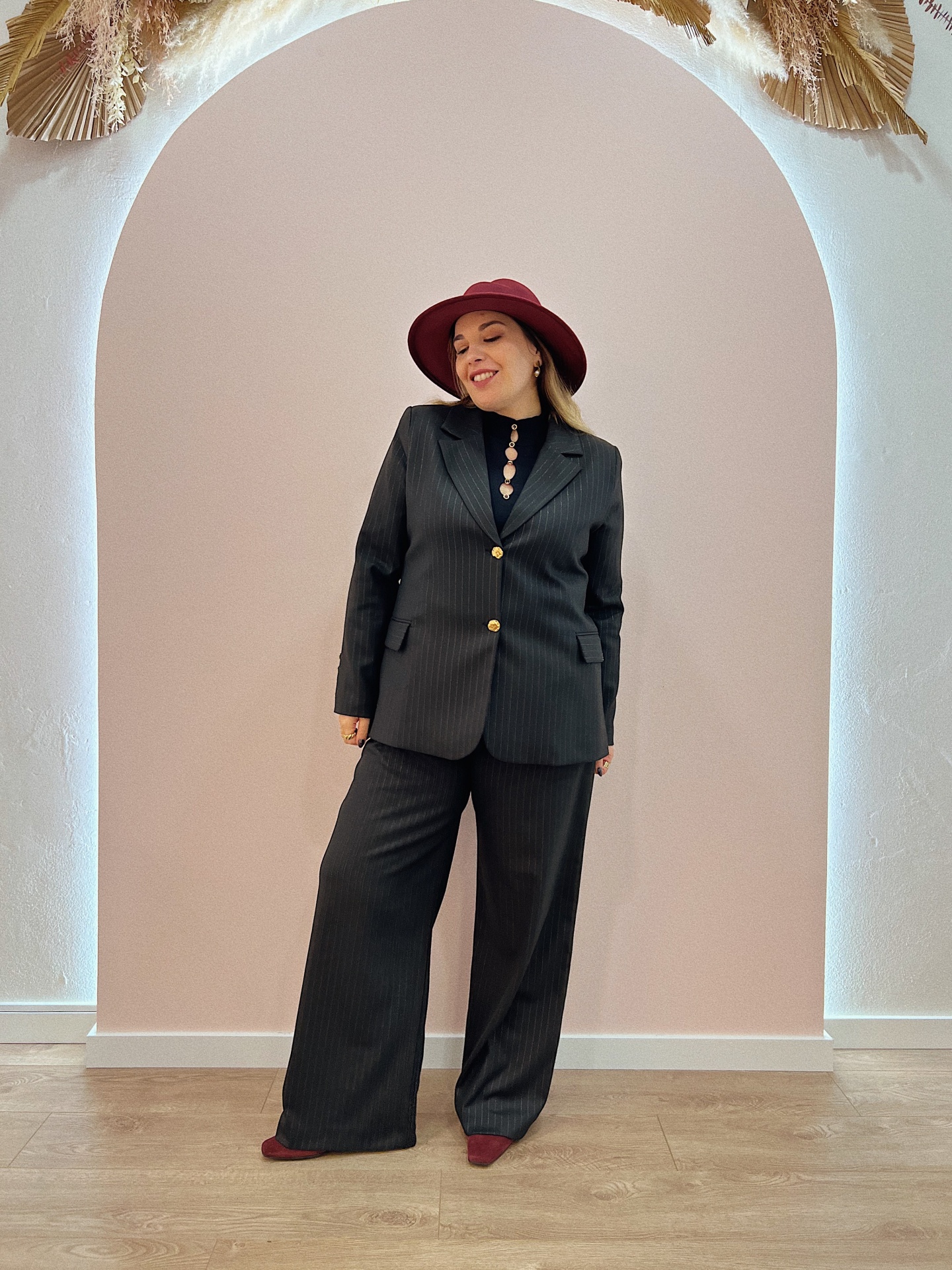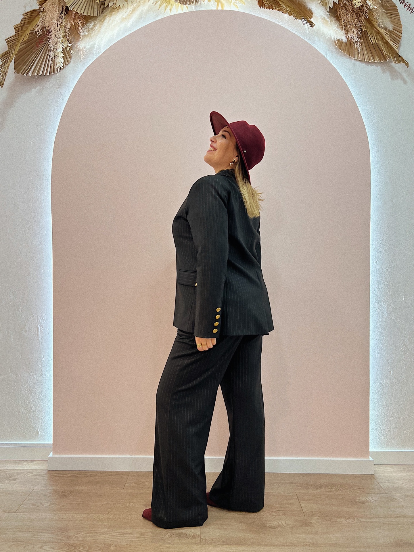 Blazer preto num tecido rico e composto com risca dourada em todo o tecido.