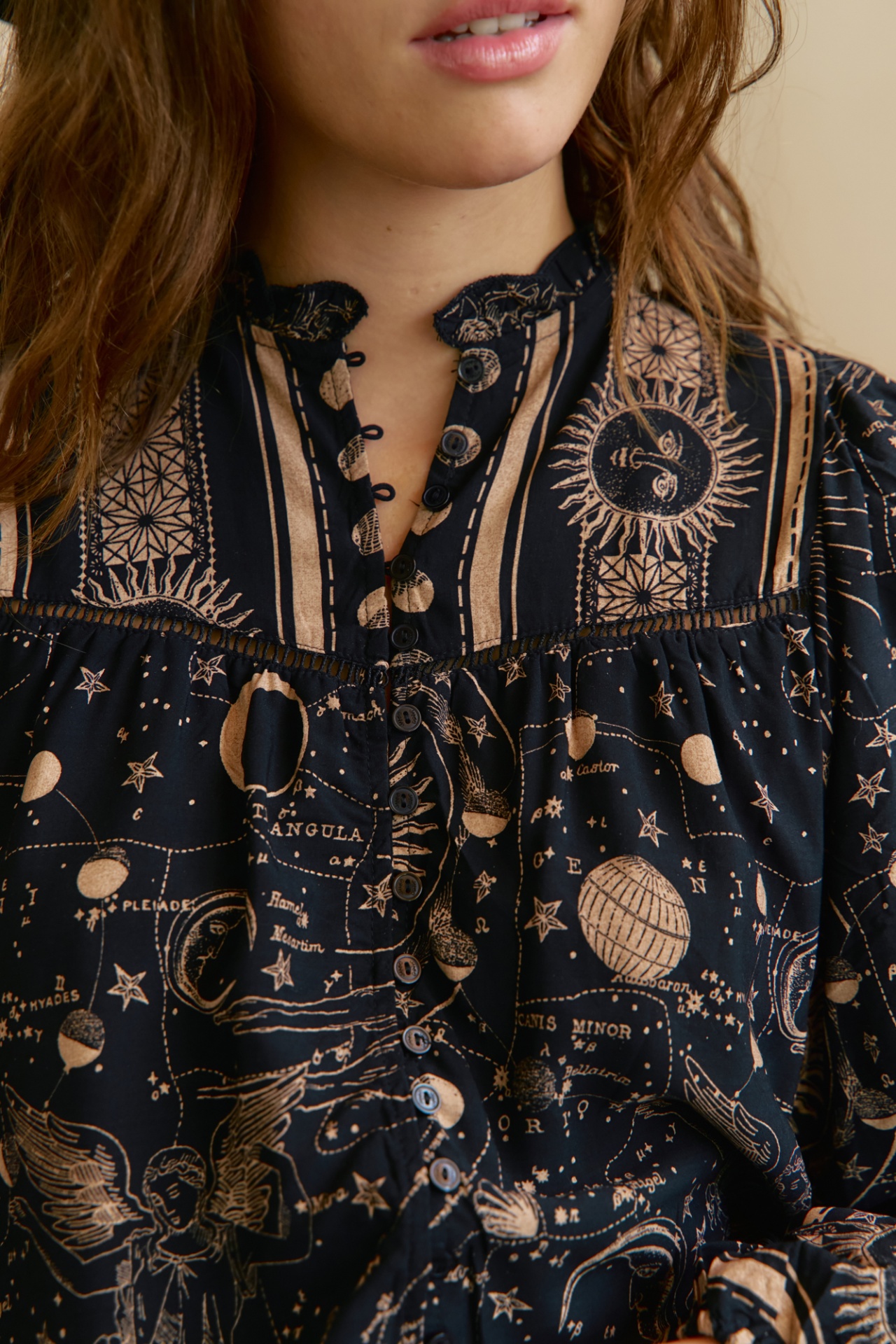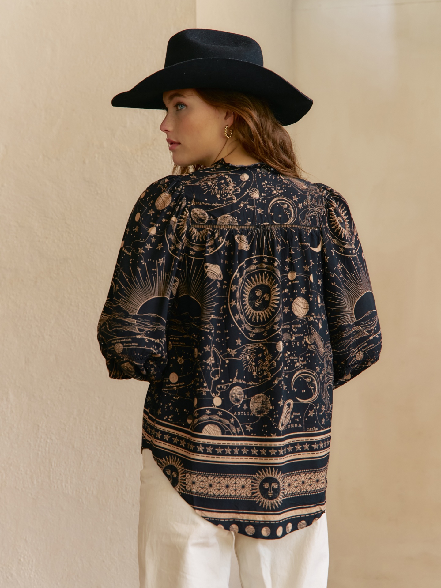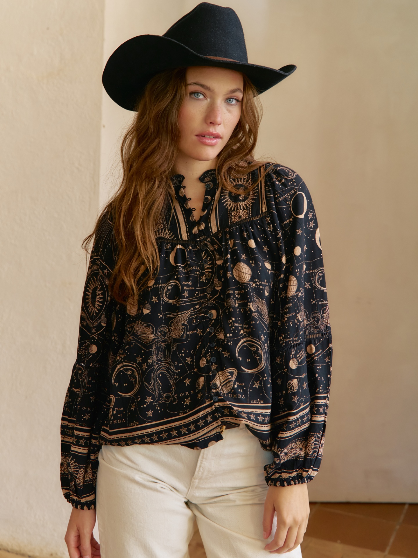 Blusa preta em rayon com padrão místico ilustrado de forma elegante em creme (em contraste).