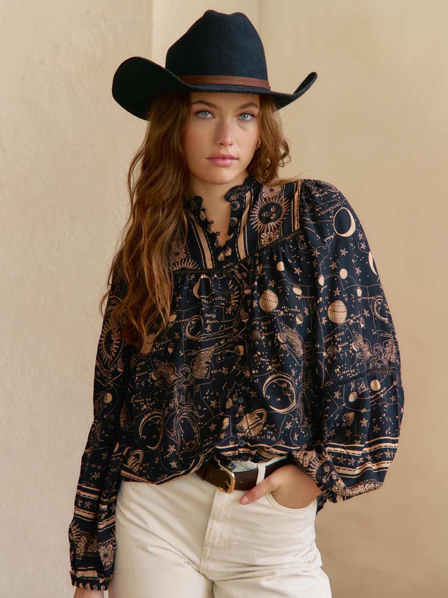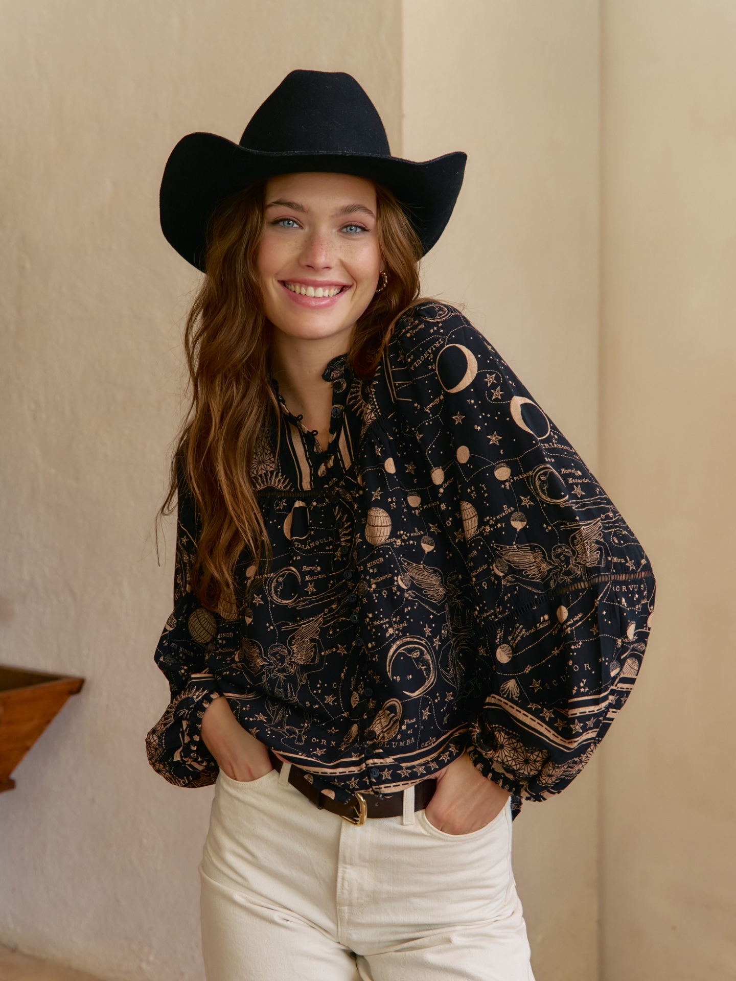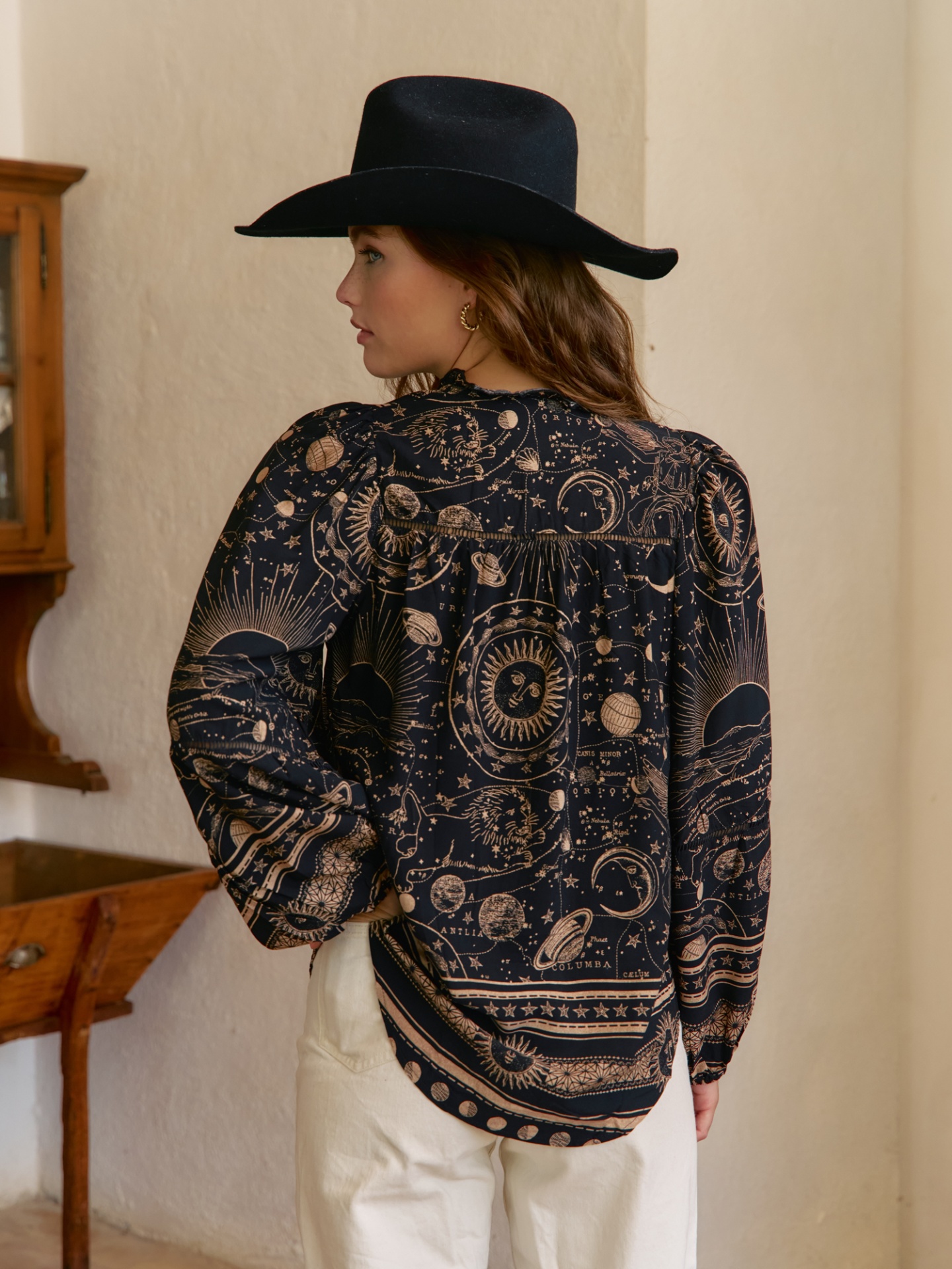 Blusa preta em rayon com padrão místico ilustrado de forma elegante em creme (em contraste).