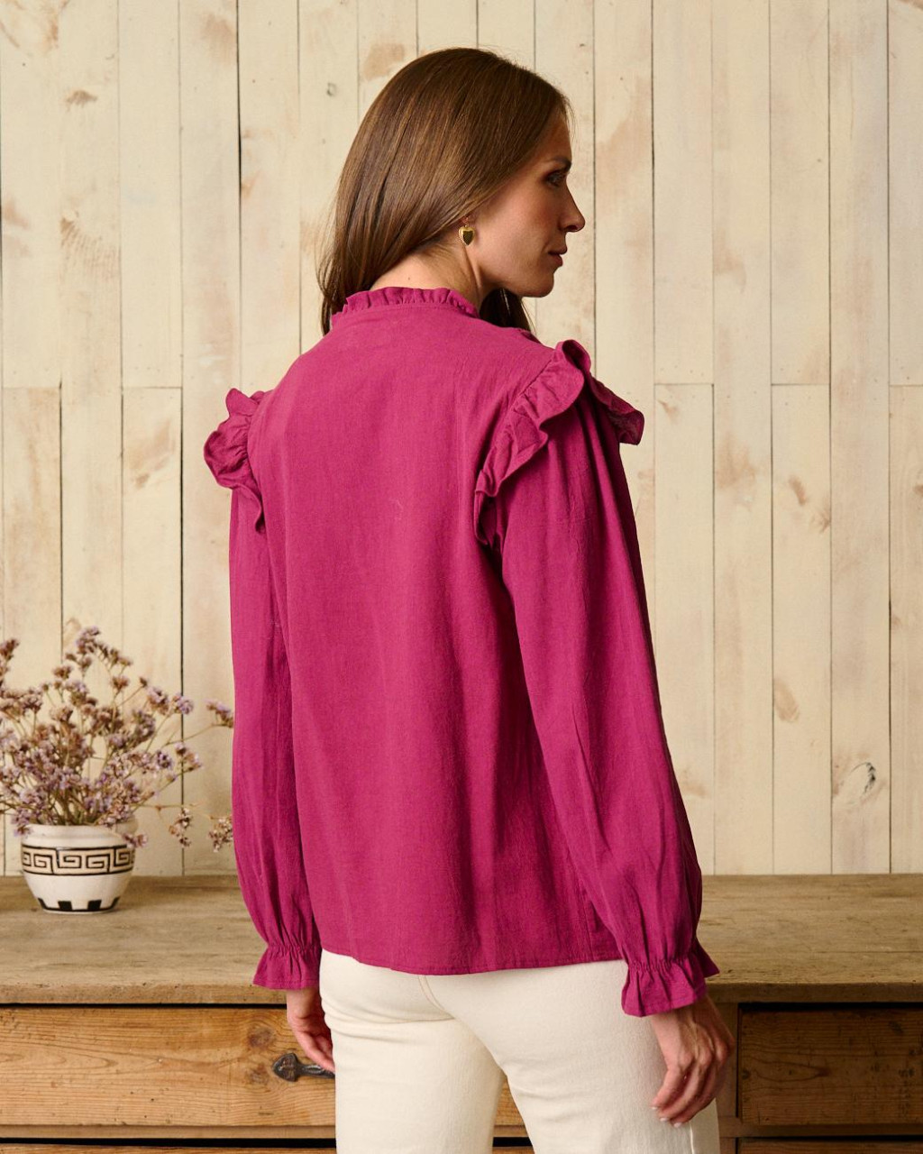Efeito de folhos nos ombros. Mangas compridas com efeito balão no punho e terminação em sino.