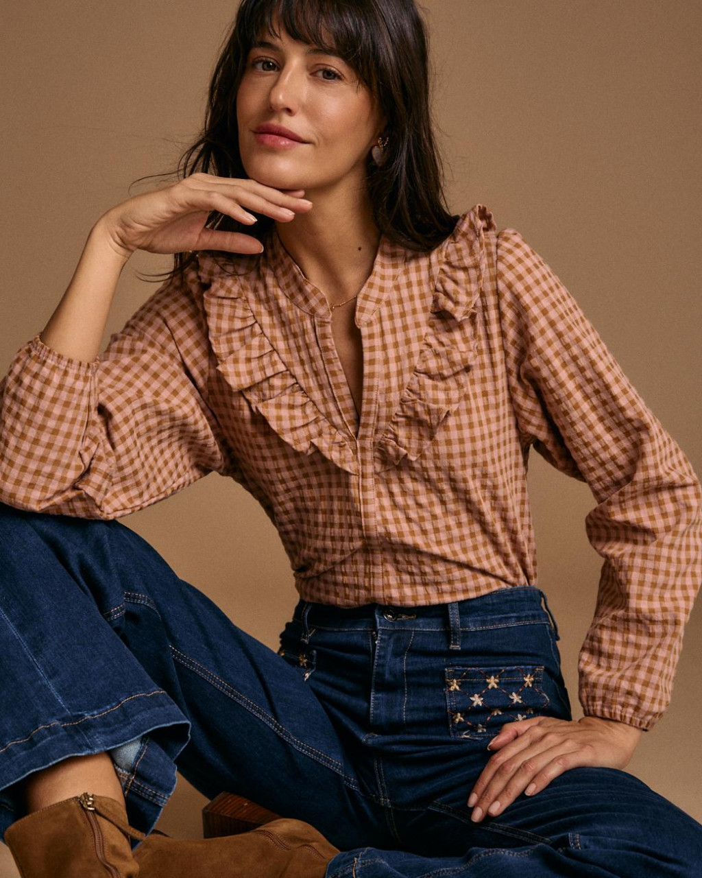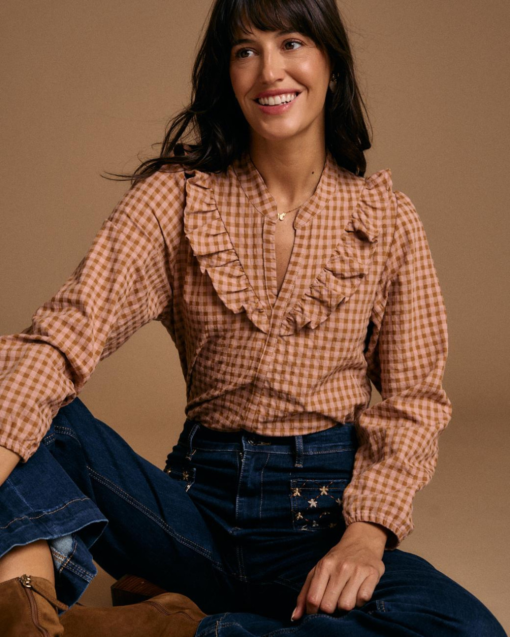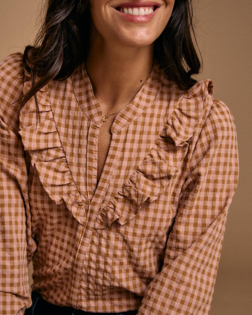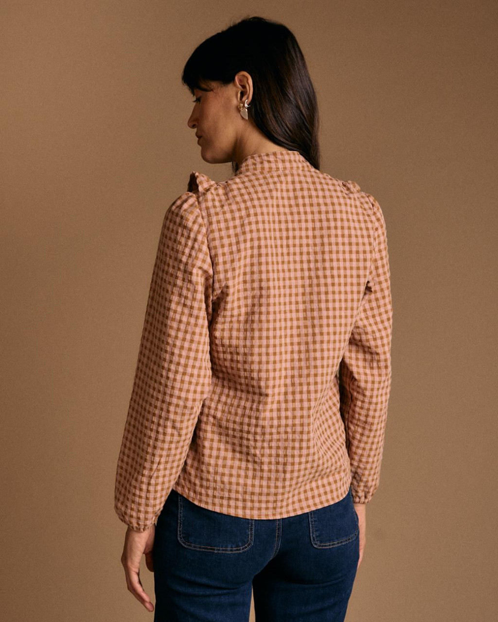 Blusa em padrão Vichy em tons ocre e rosa, em algodão.
