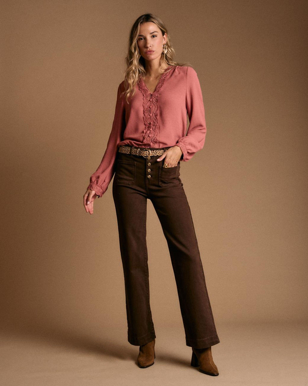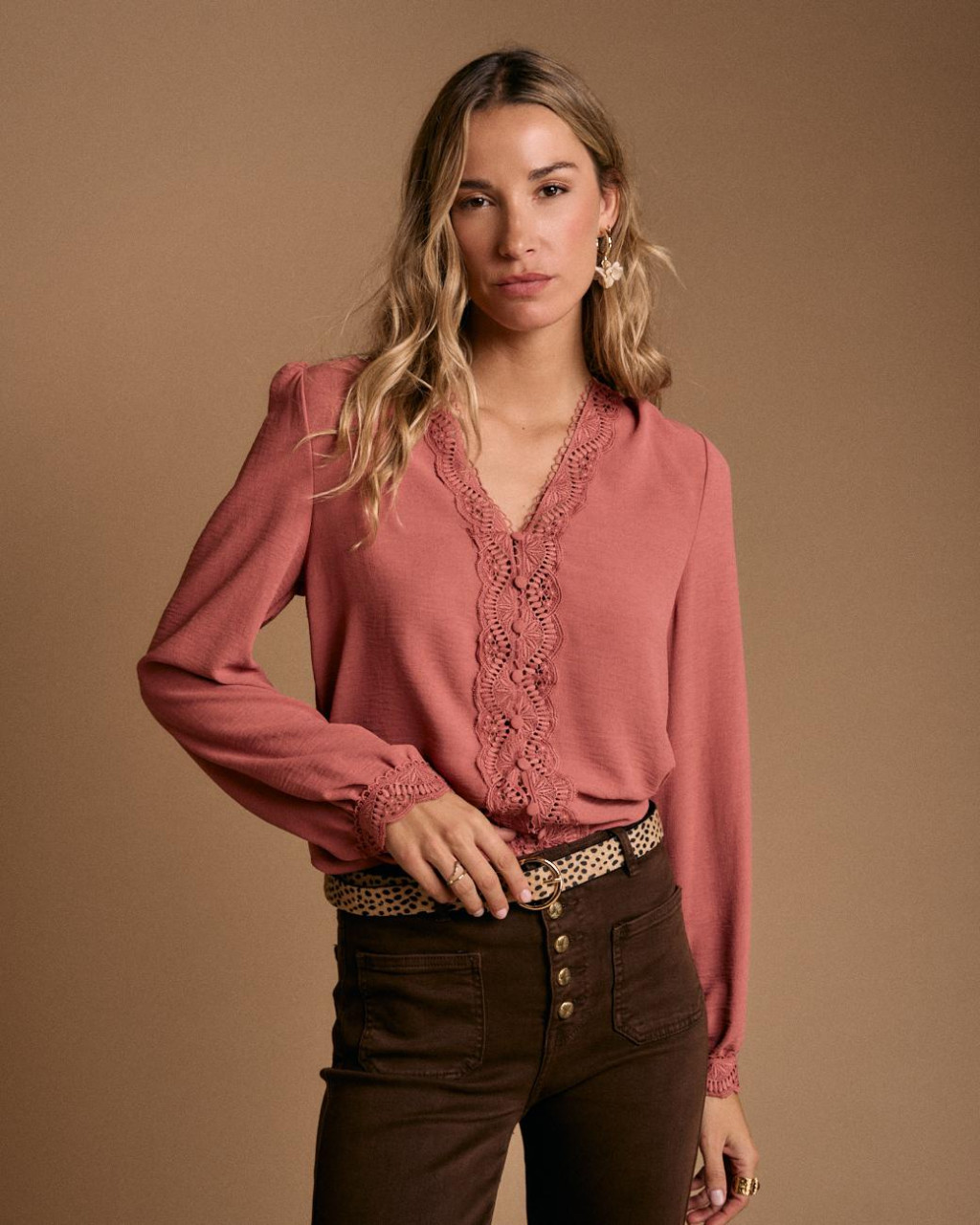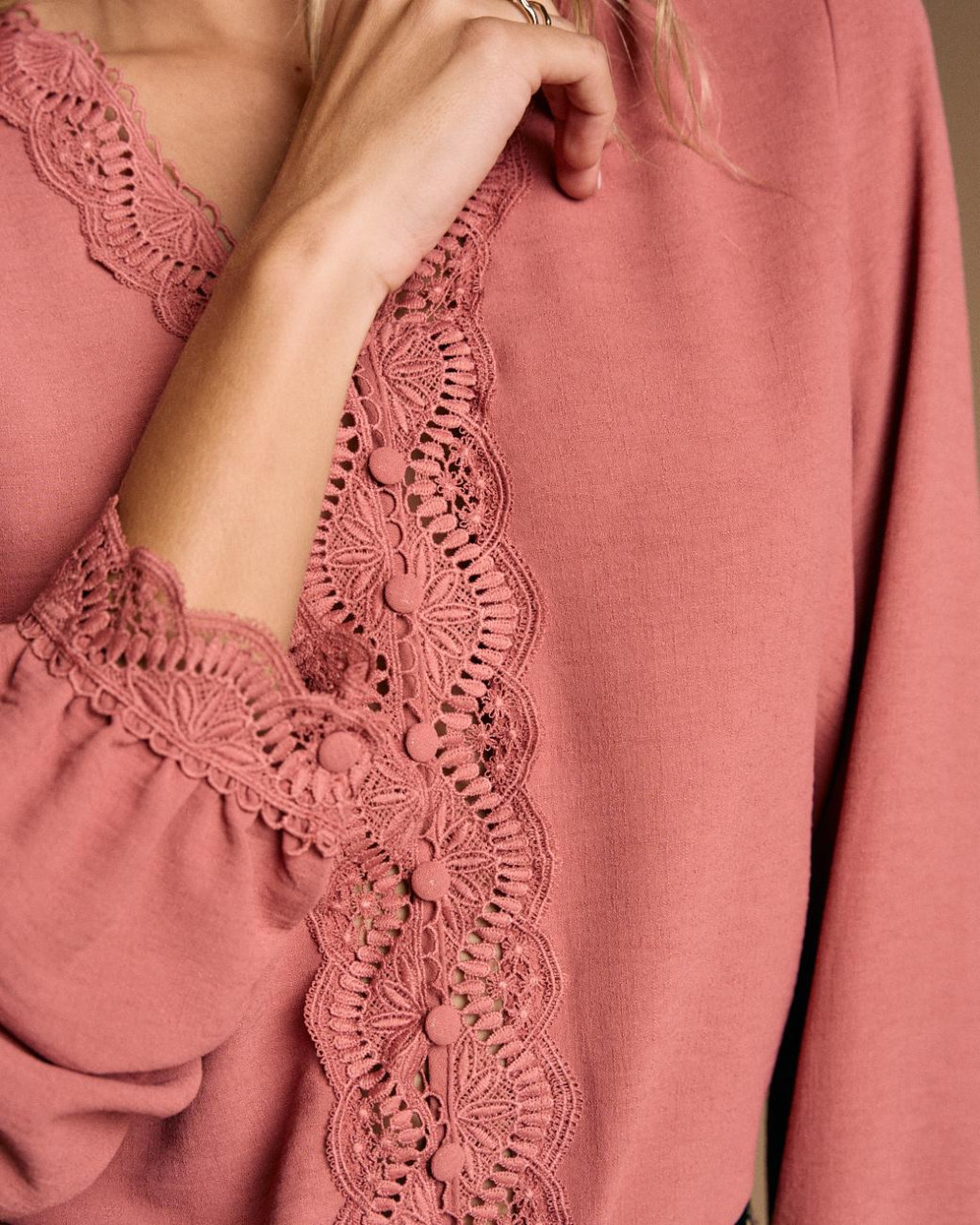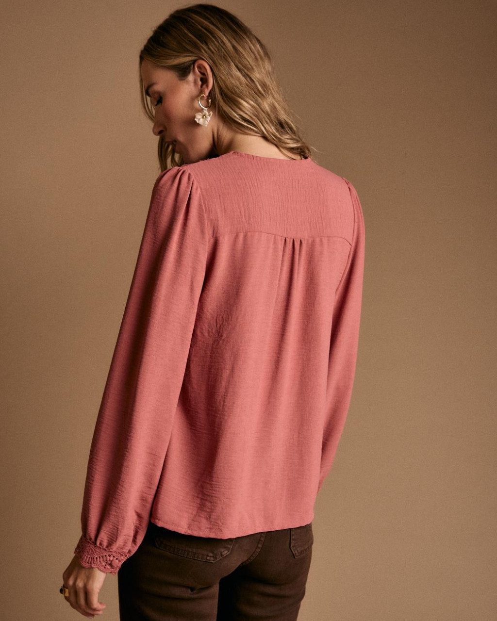 Blusa num delicado tom de cor-de-rosa bem delicada e romântica com um ajuste regular.