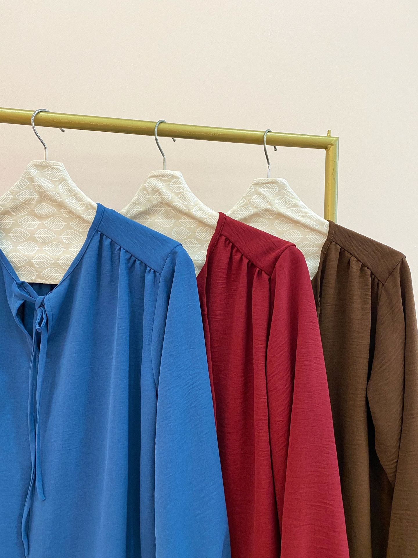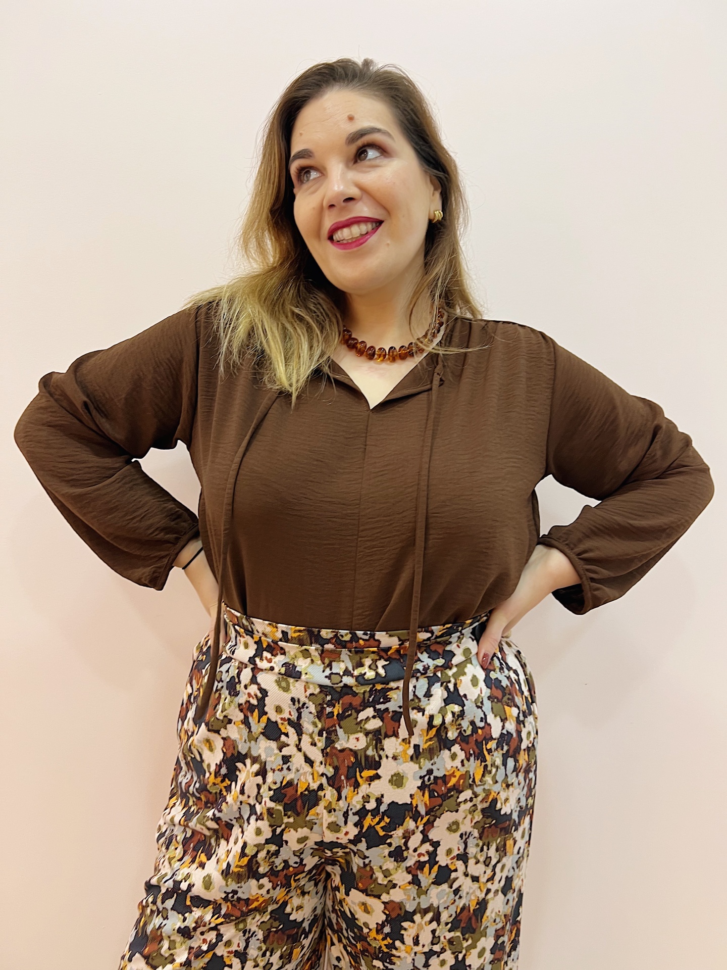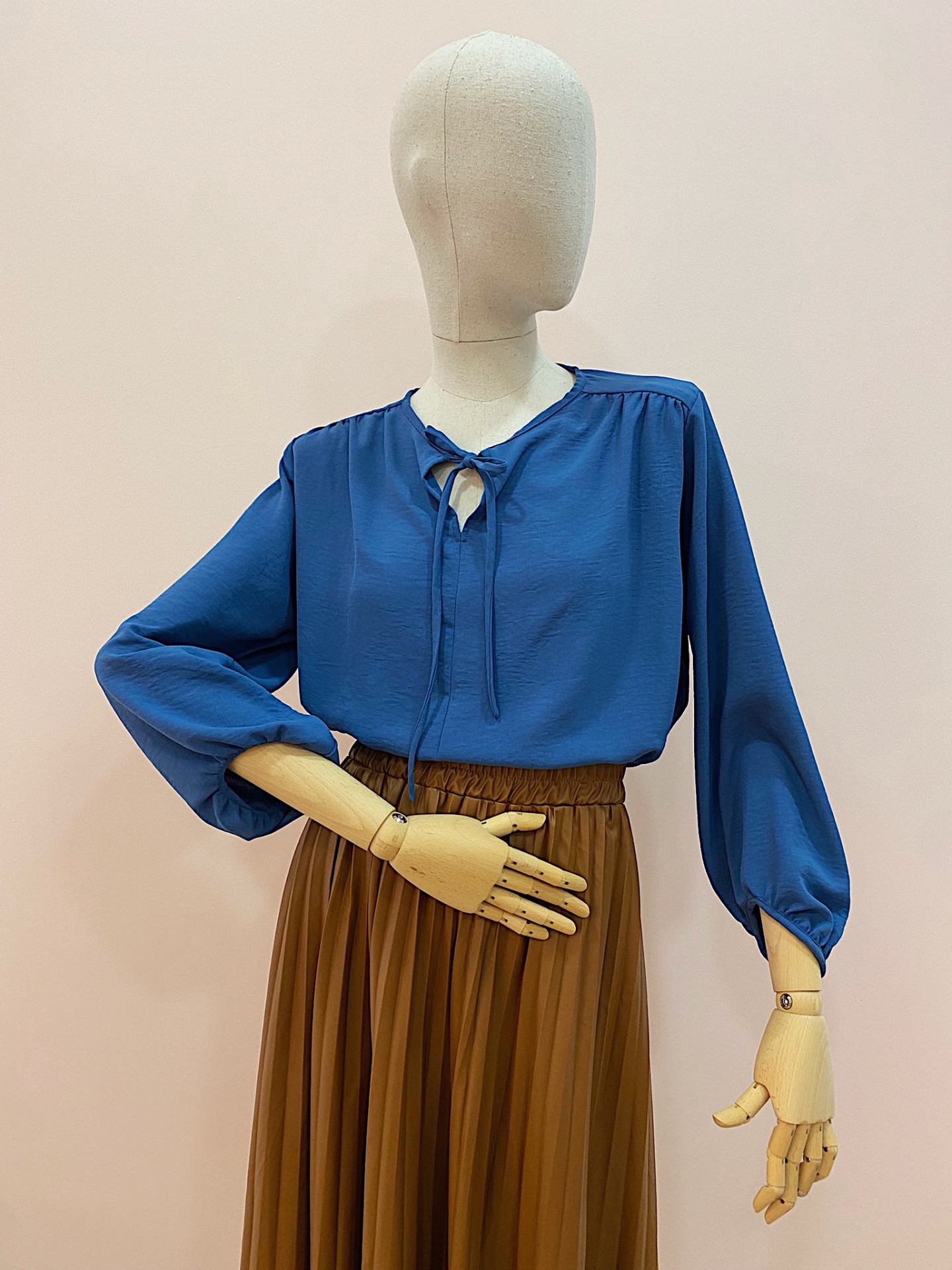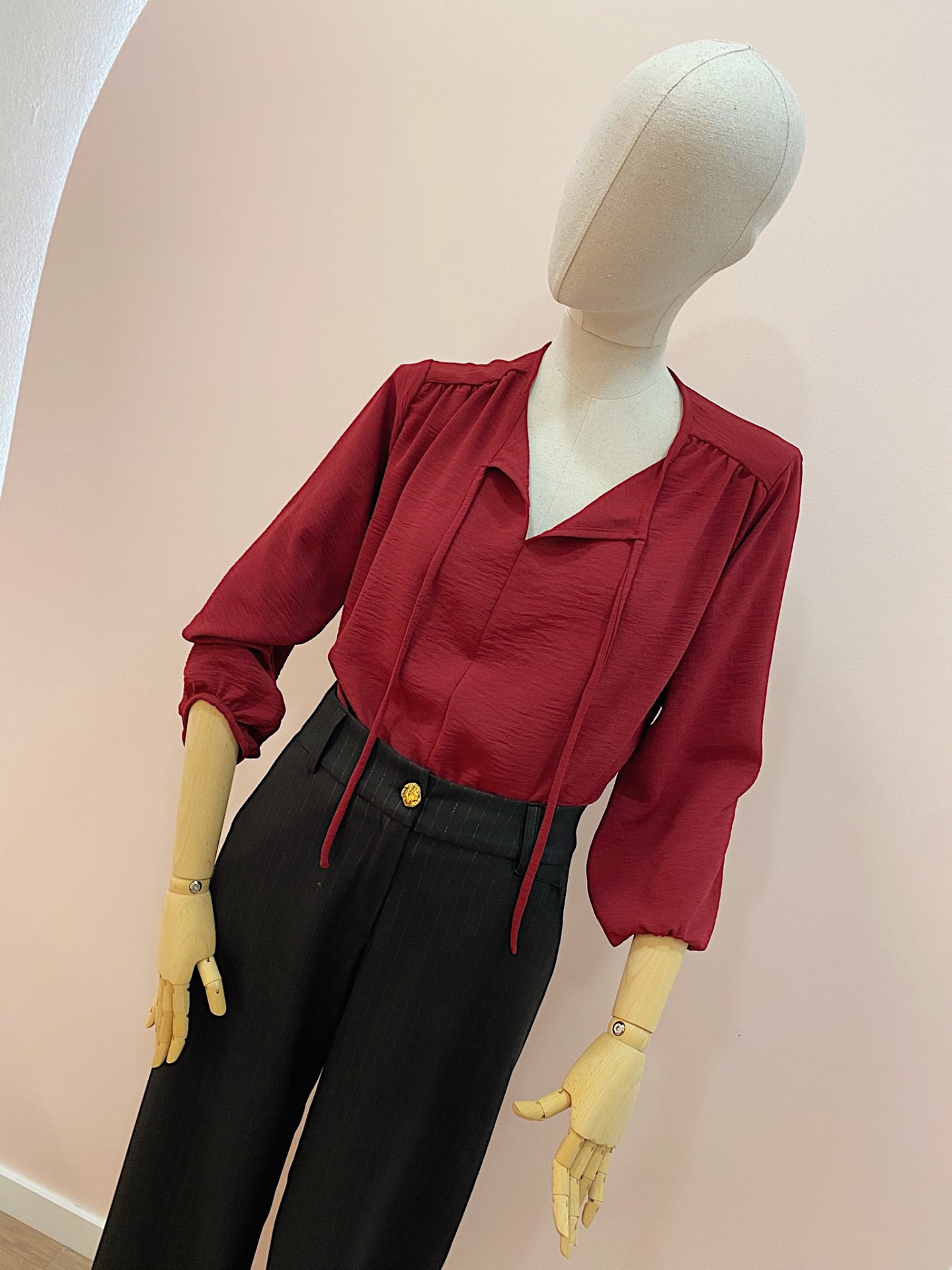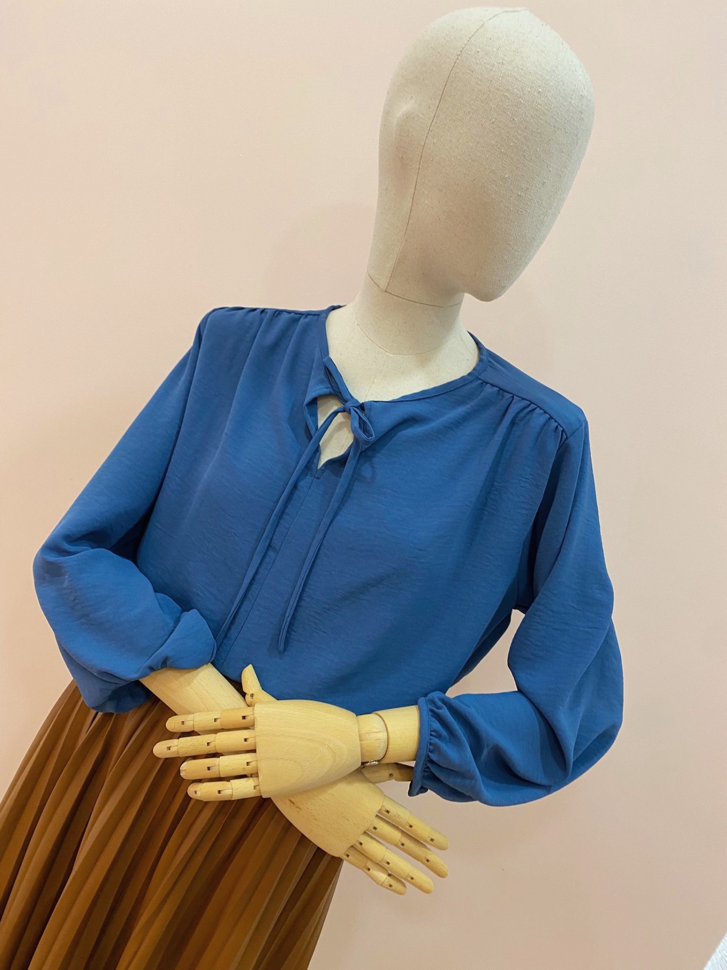 Modelo com decote redondo com efeito em V e atilhos para usar solta ou com laçada.