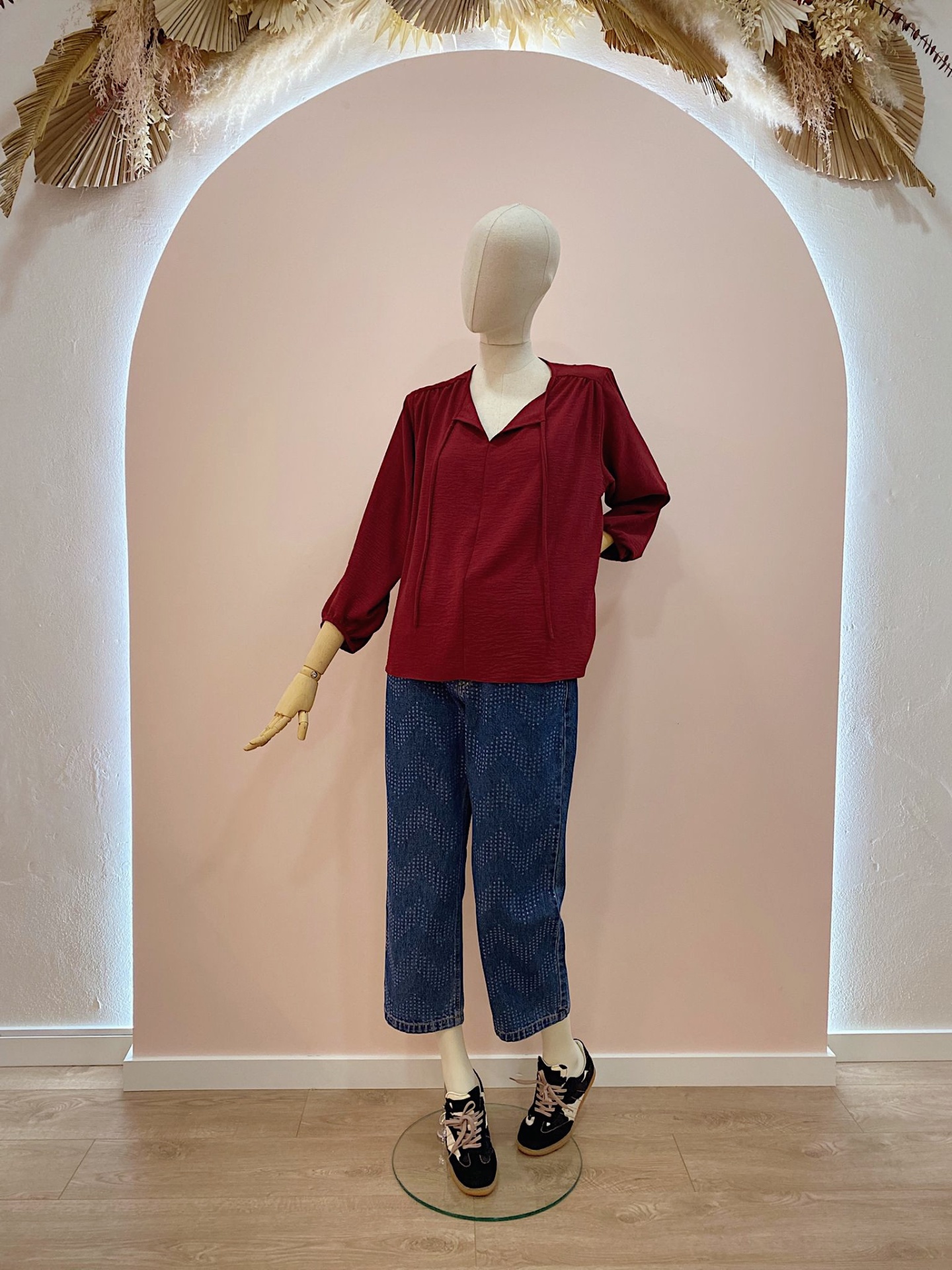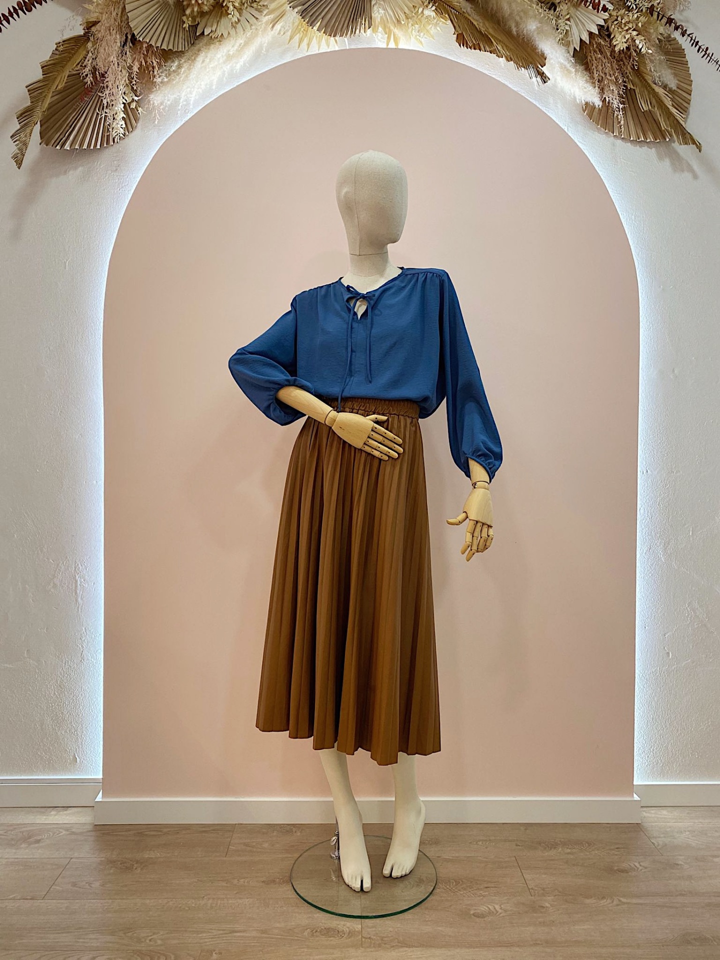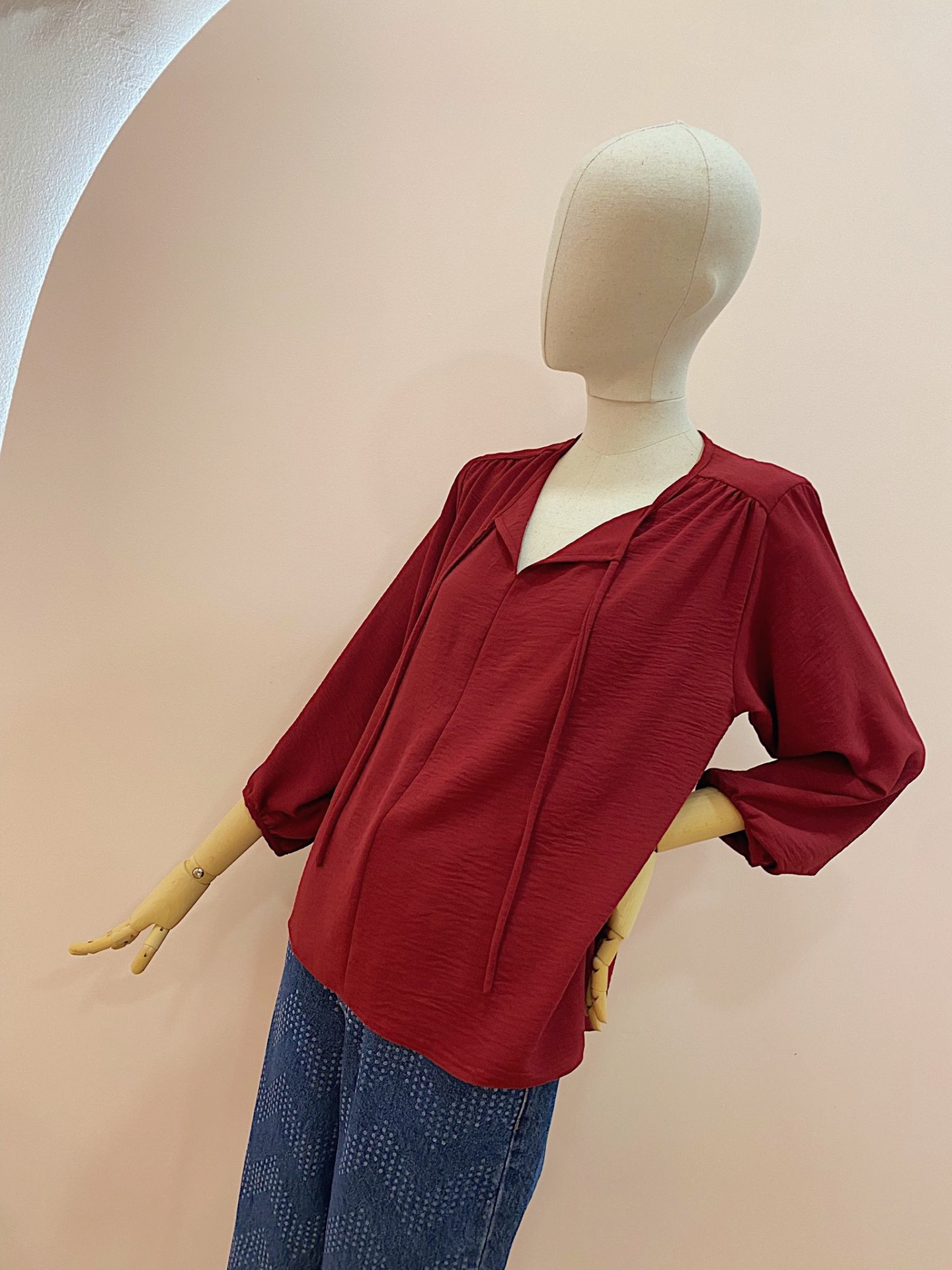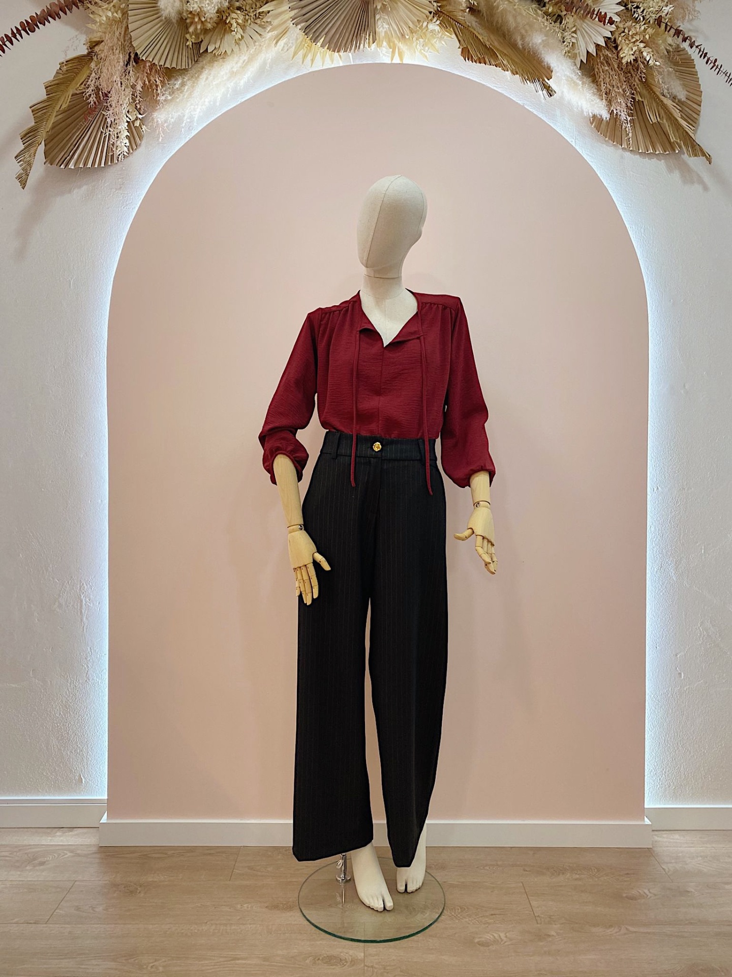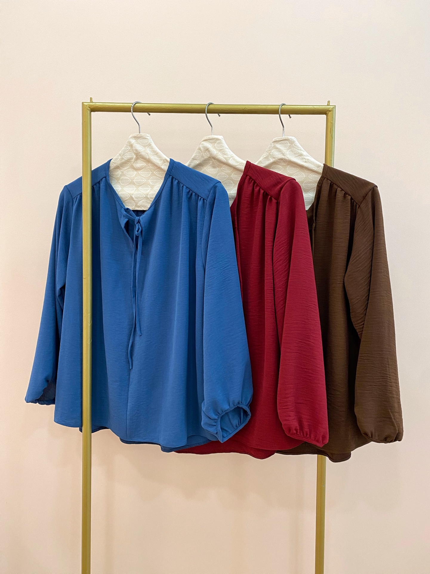 Modelo com decote redondo com efeito em V e atilhos para usar solta ou com laçada.