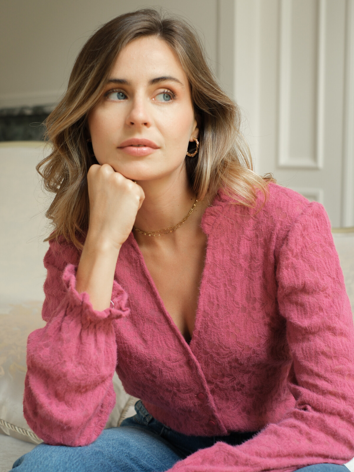 Blusa cor-de-rosa com efeito arrendado em motivos florais.