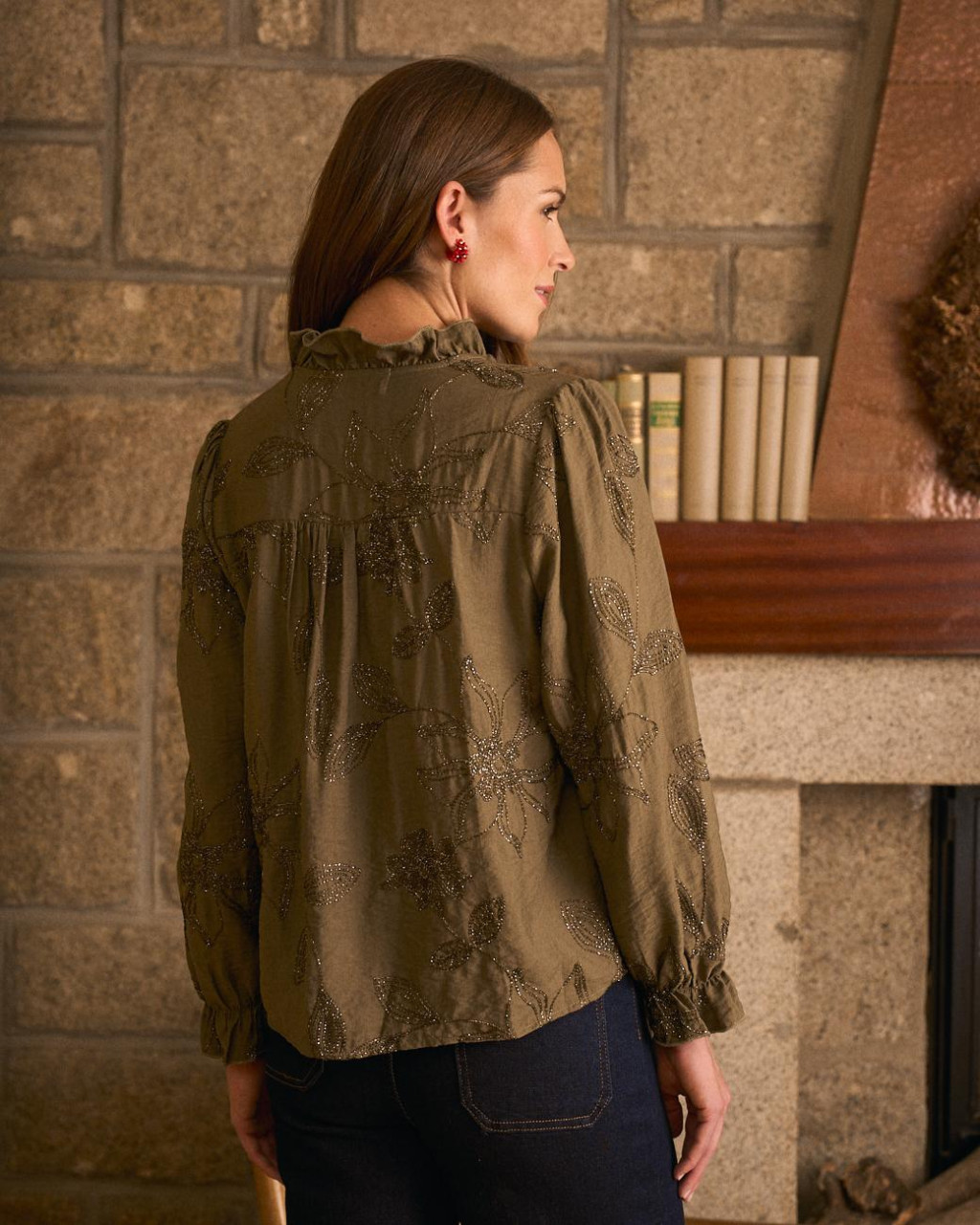 Blusa verde khaki com bordados florais em linha verde e lurex (brilho).