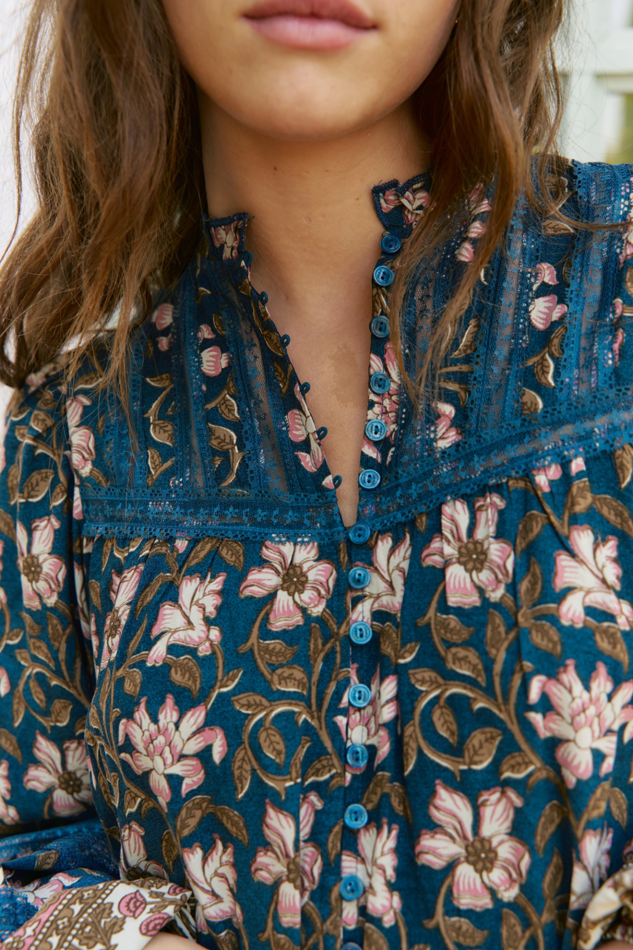 Modelo com ajuste solto, com decote redondo com mini-folho e efeito de renda azul.