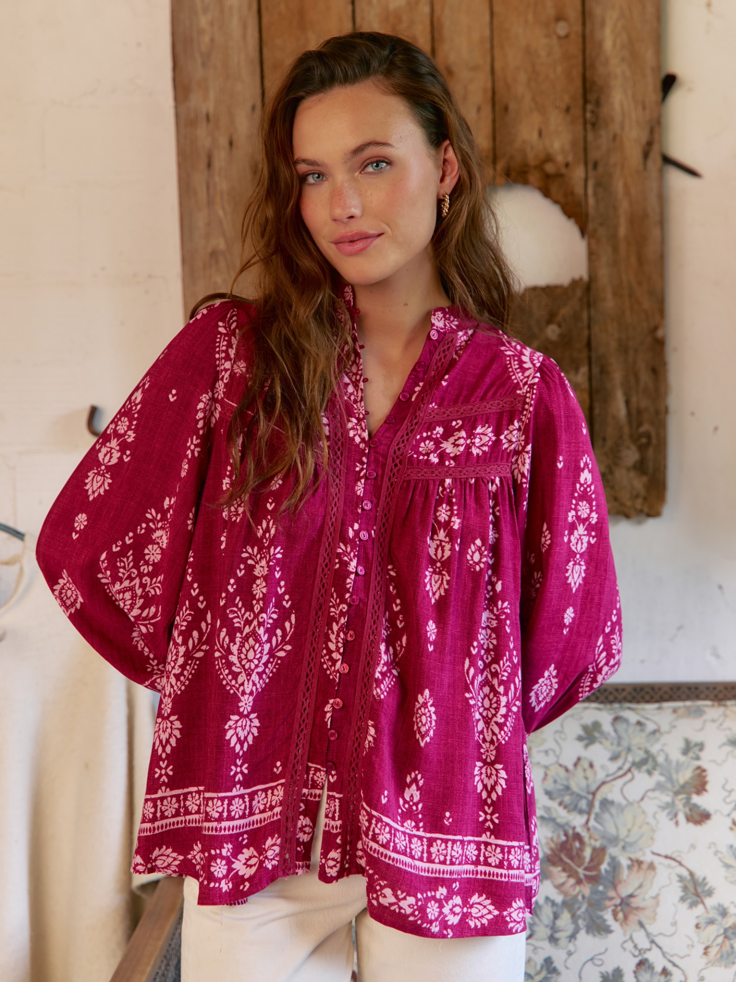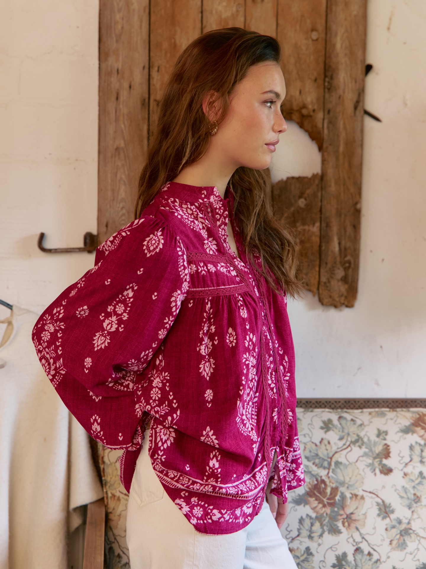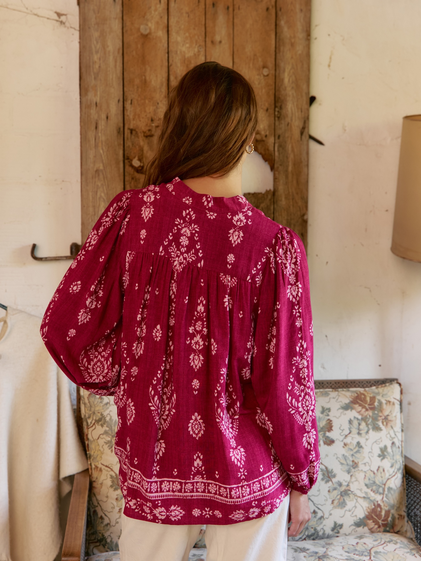 Blusa de inspiração bohemia em tons de beterraba com padrão jacquard em rosa.