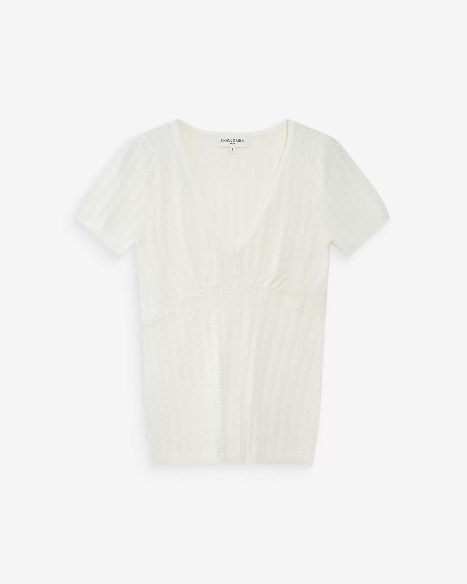 Decote em V, efeito abaixo do peito. Mangas curtas.