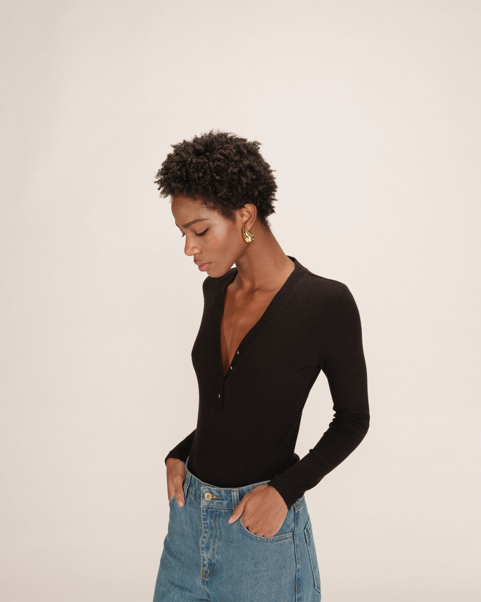 Extremamente confortável e macio. Decote em V com botões dourados à frente.