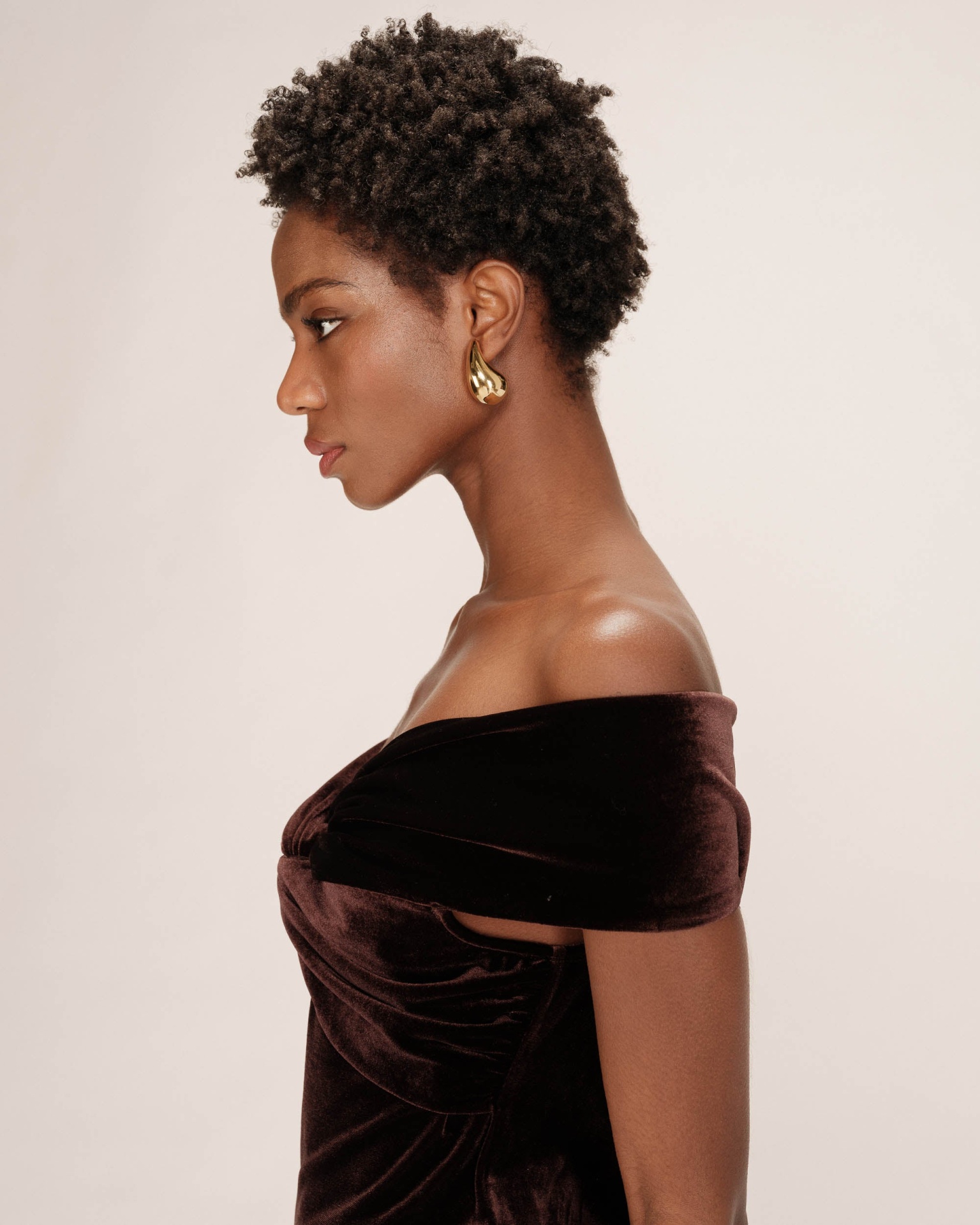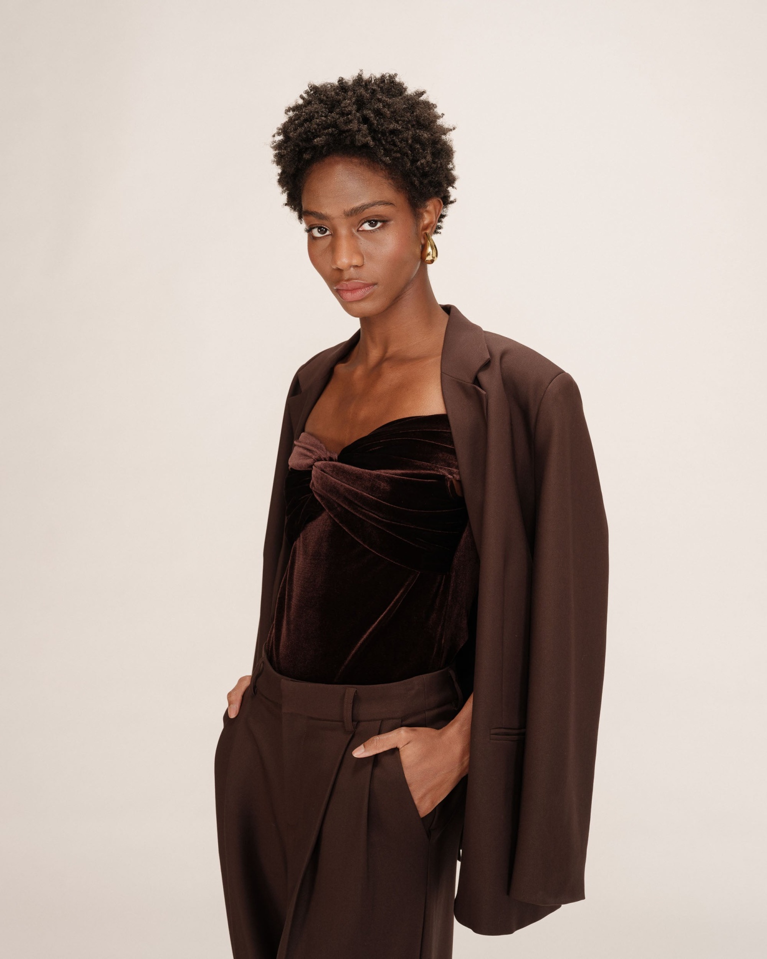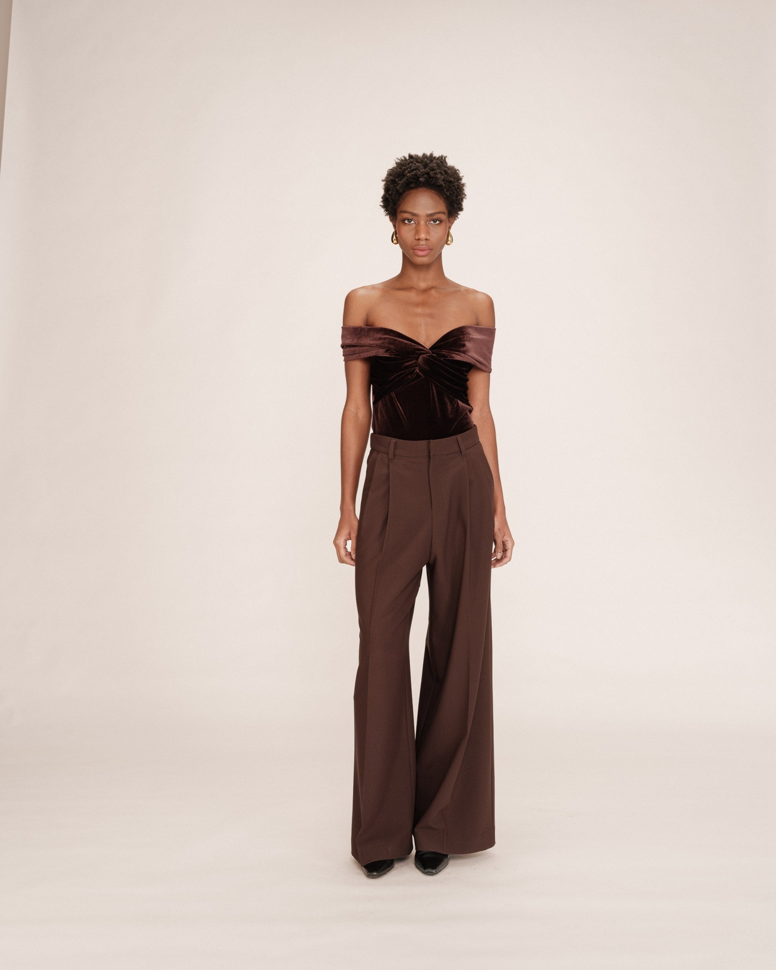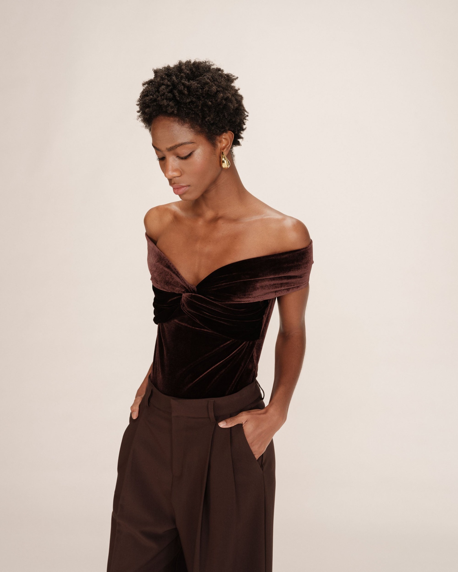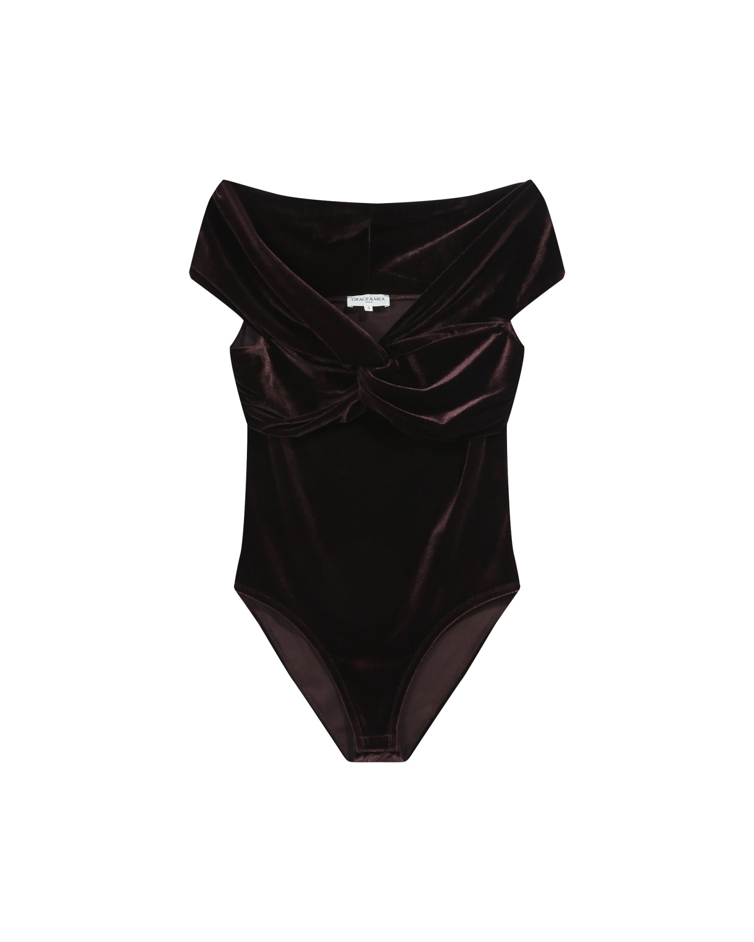 Body em veludo castanho com corte feminino, elegante e Festivo.