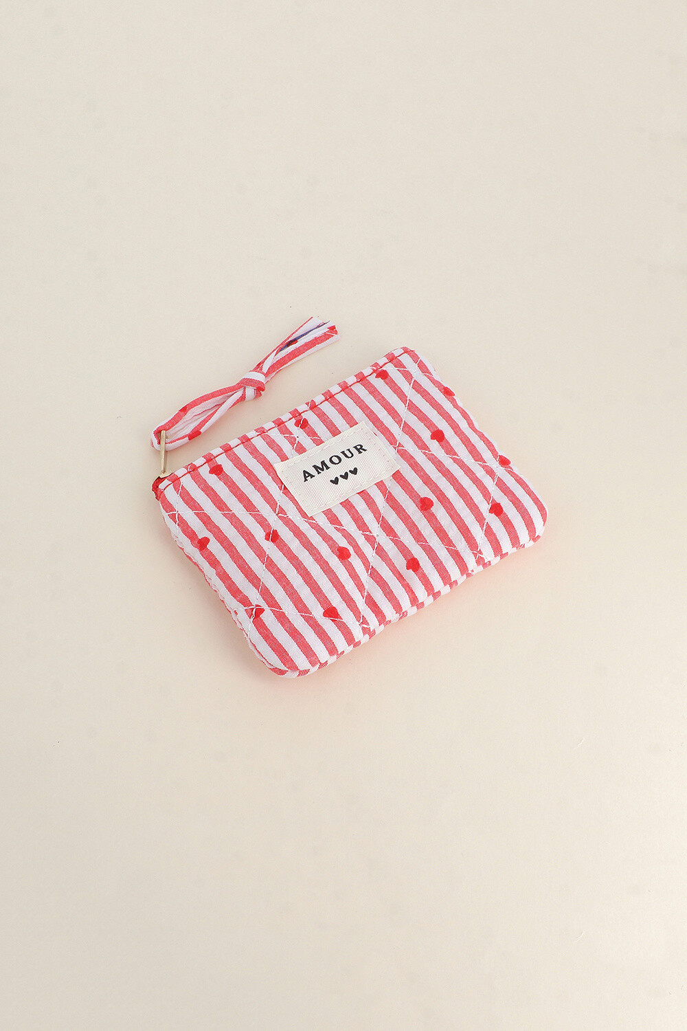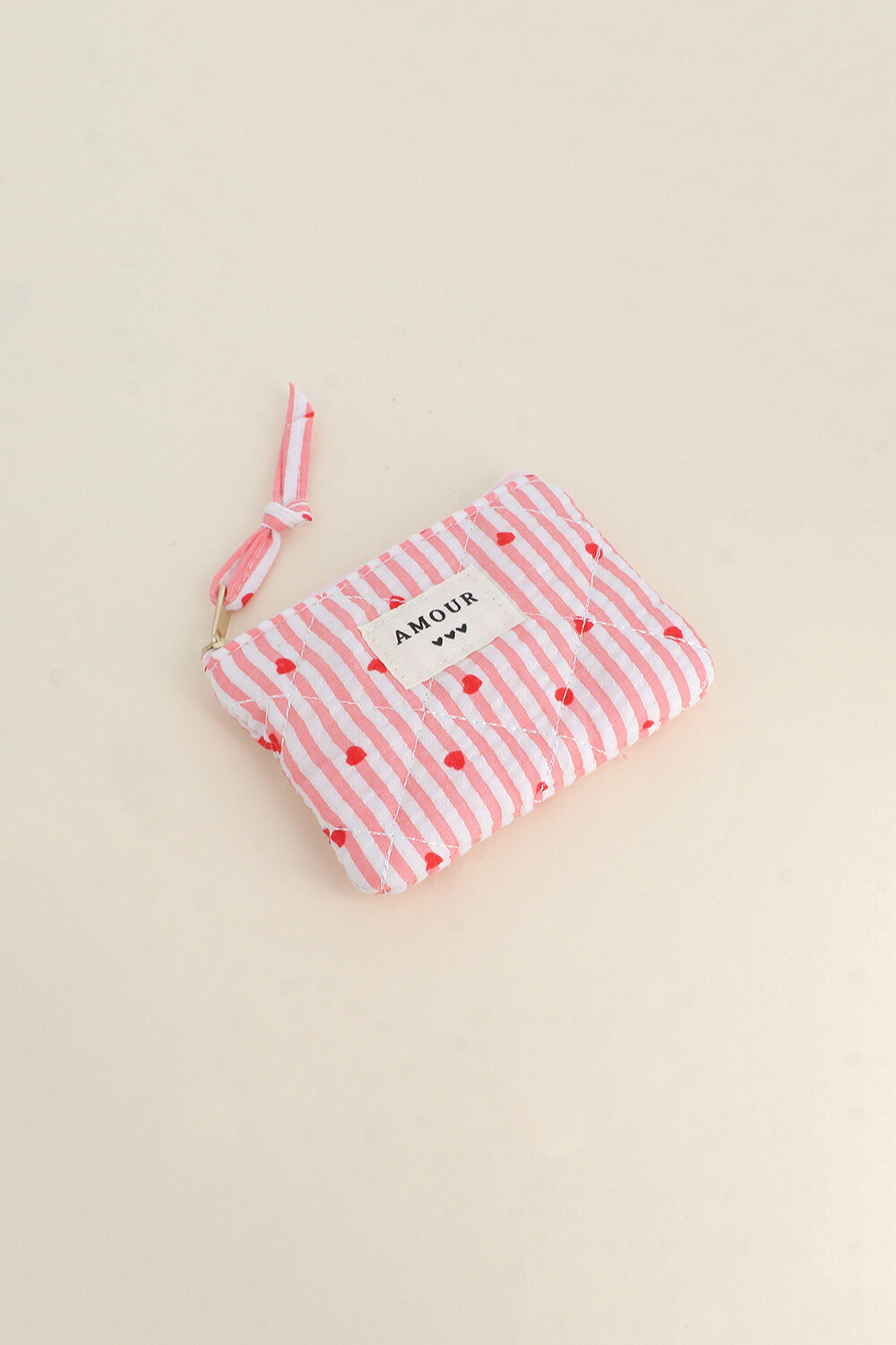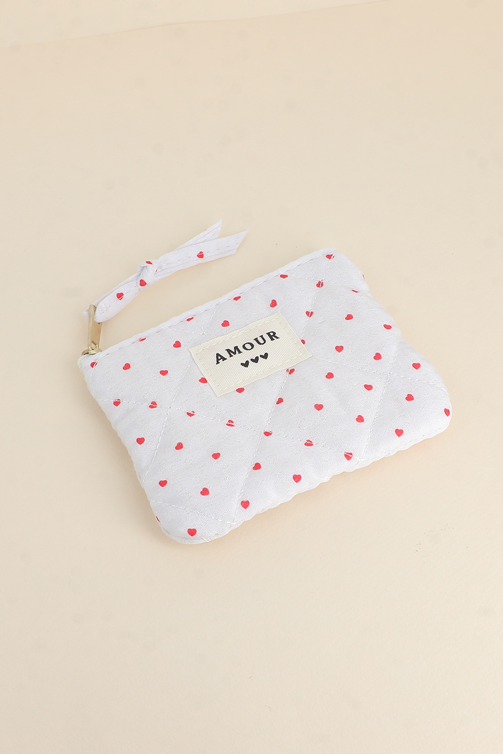Bolsa pequenina estilo Porta-moedas em tecido com mini-corações com efeito acolchoado.