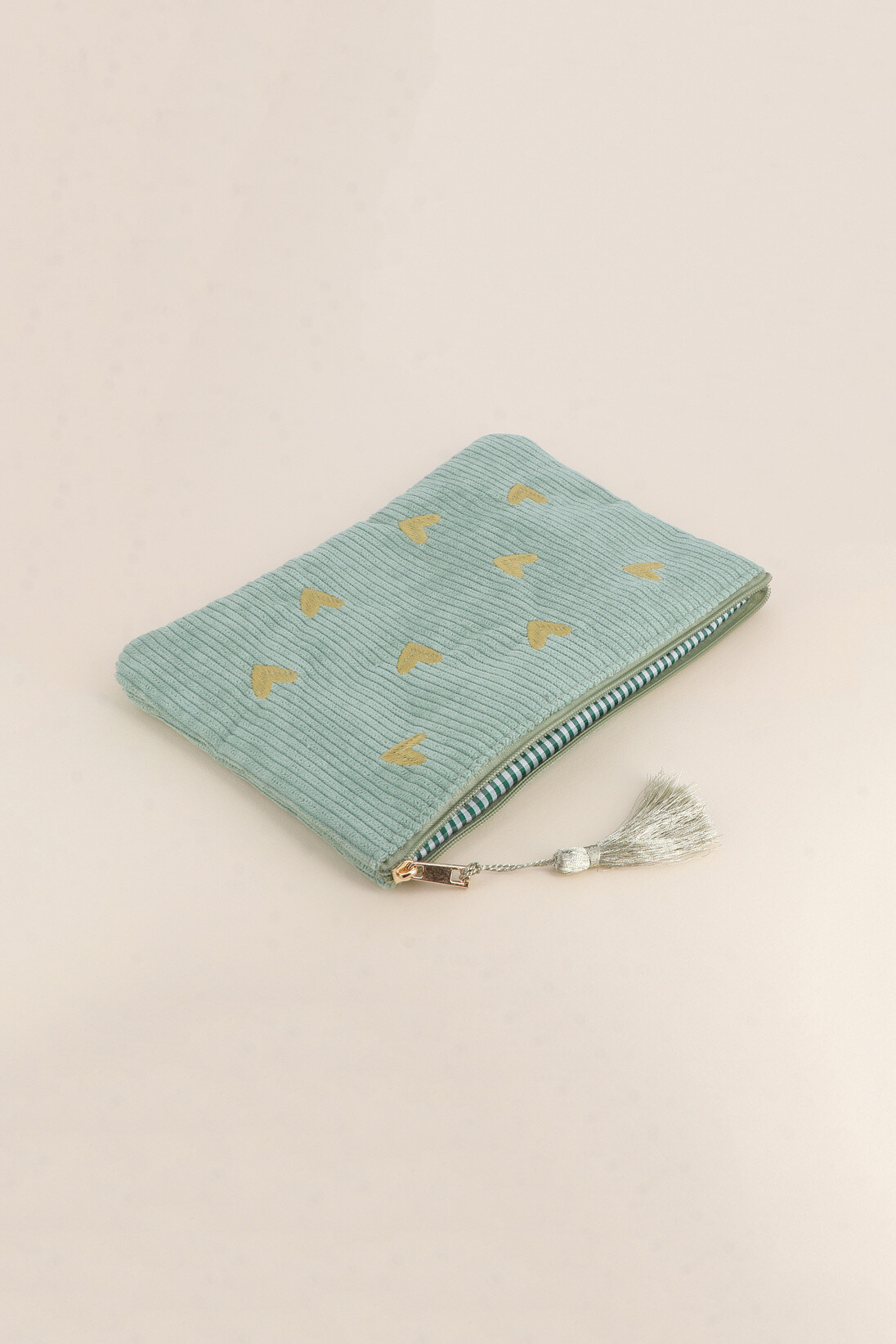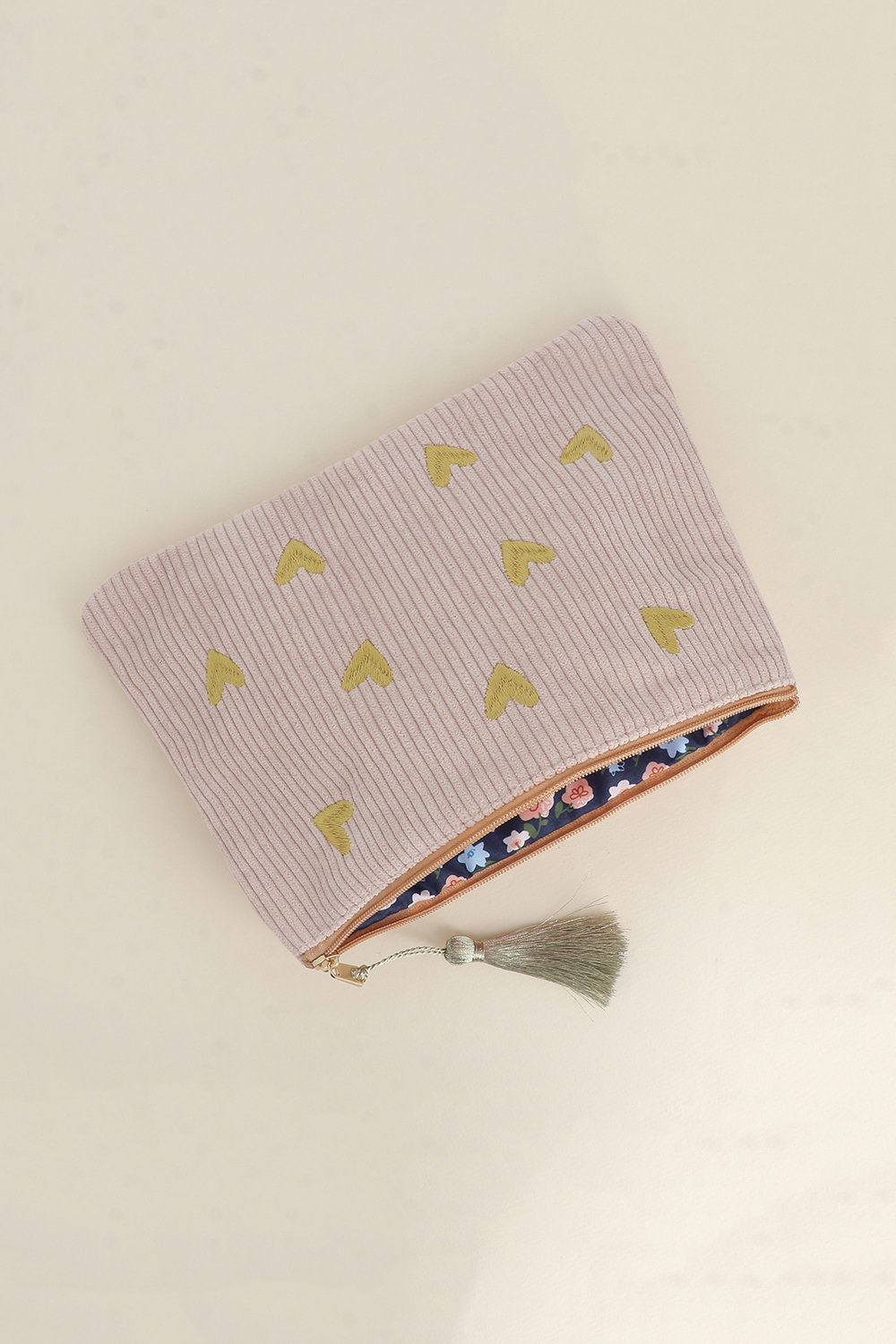 Bolsinha de bombazine com corações bordados a dourado.