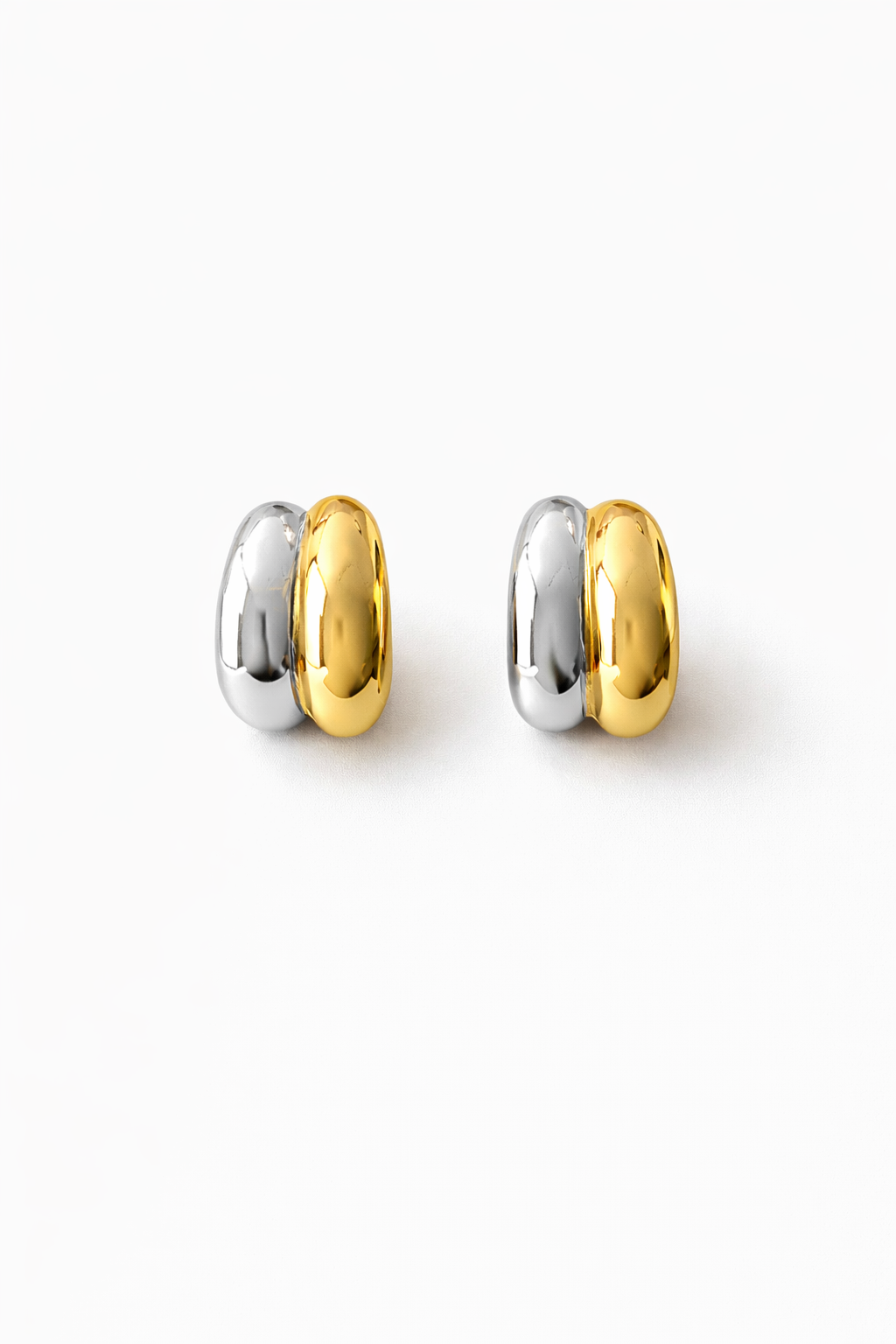 Brincos pequeninos em imitação de duas argolas com as duas cores: prata/ouro.