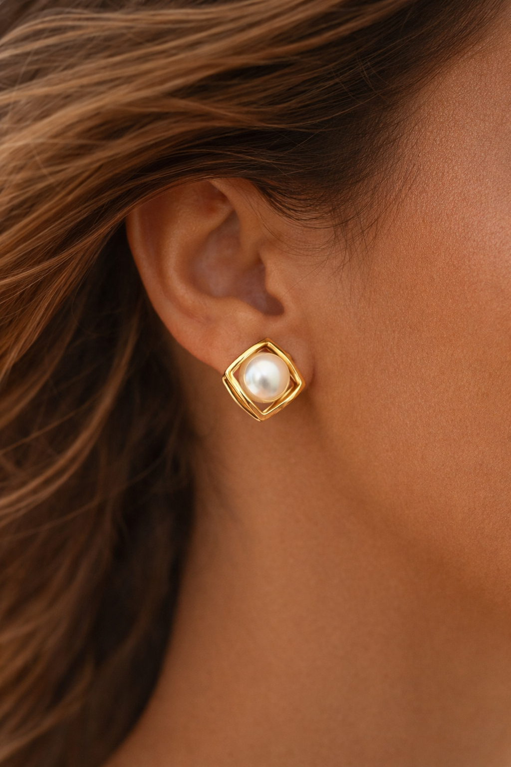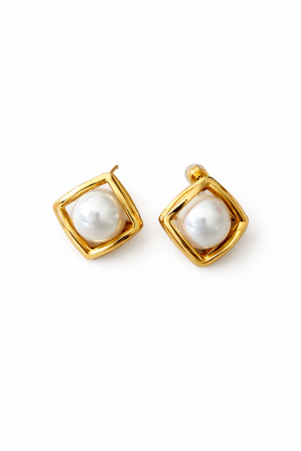 brincos em aço dourado com efeito quadrado e pérola ao centro.
