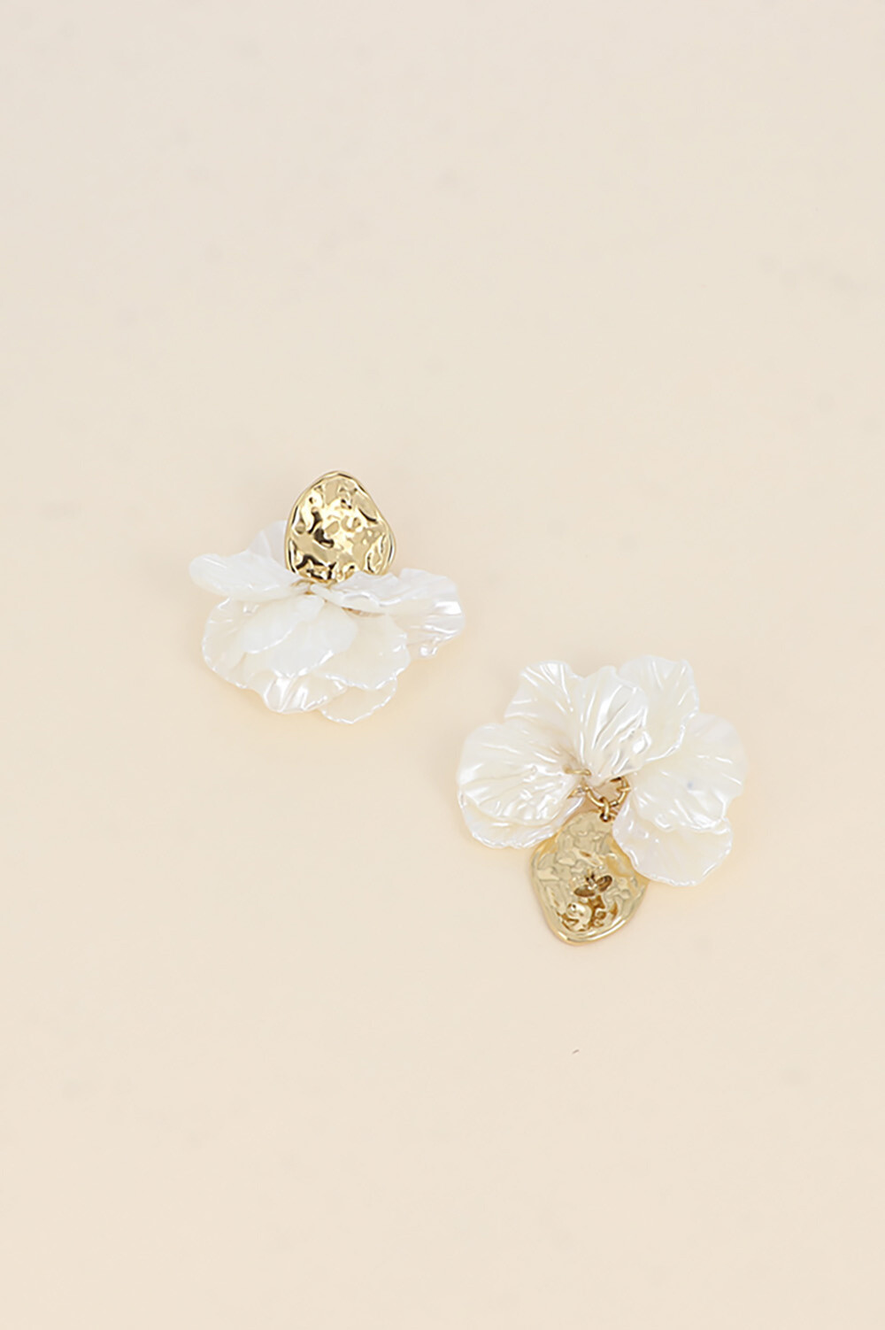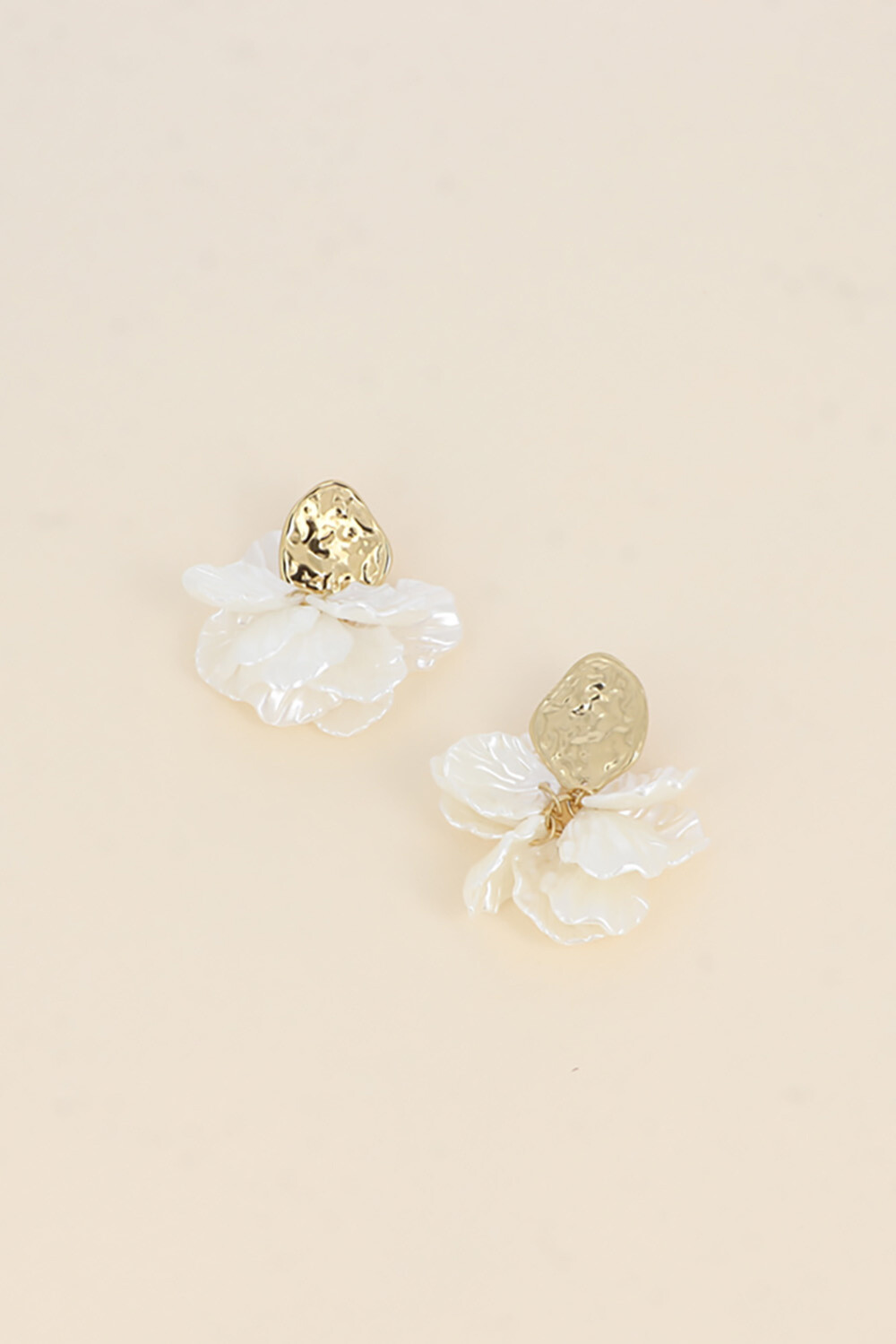 Brincos em aço dourado com pendente de pétalas de flor em resina branca.