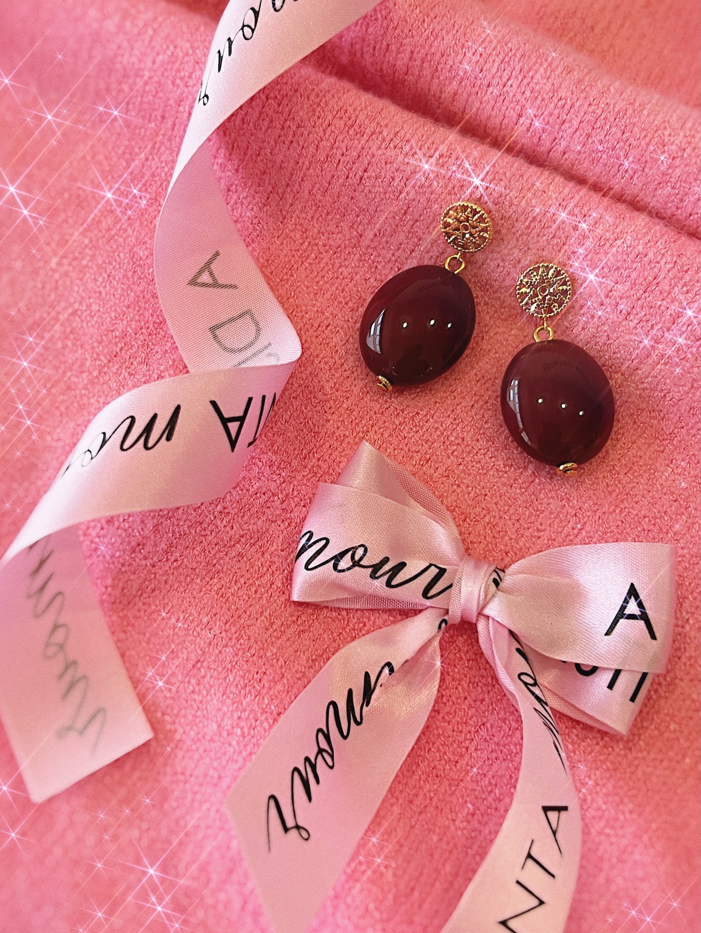 Brincos em aço dourados trabalhados com pendente acrílico bordeaux.