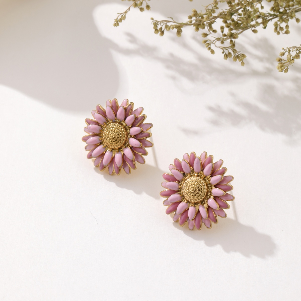 Brincos em aço dourado com efeito de flor com pétalas coloridas.