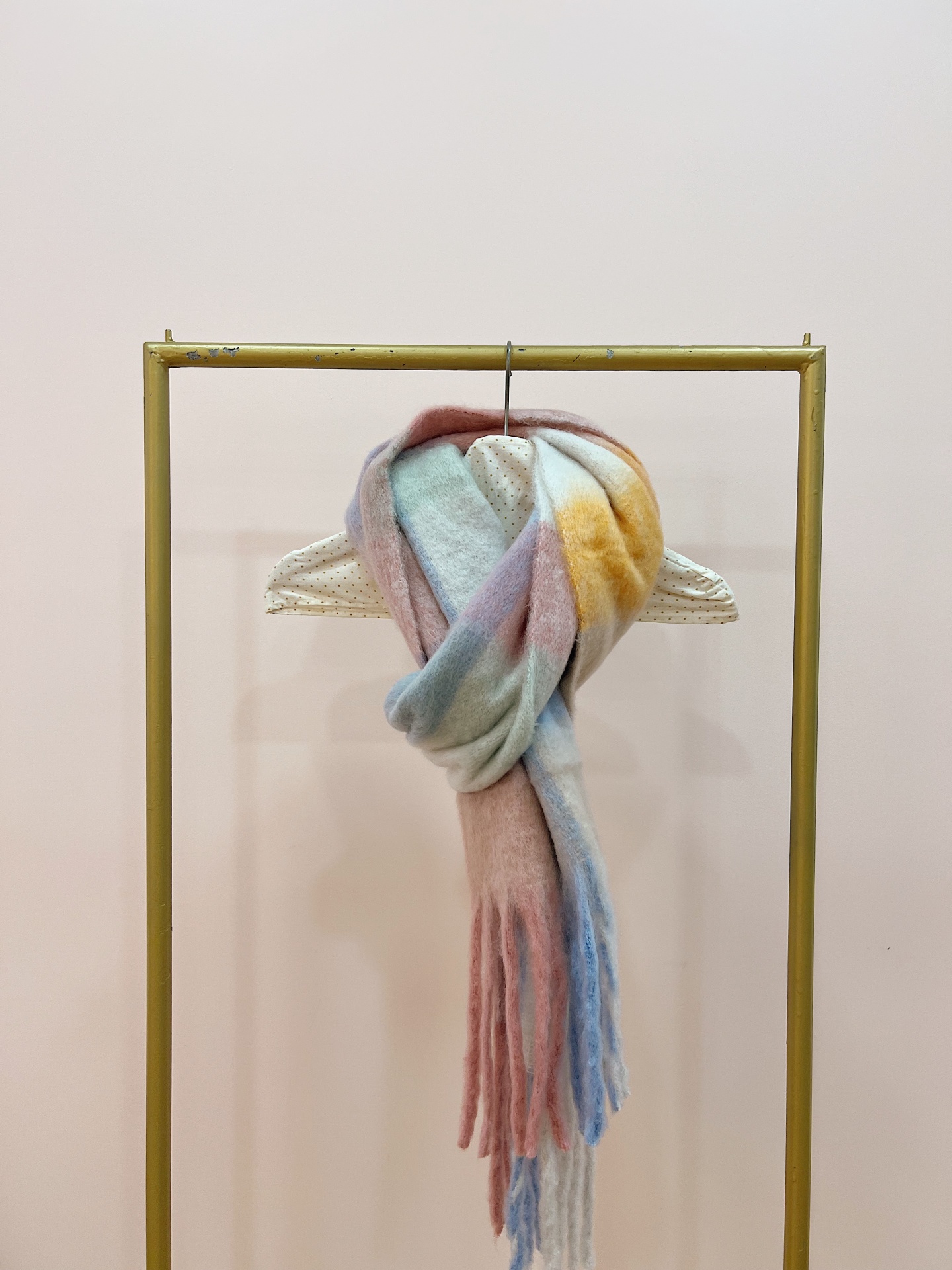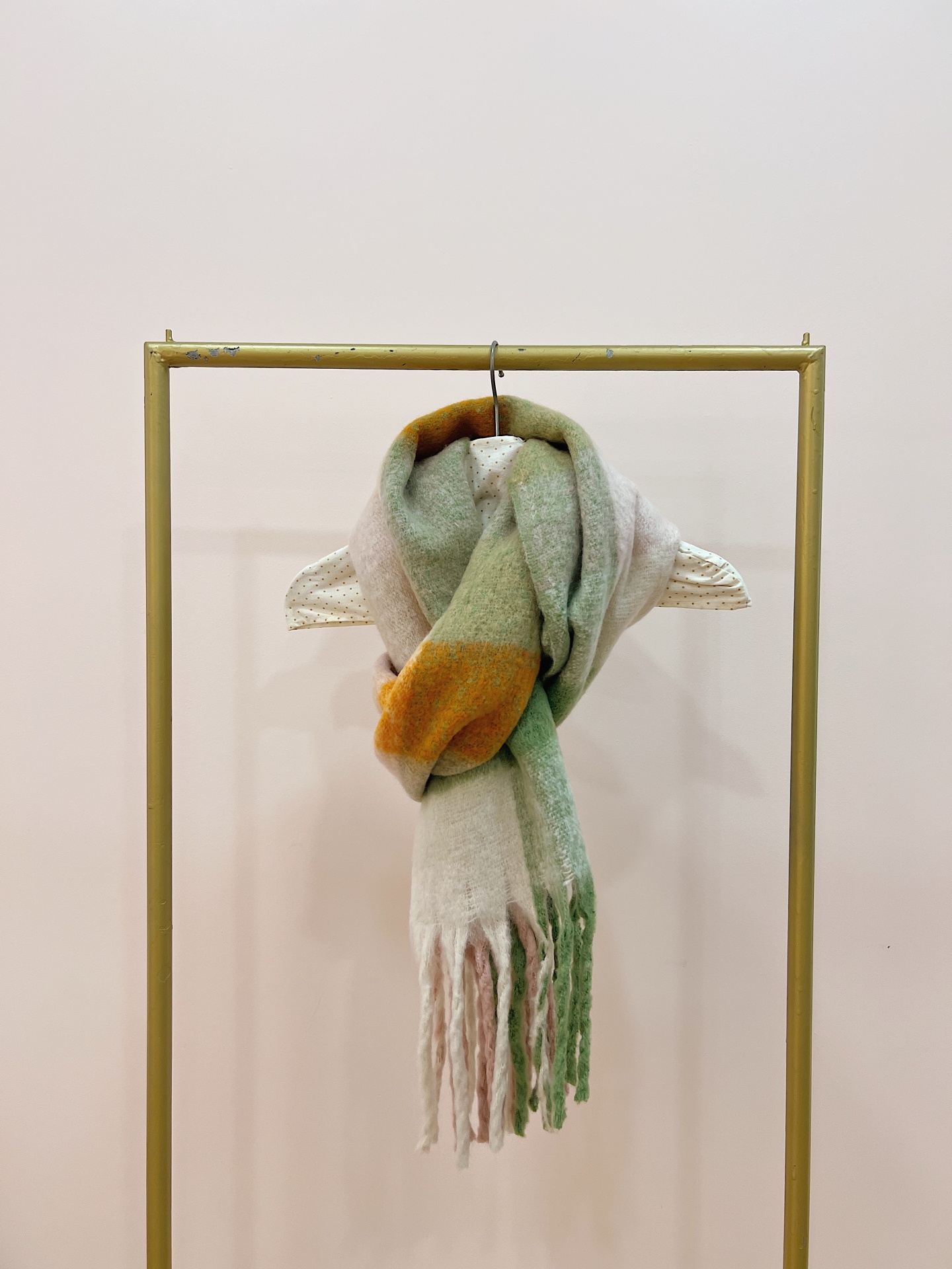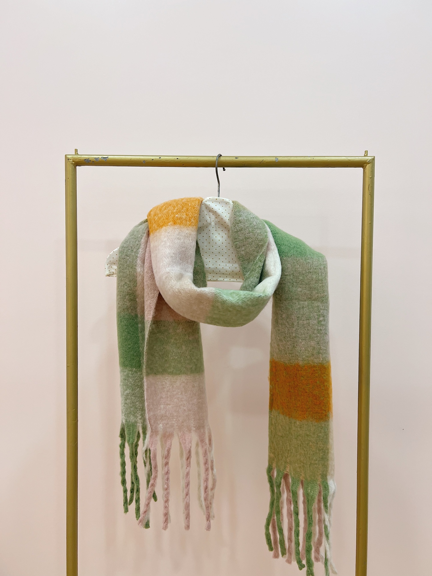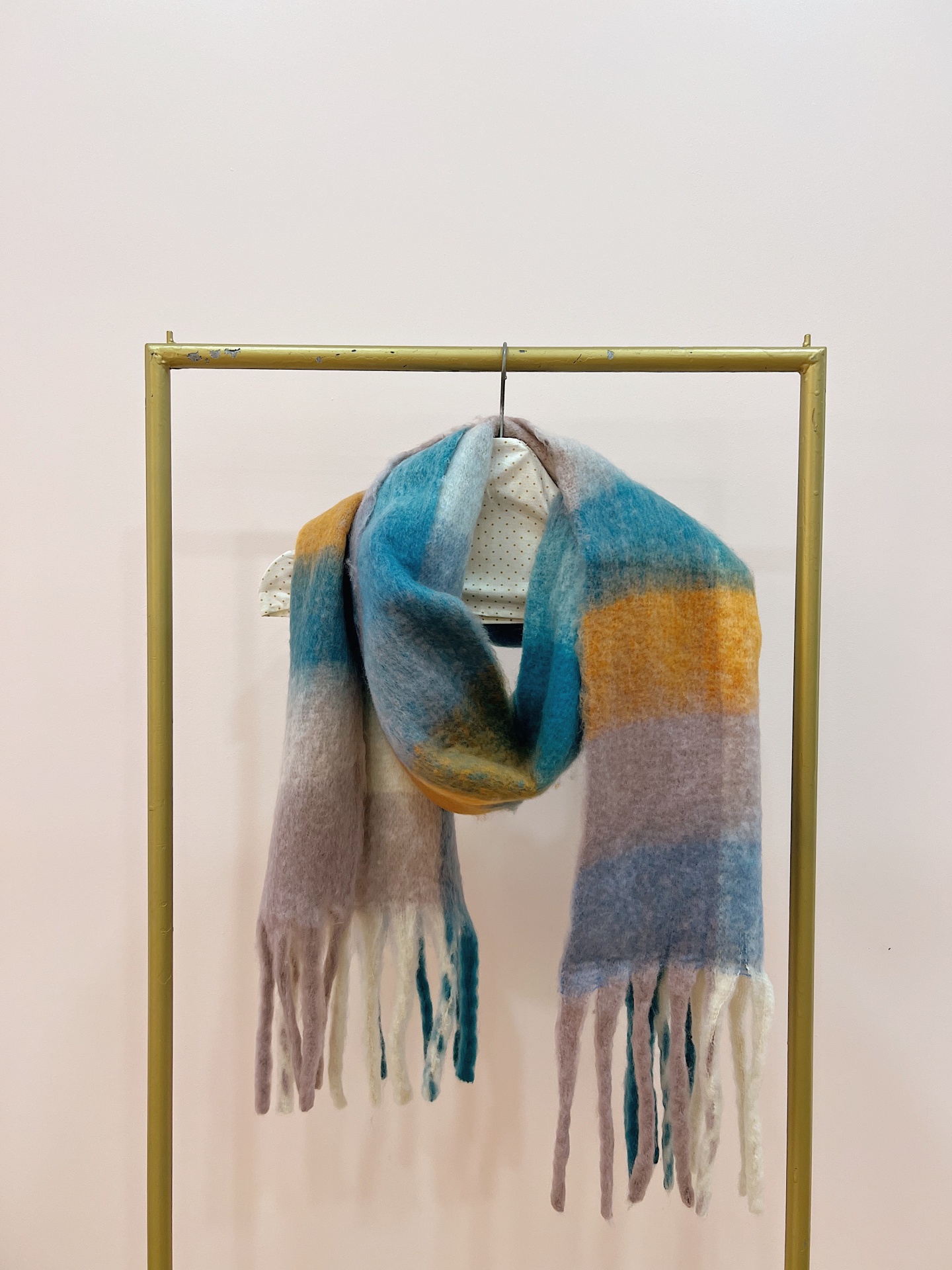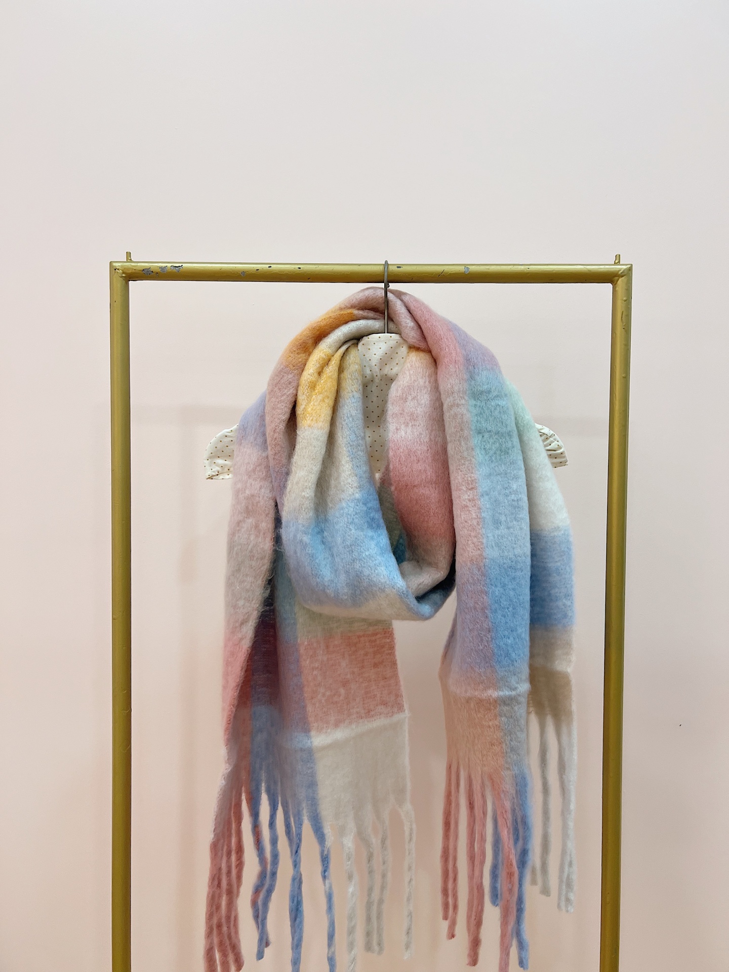 Cachecol quentinho (estilo pelúcia) com padrão de quadrados coloridos.