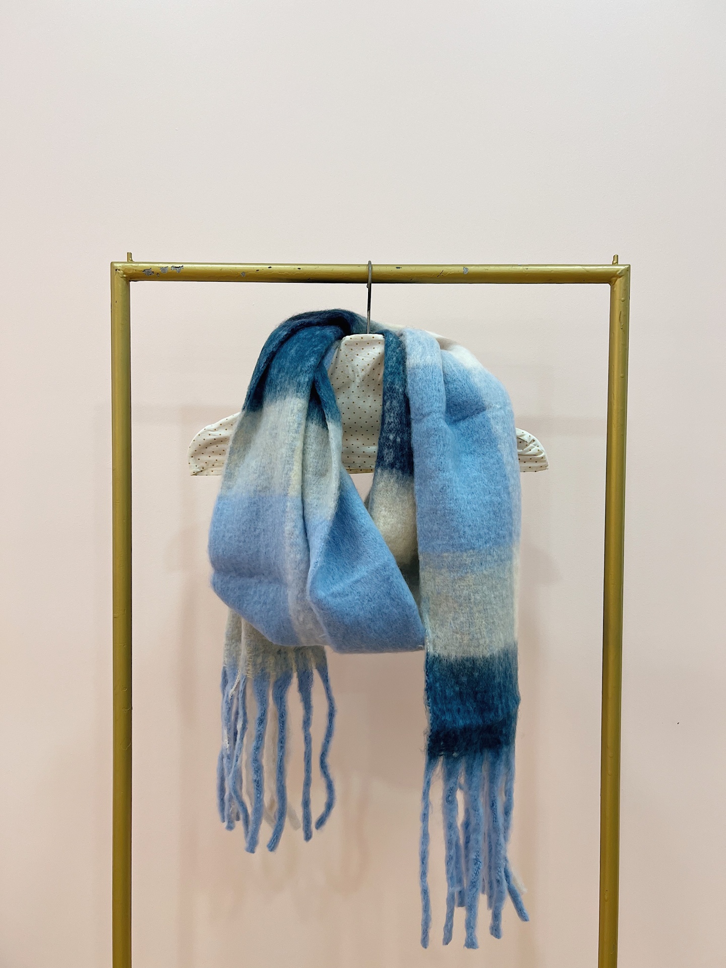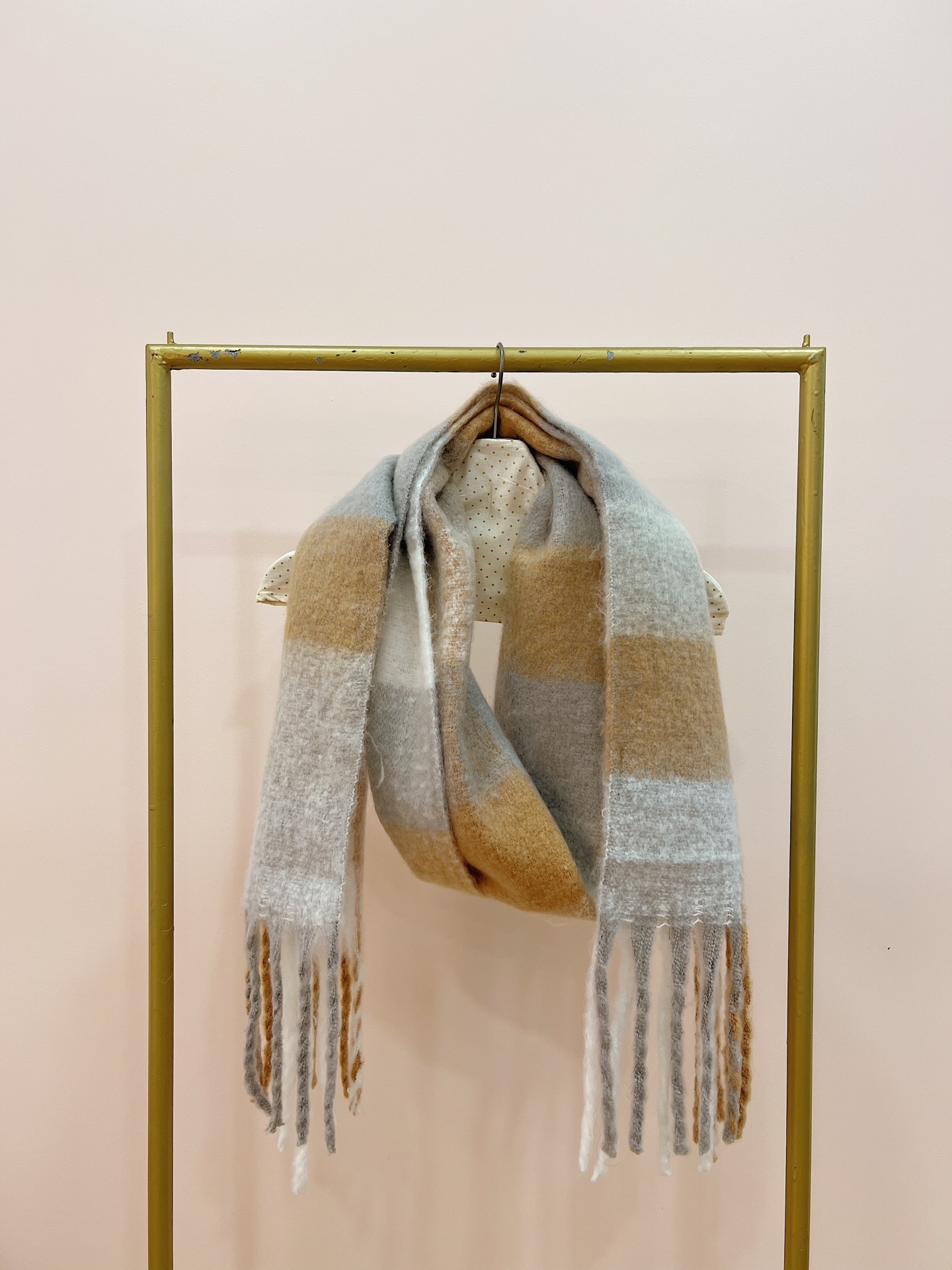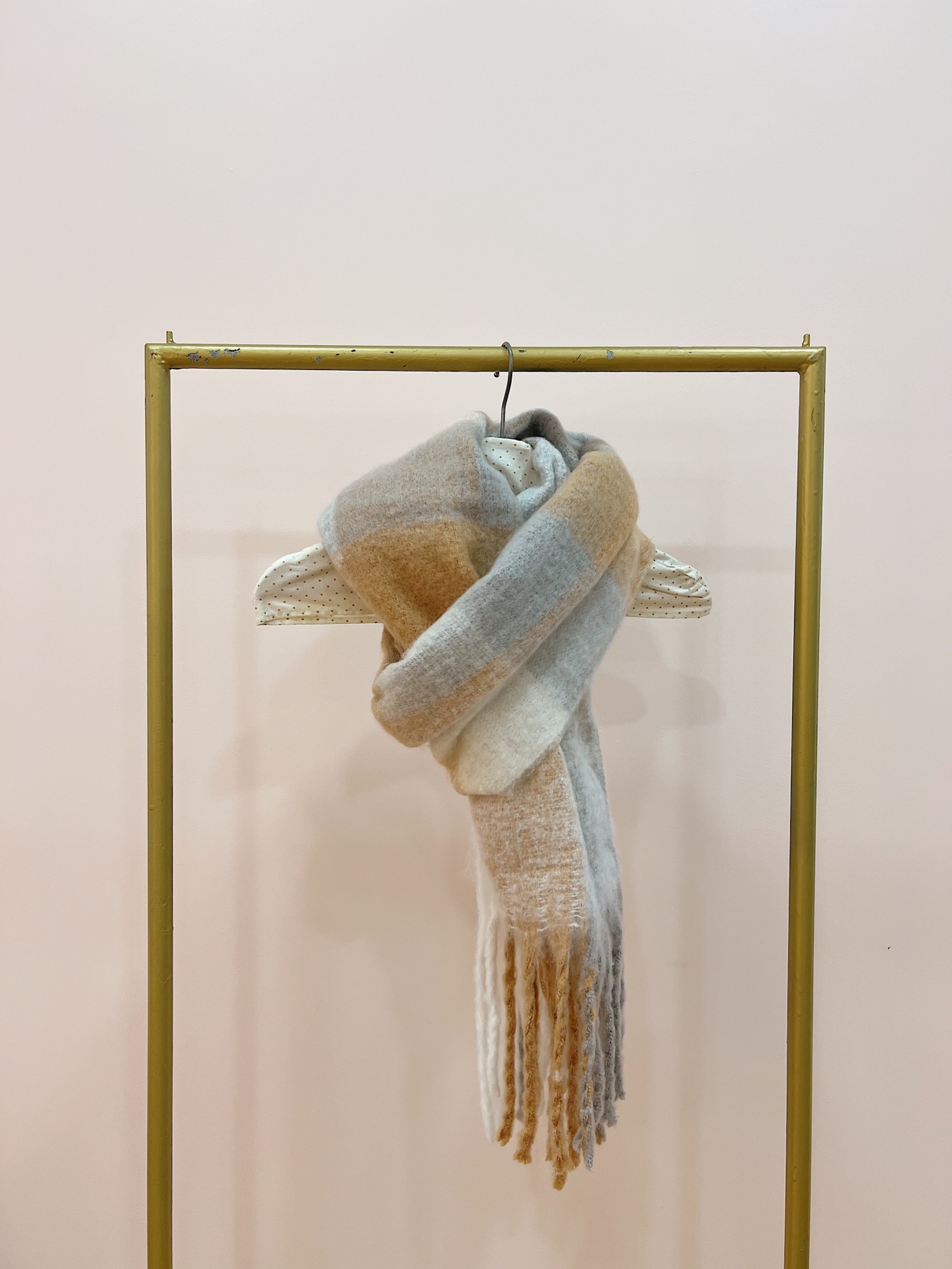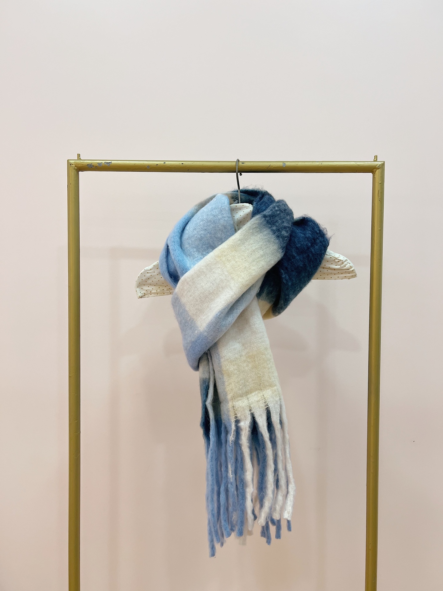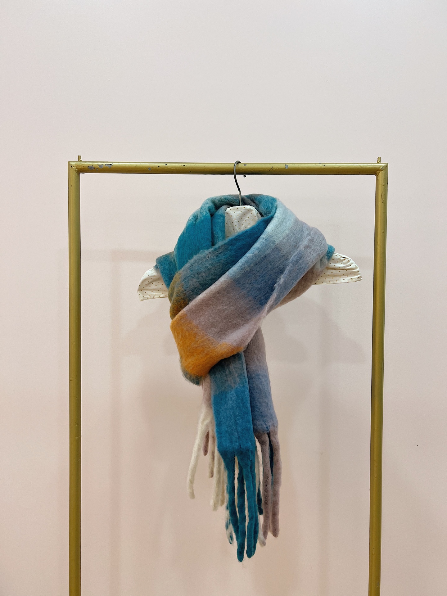 Cachecol quentinho (estilo pelúcia) com padrão de quadrados coloridos.