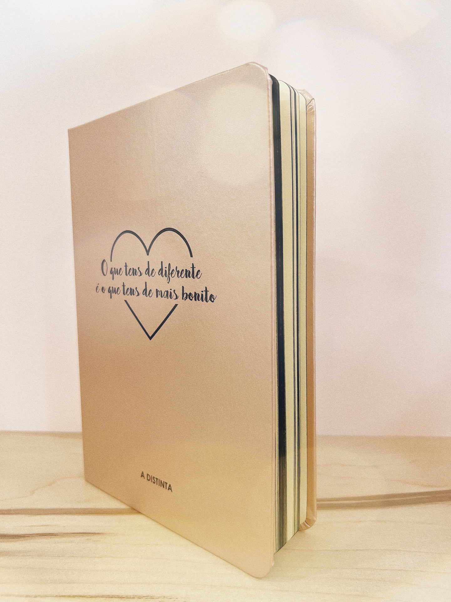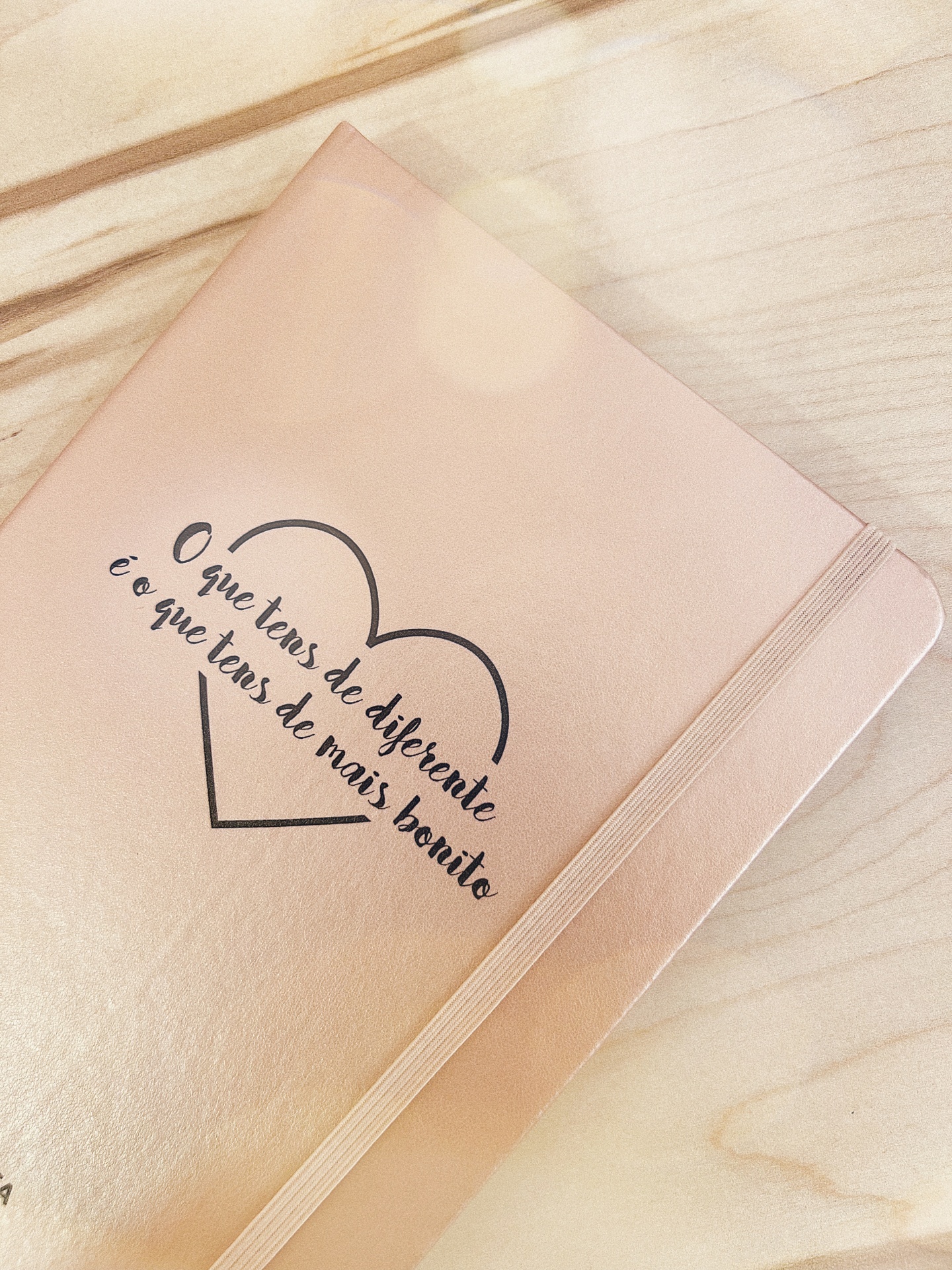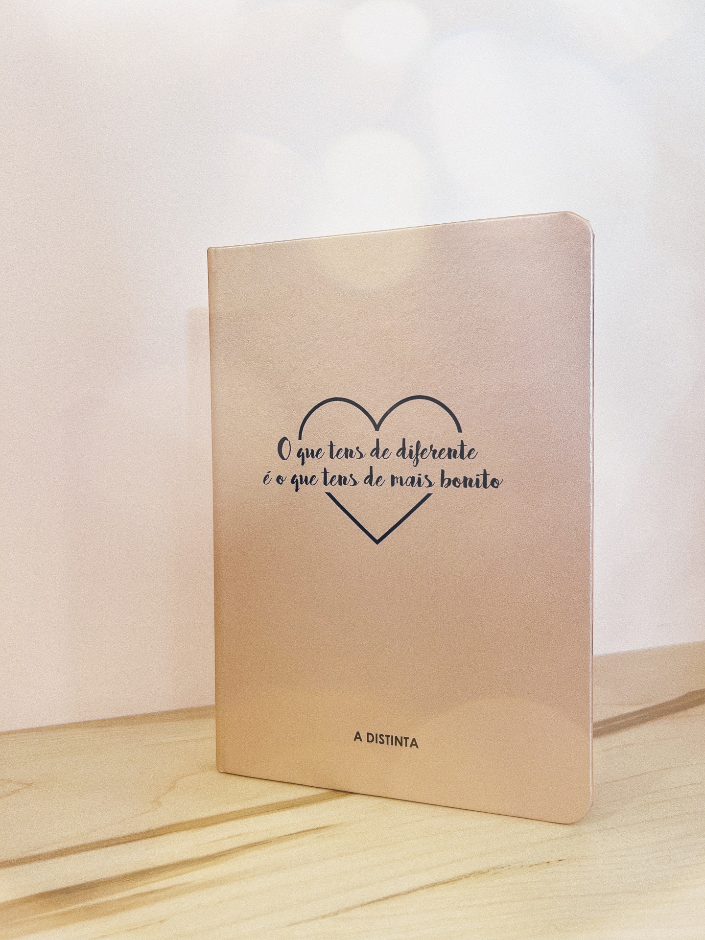 Caderno A5 com capa Rosa Gold personalizada com frase " O que tens de diferente é o que tens de mais bonito" e coração a preto, com 80 folhas lisas em papel reciclado.