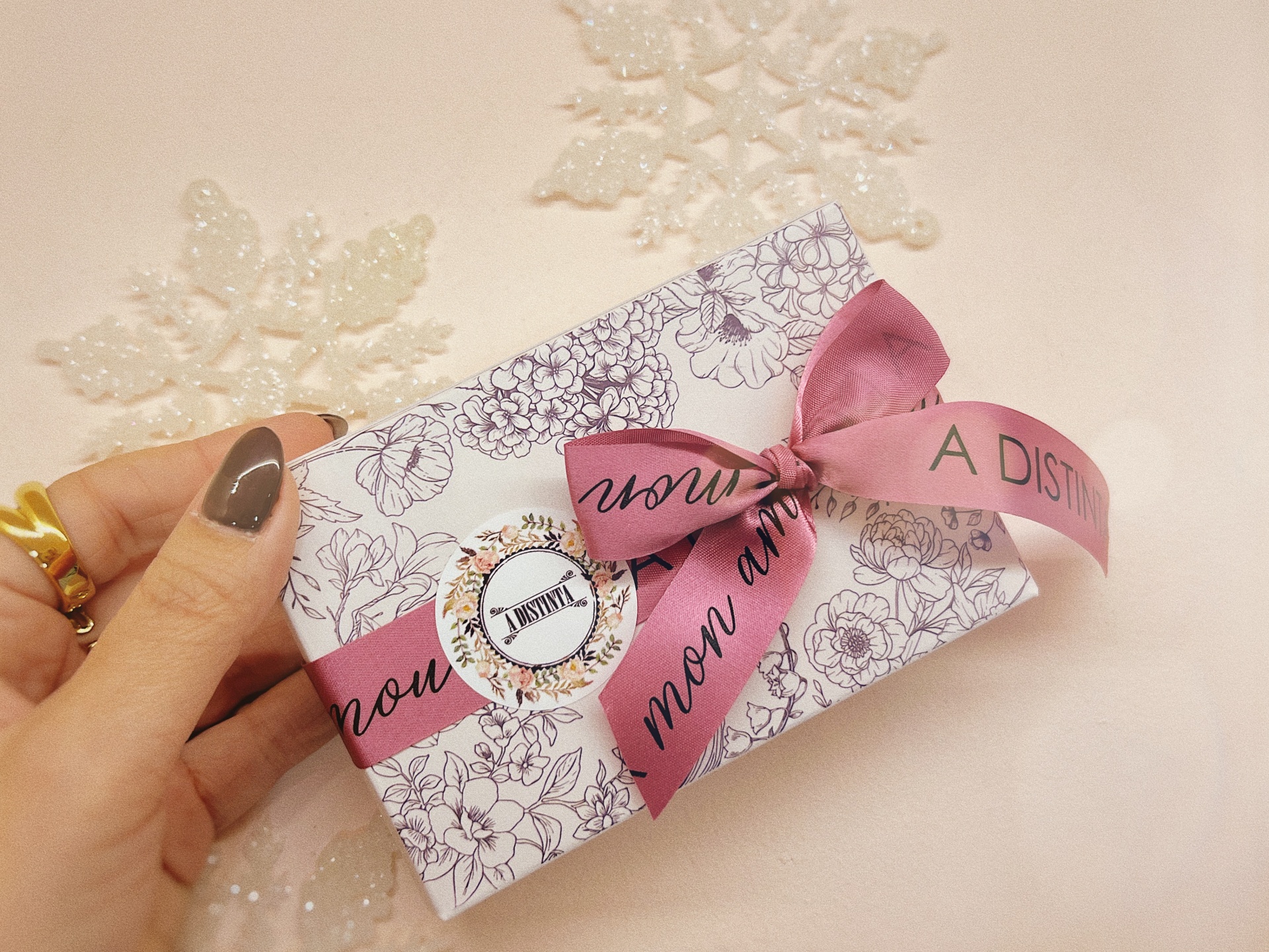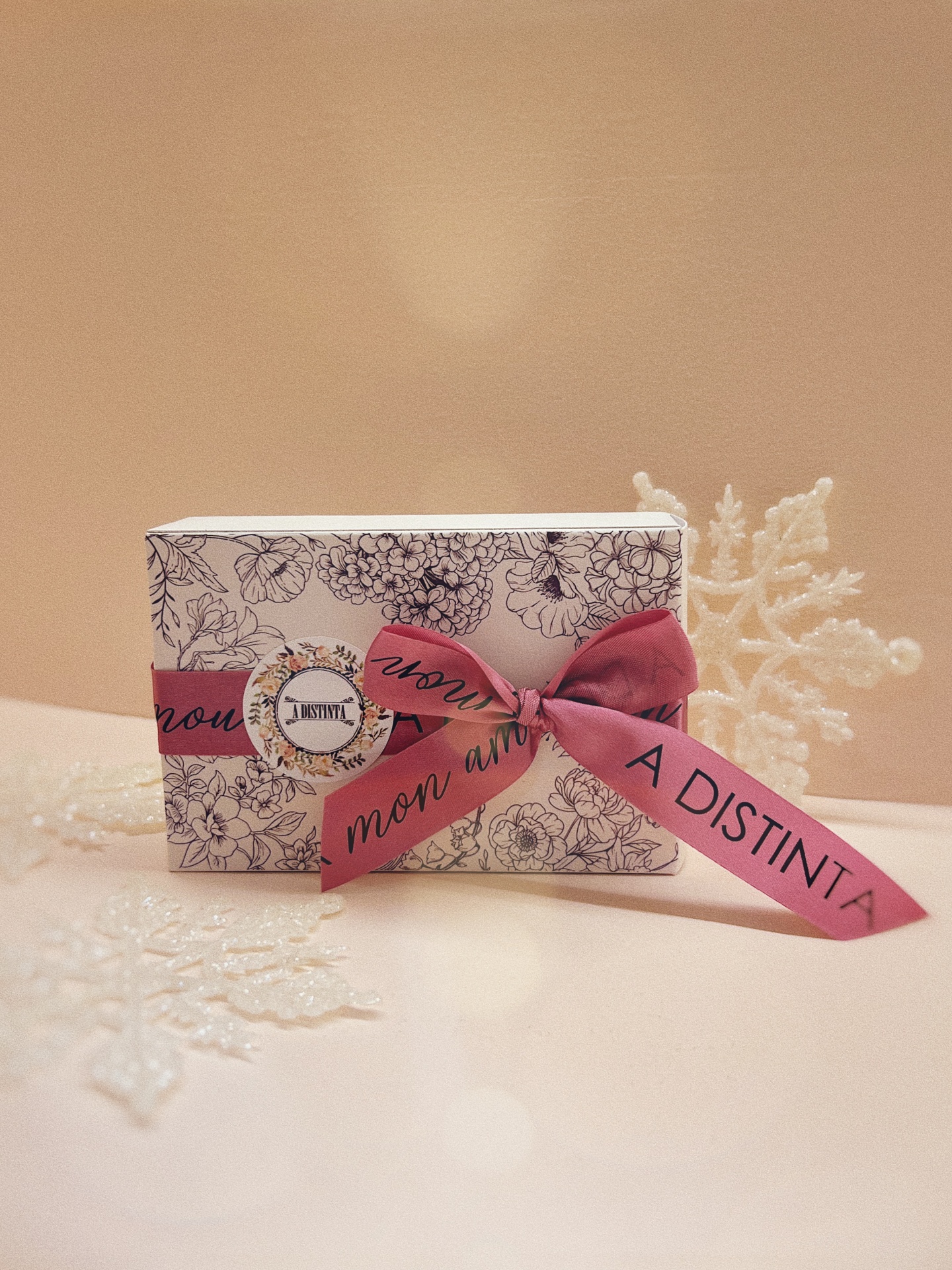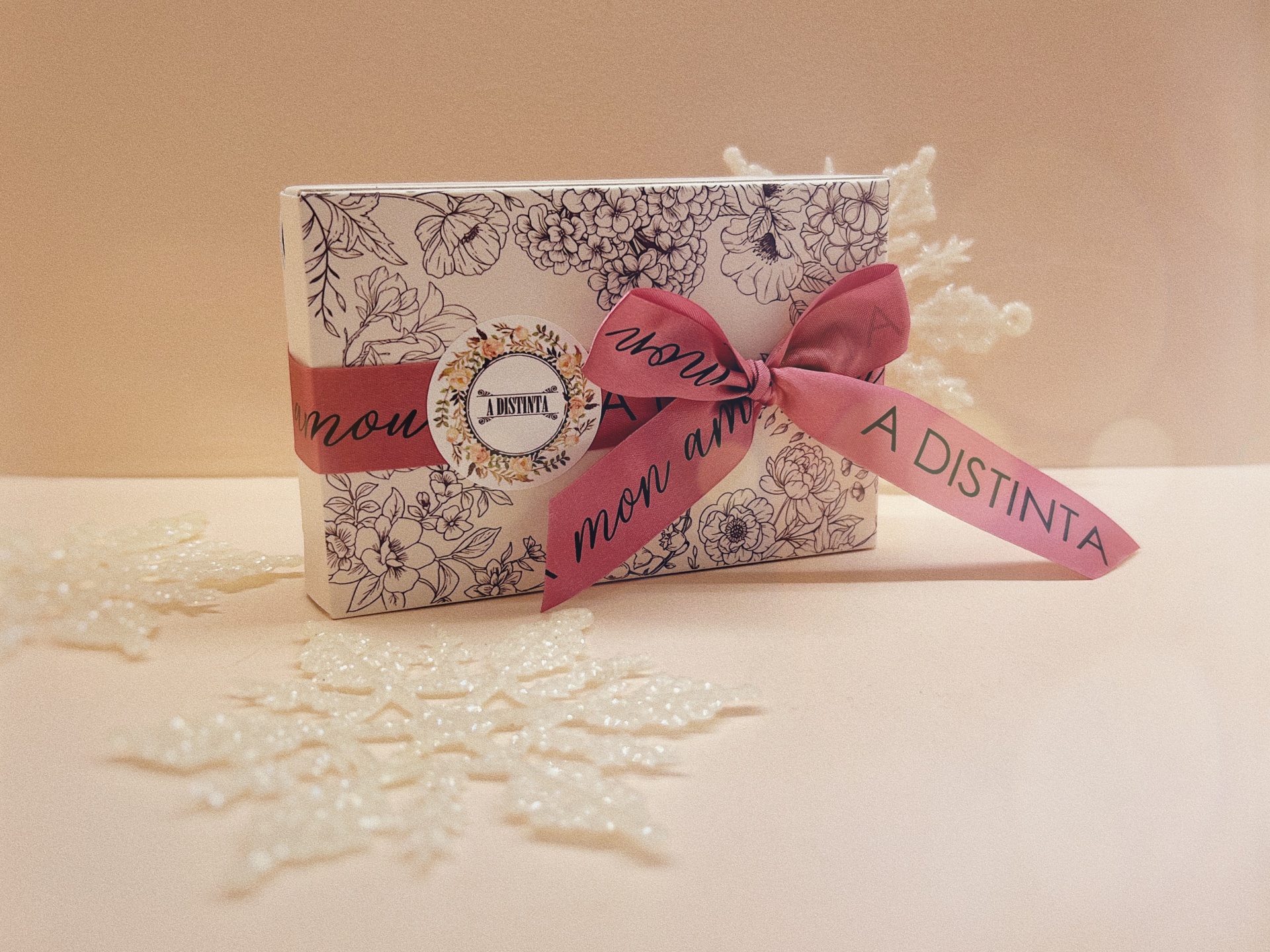 Para surpreenderes este Natal, preparamos uma Caixinha única com padrão floral, o nosso logótipo e fita de seda "A Distinta mon amour" para fechar com um laço ao teu gosto.