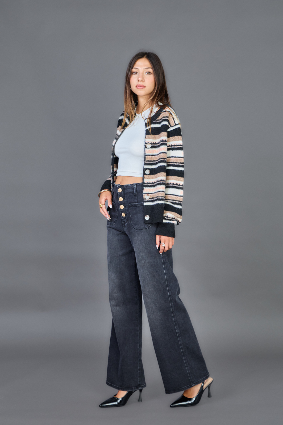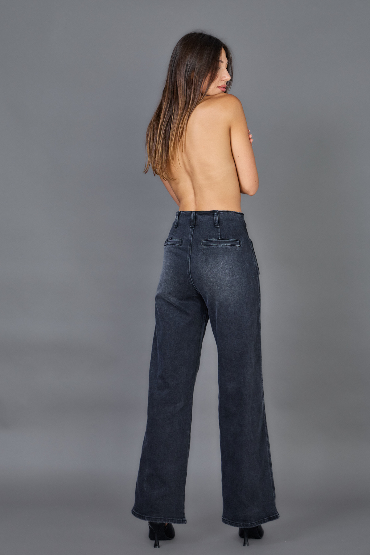 Calças de ganga em modelo wideleg com cinta subida.