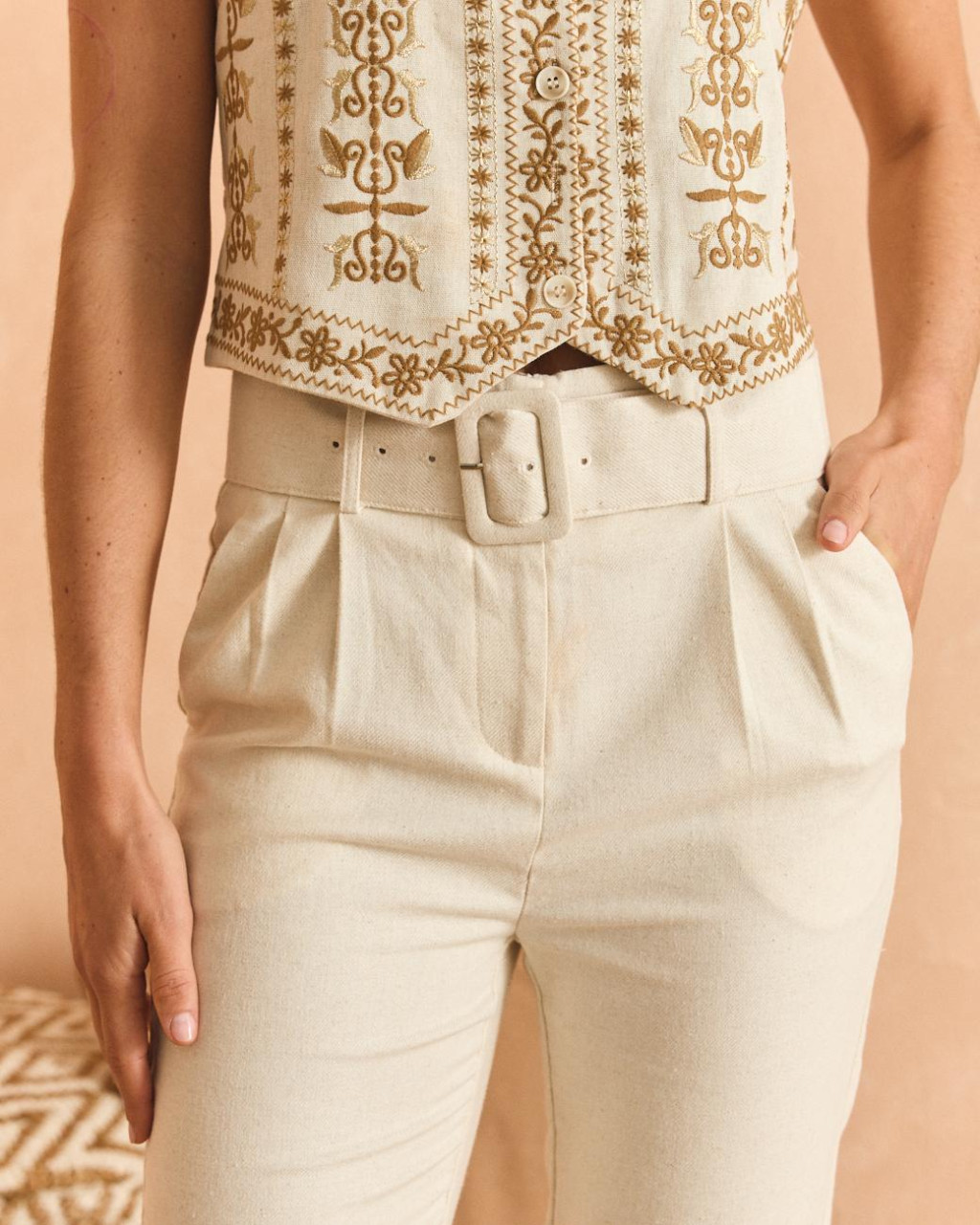Calças crú com corte clássico e cinto.