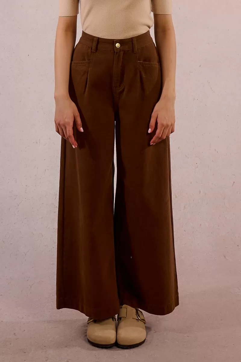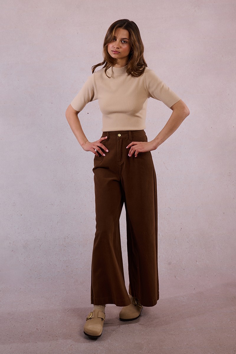 Cinta subida com bolsos funcionais e efeito de prega à frente. Desenho de perna wideleg.