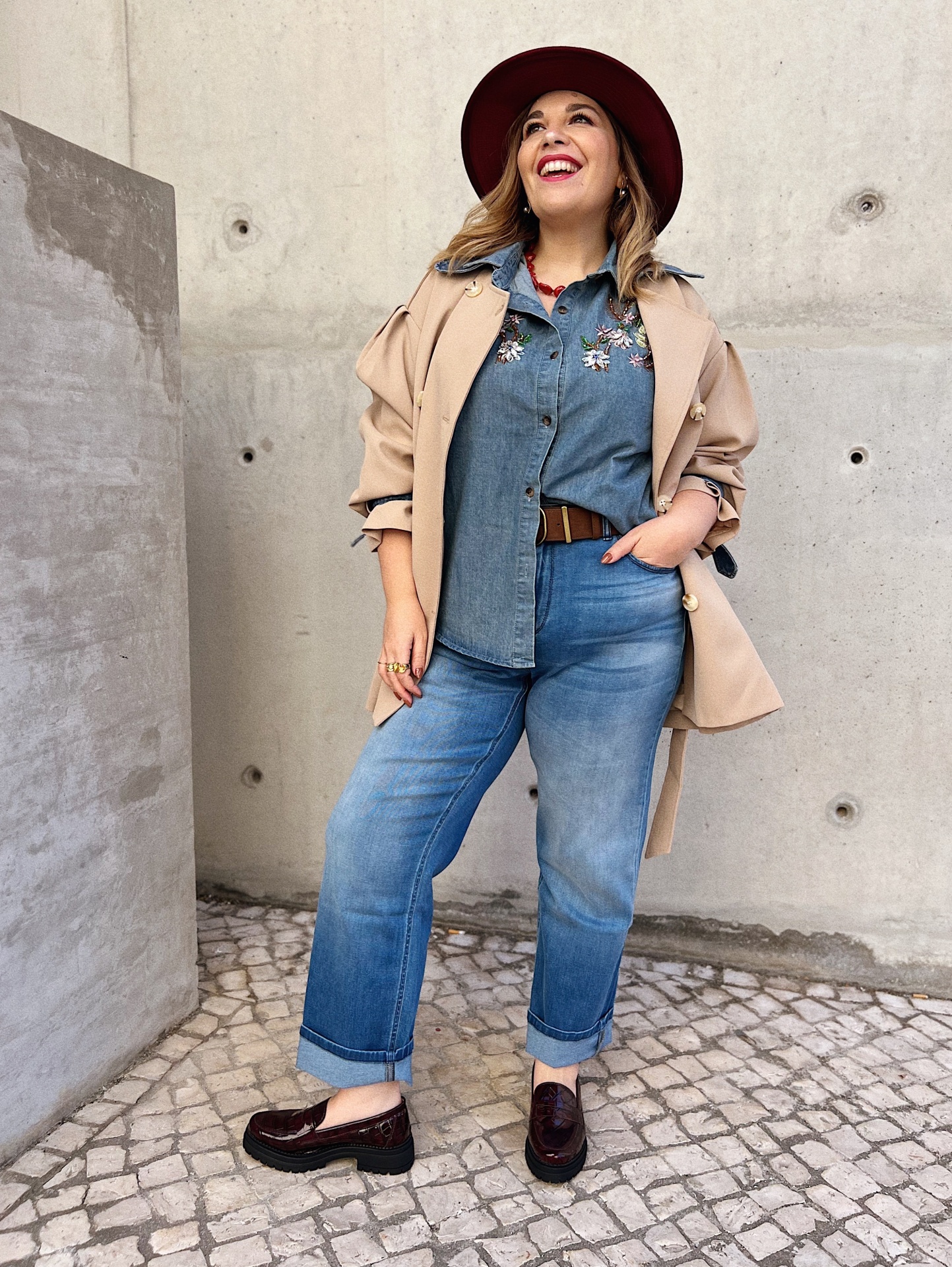 Desenho de perna recto. Cinta subida com bolsos funcionais e fecho tradicional de botão e zipper.