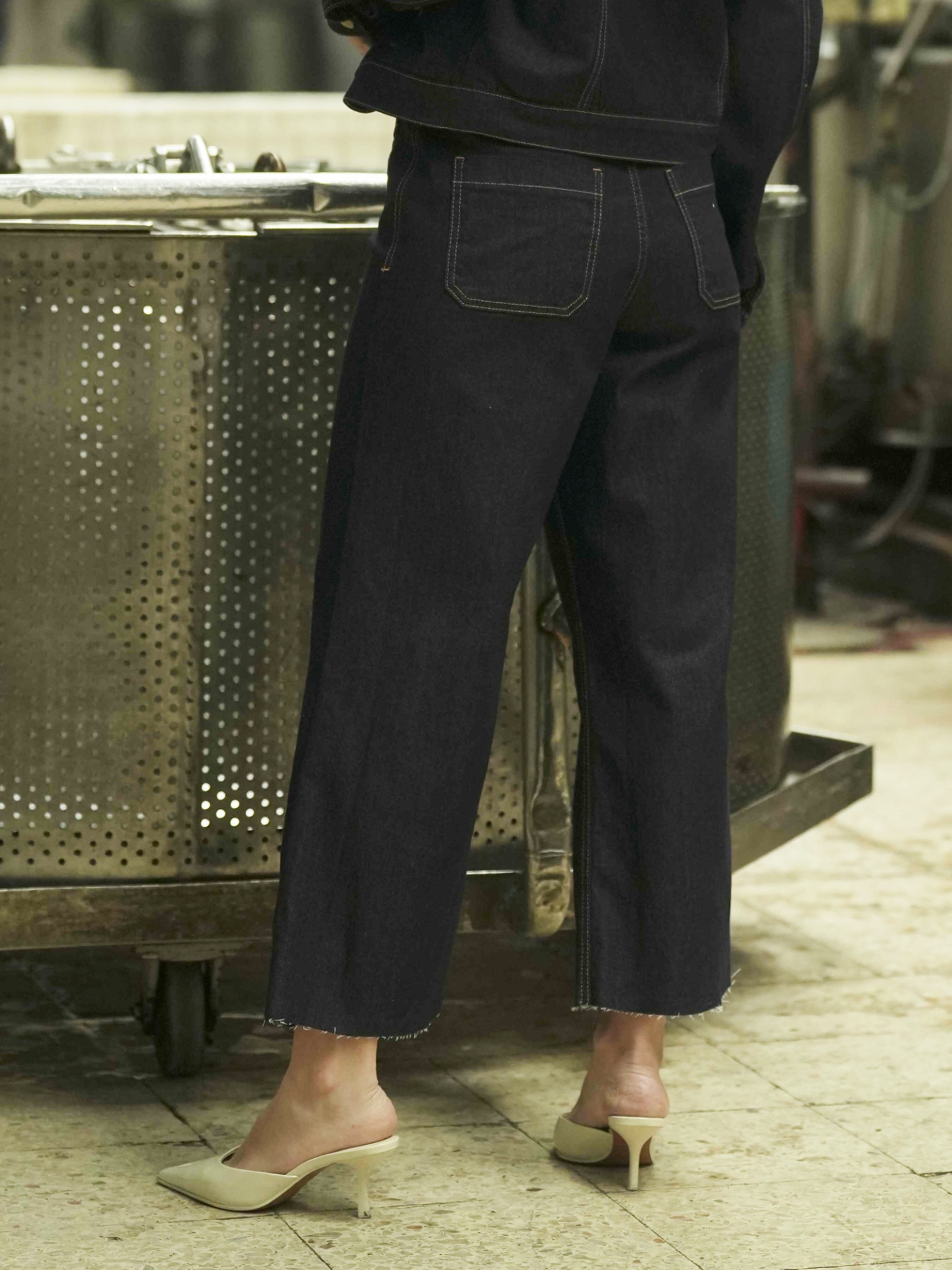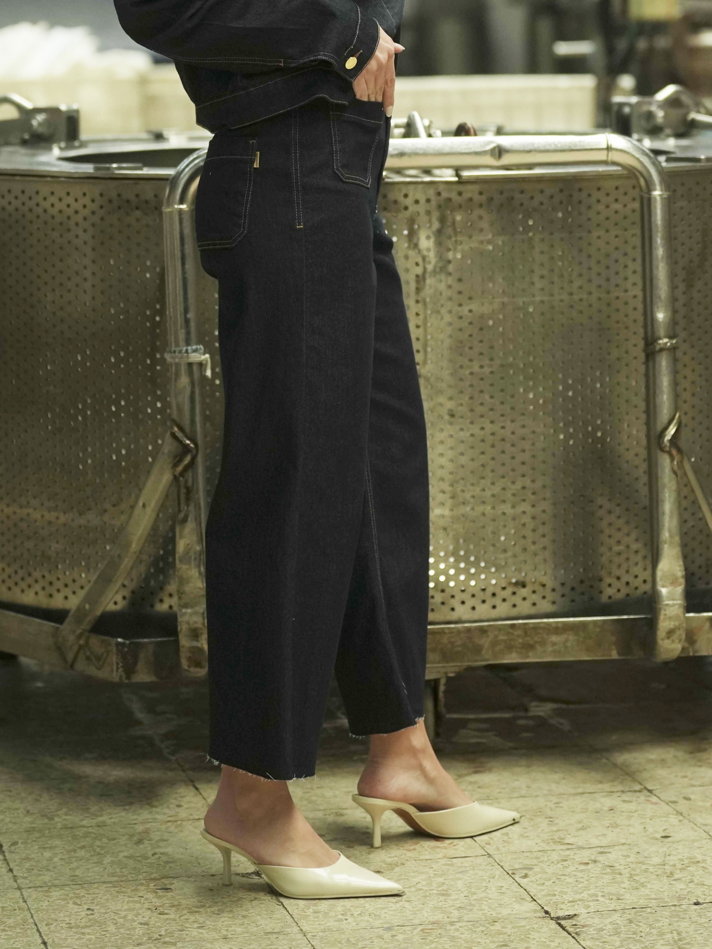 Corte cintado com efeito Wideleg. Linhas em contraste.