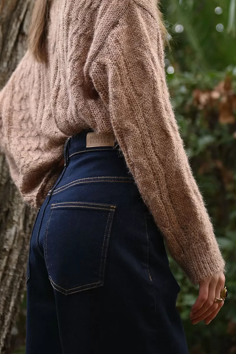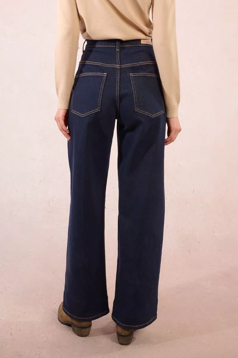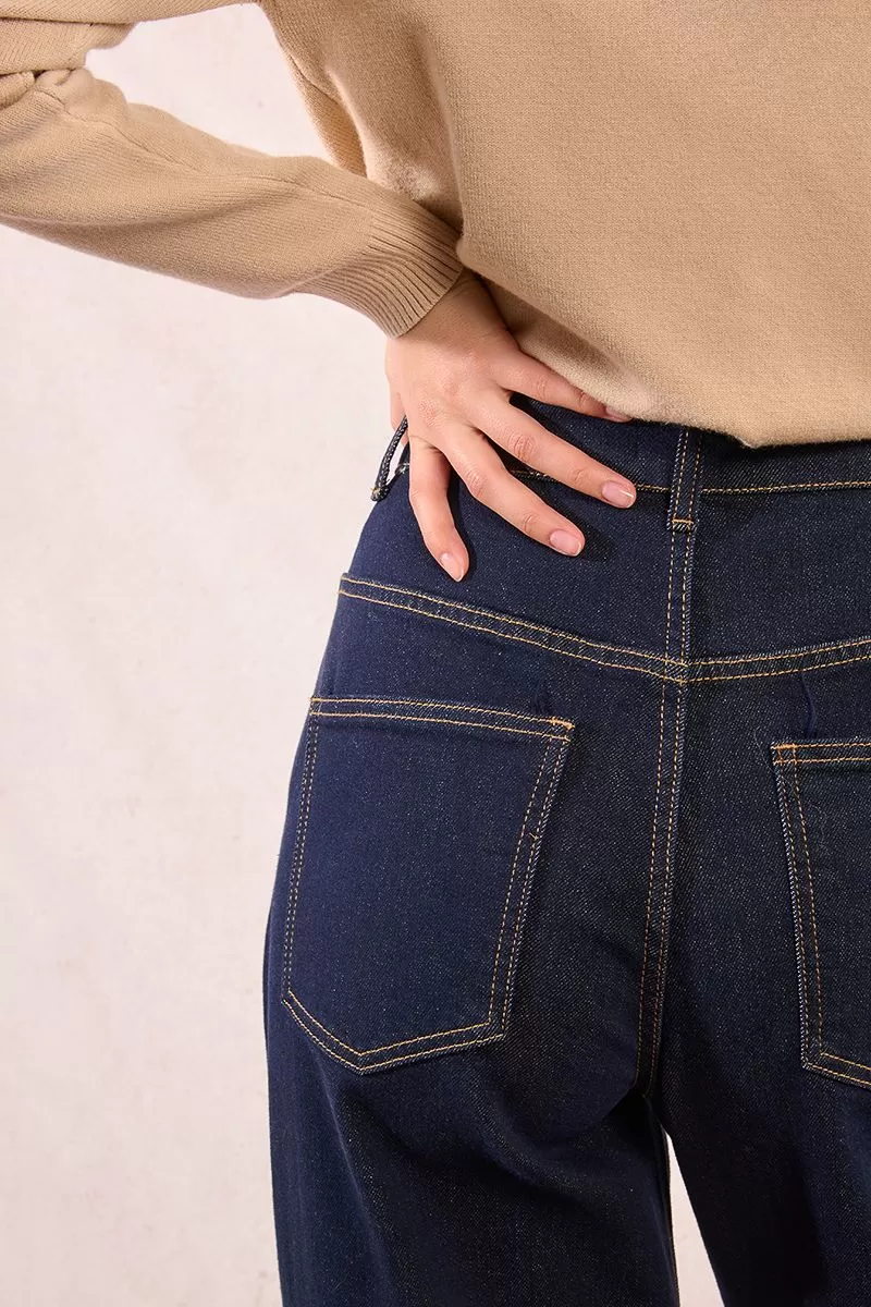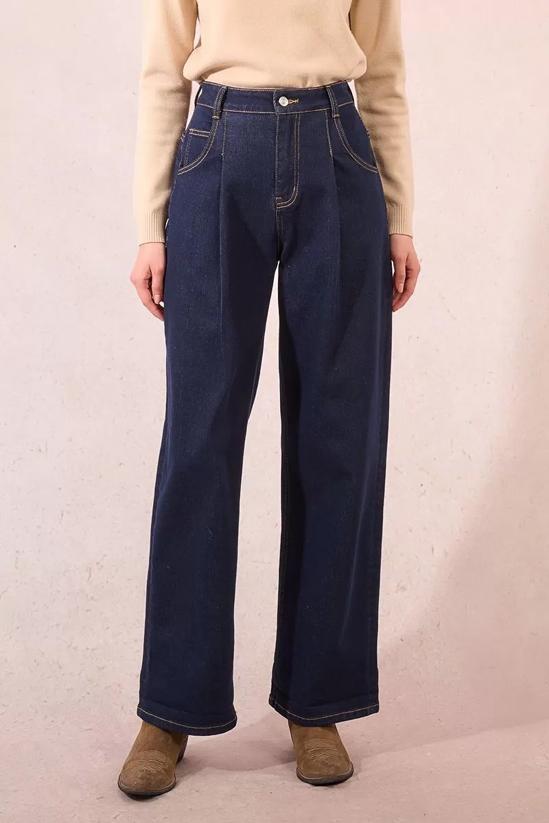 Cinta subida com bolsos funcionais e efeito de prega à frente. Desenho de perna wideleg.