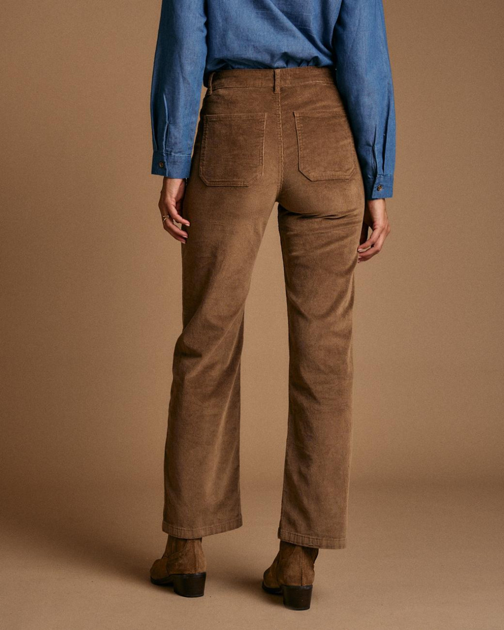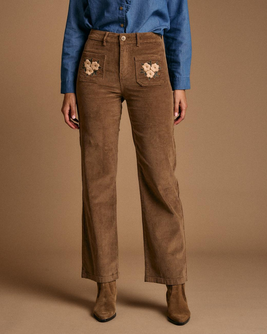 Modelo com fecho tradicional e bolsos de chapa com flores bordadas.