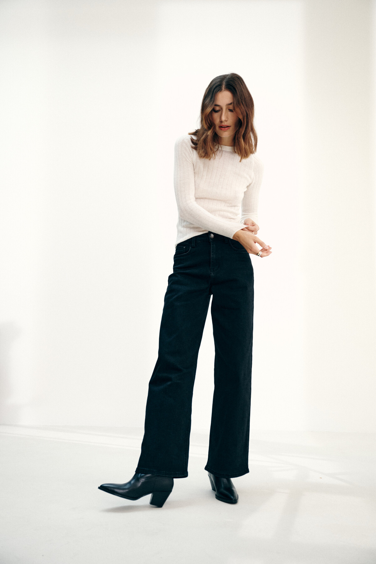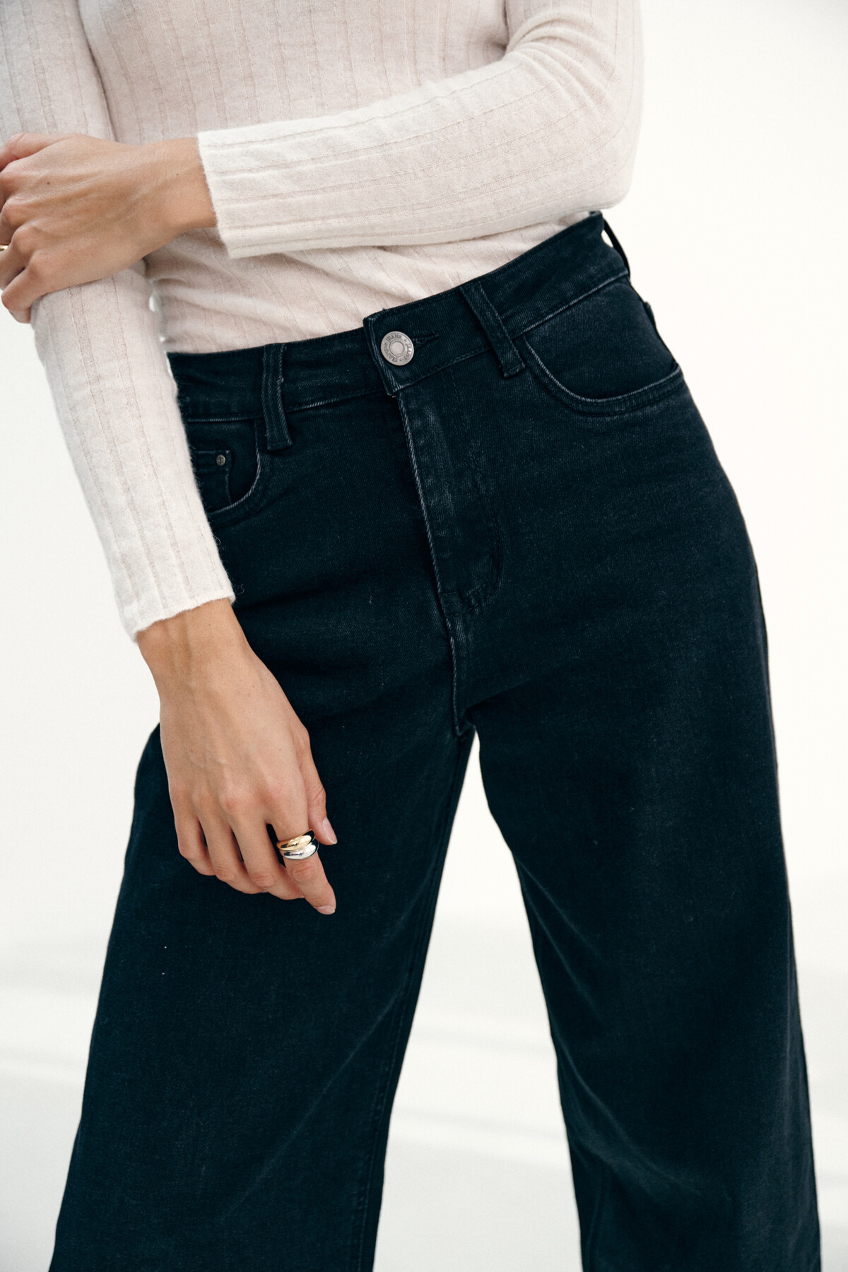 Calças de ganga em lavagem preta num corte baggy estilo "Dad Cut" inspirada nos anos 90.