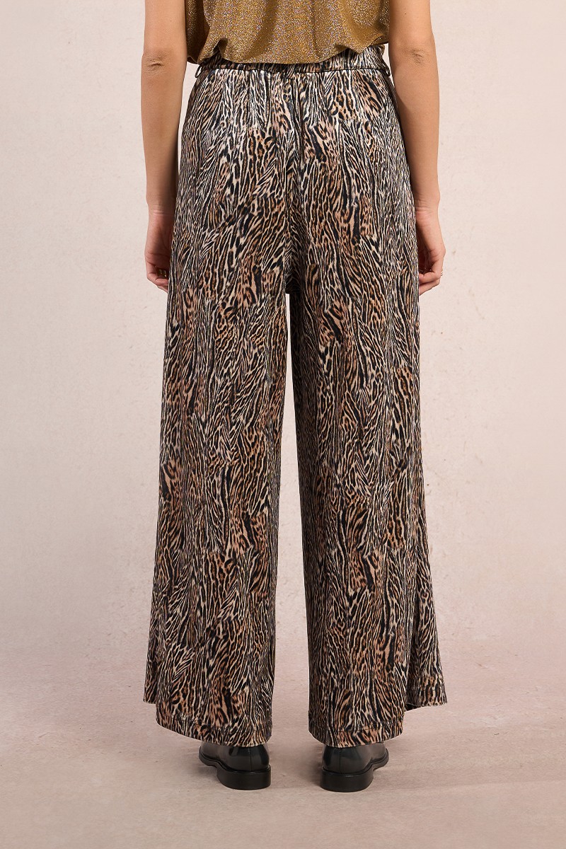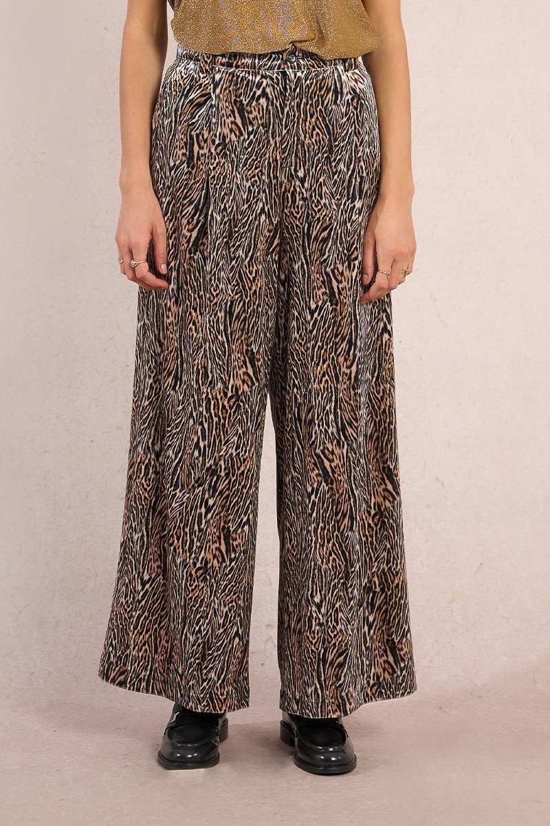 Calças em veludo com padrão animal print, num corte estruturado estilo alfaiataria.