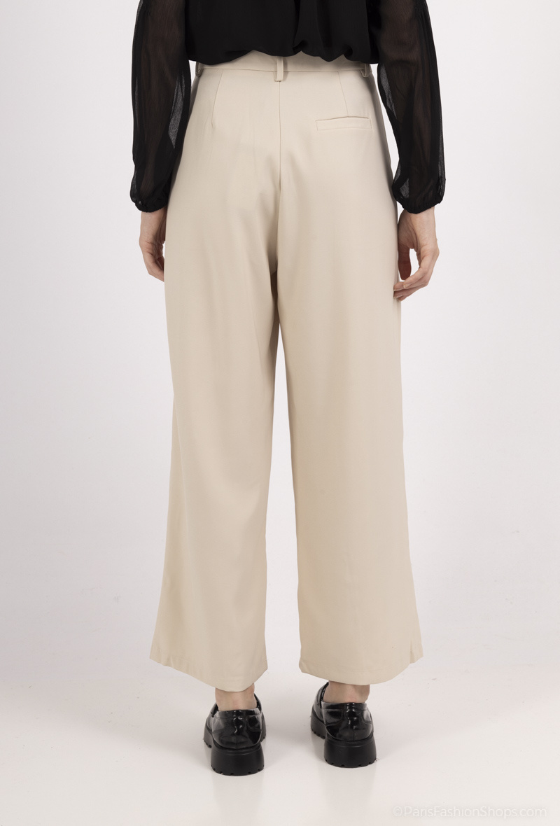Modelo com botão e zipper. Presilhas. Cinta subida.