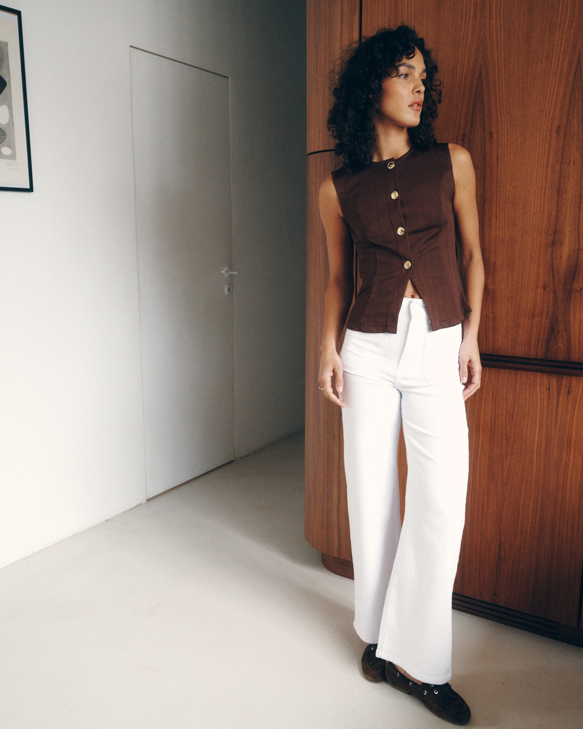 Calças de ganga com elasticidade em modelo wideleg (a partir da anca).