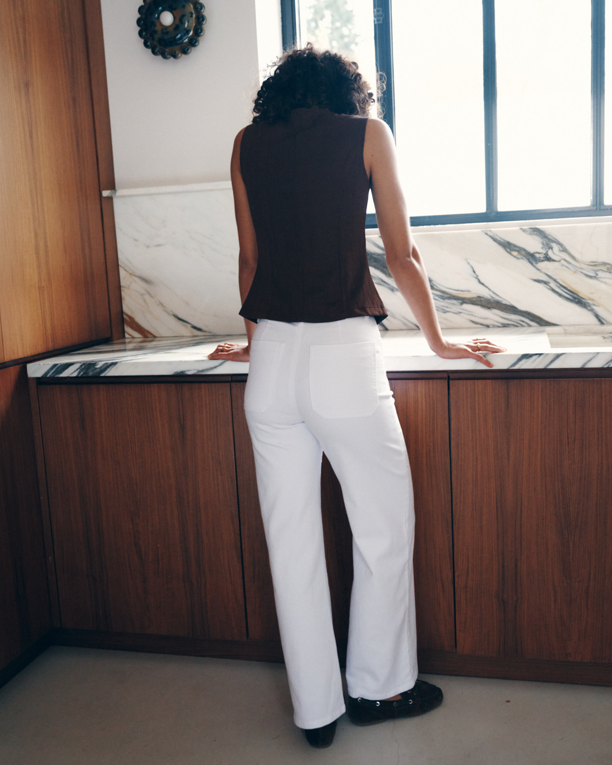 Modelo com cinta subida com fecho tradicional de zipper e botão.