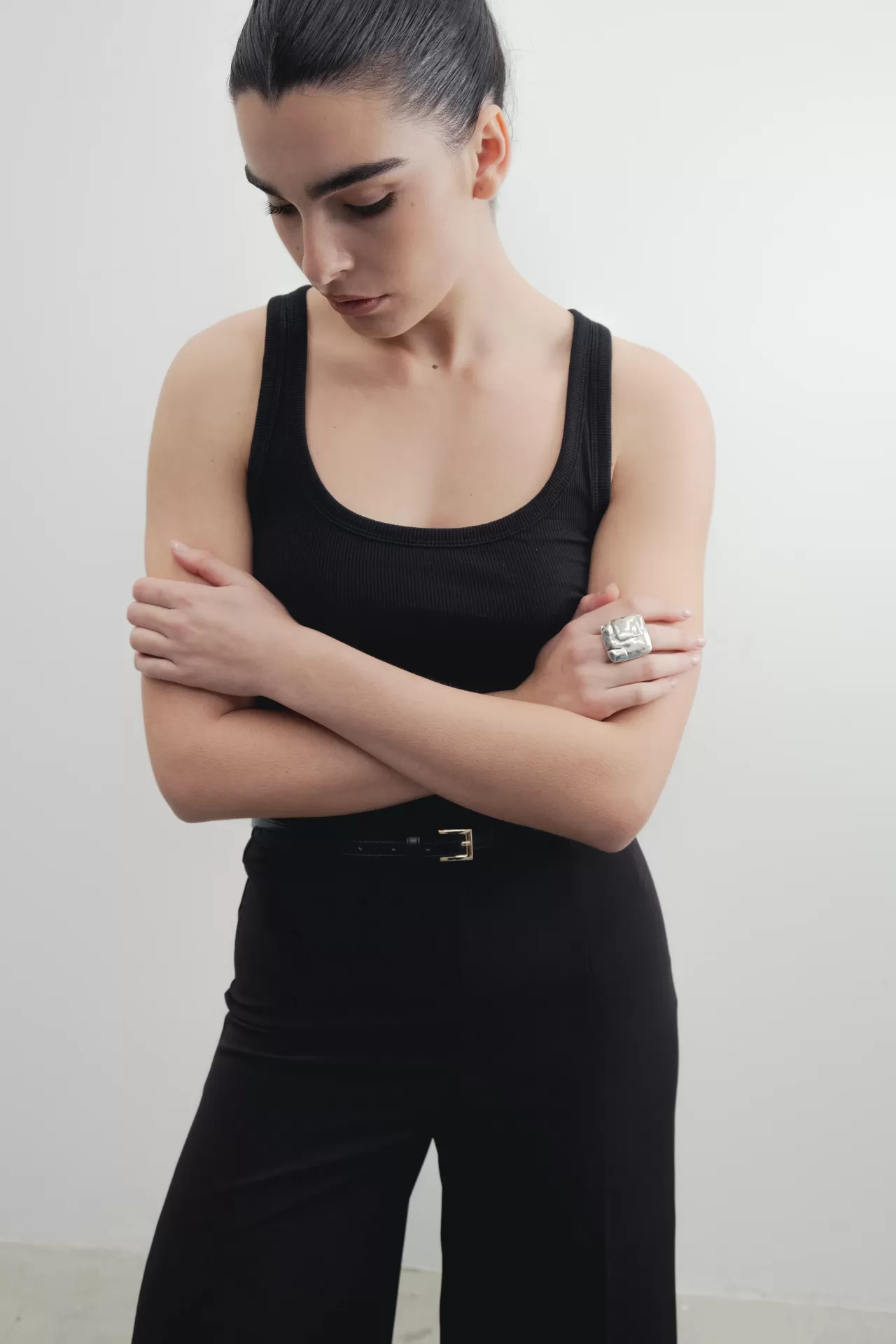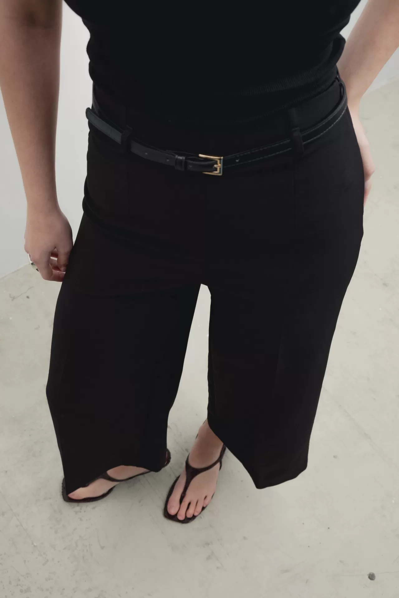 Calças estilo culottes pretas com cinto (amovível em pele sintética).