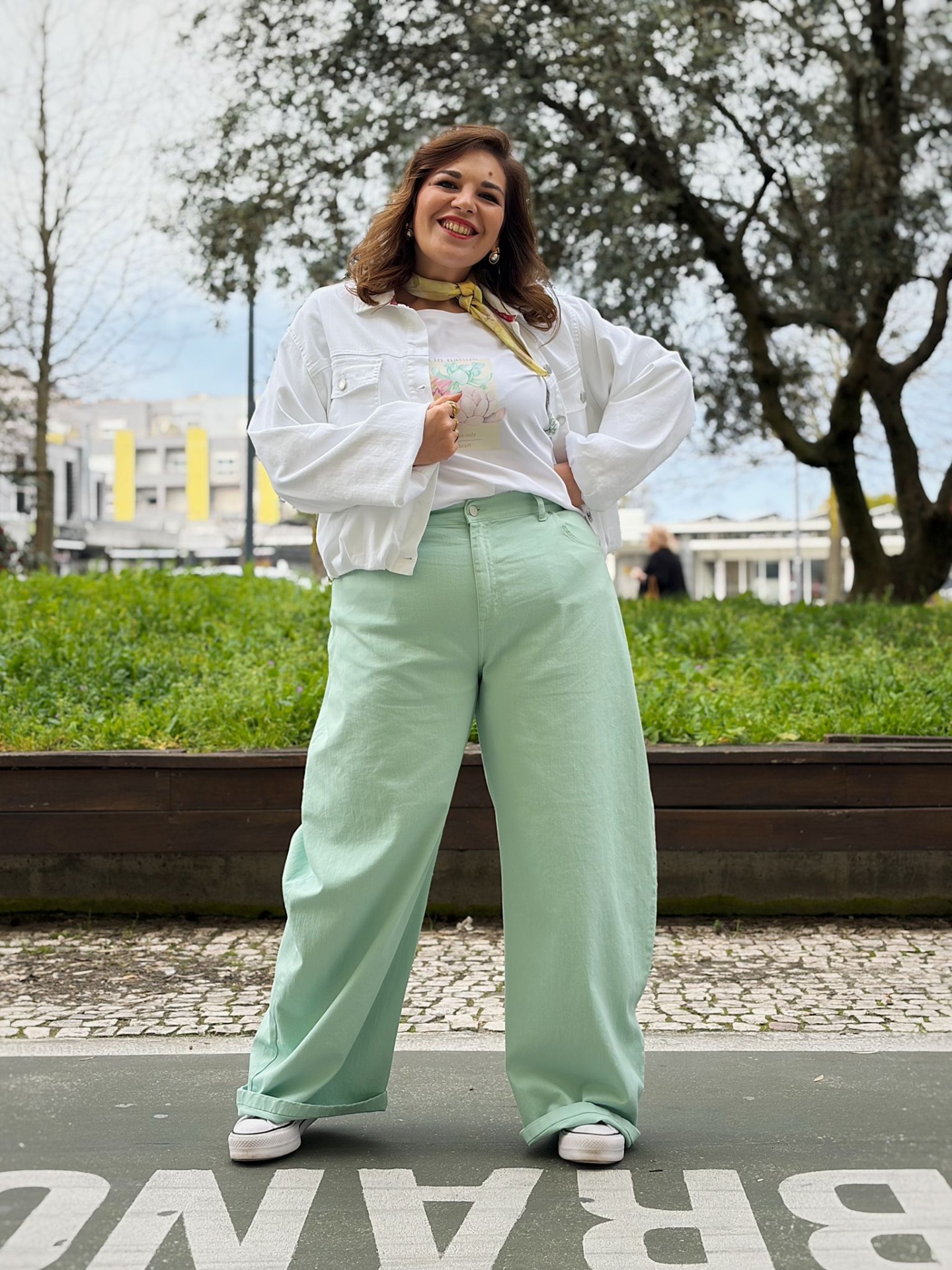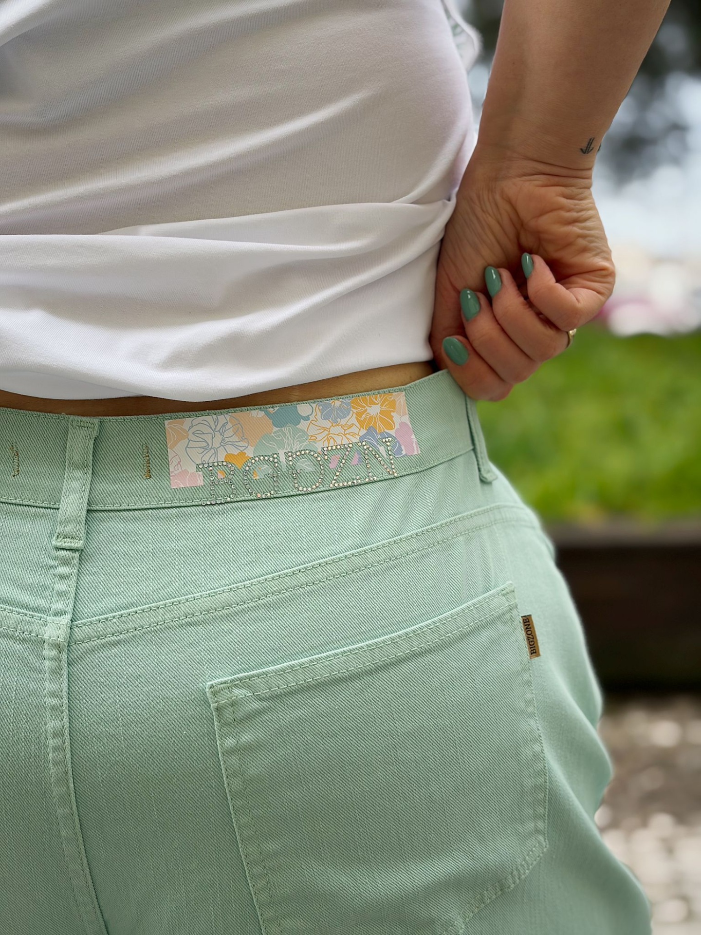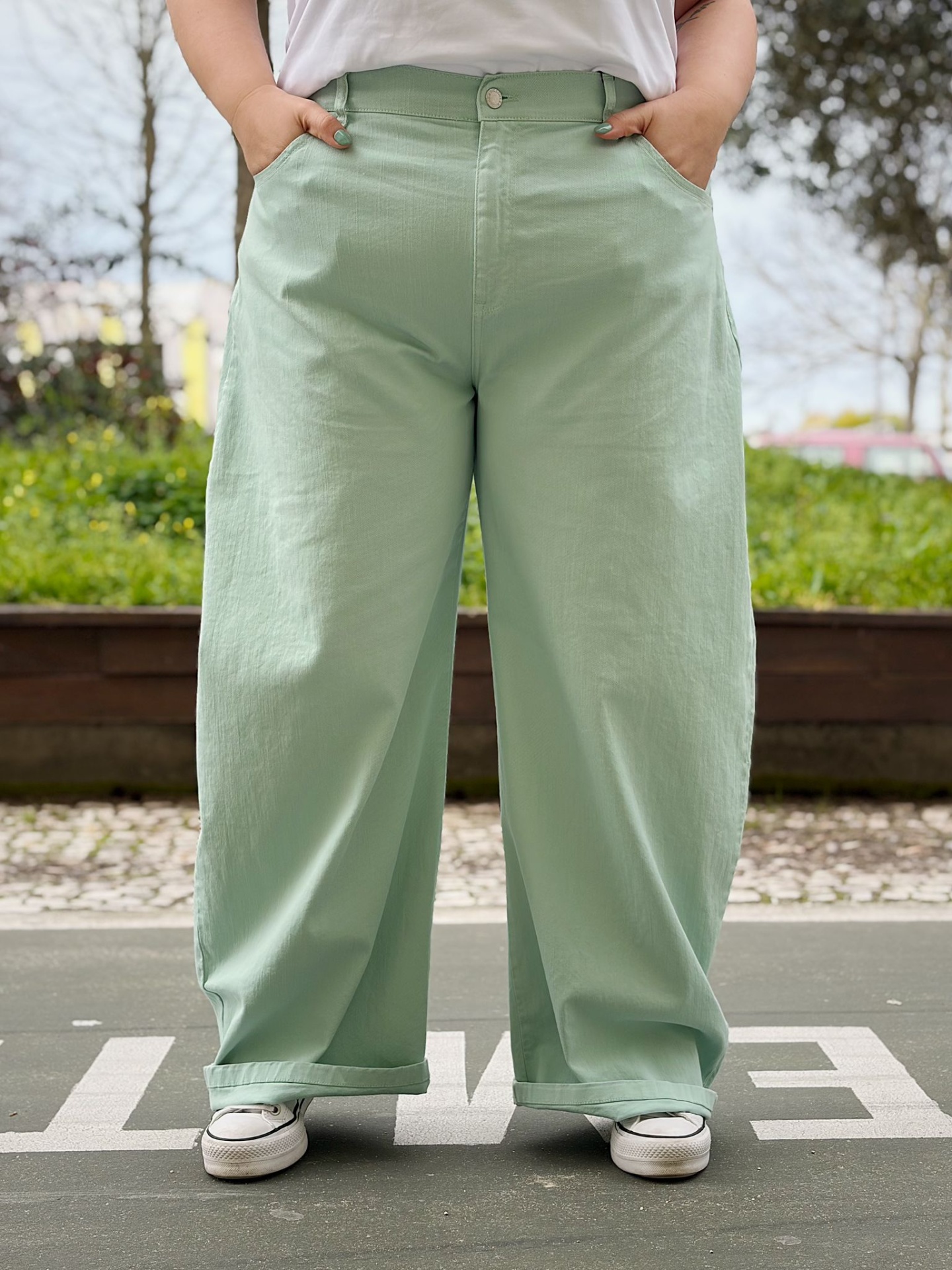 Calças de ganga em verde-menta em modelo ballon.