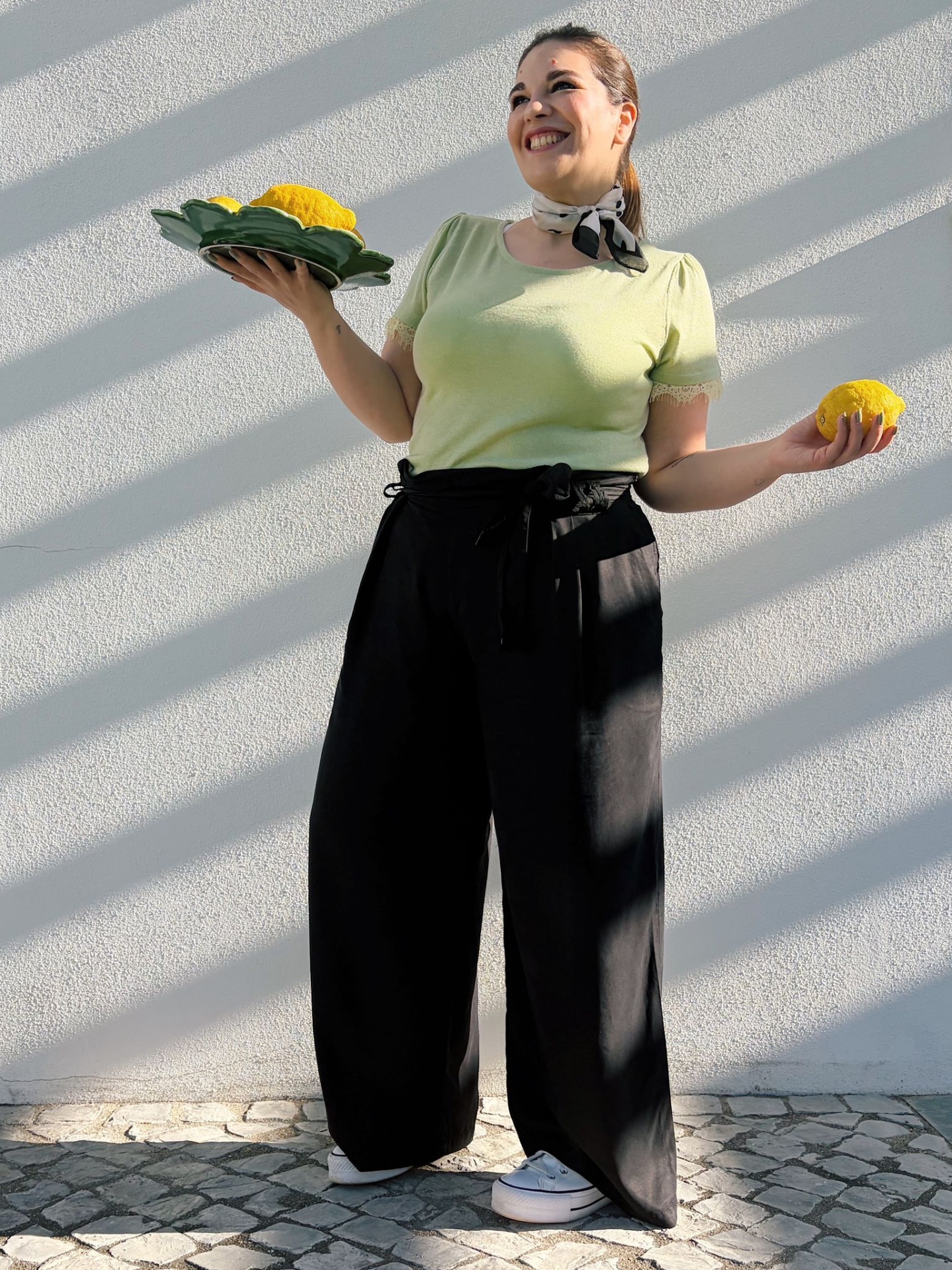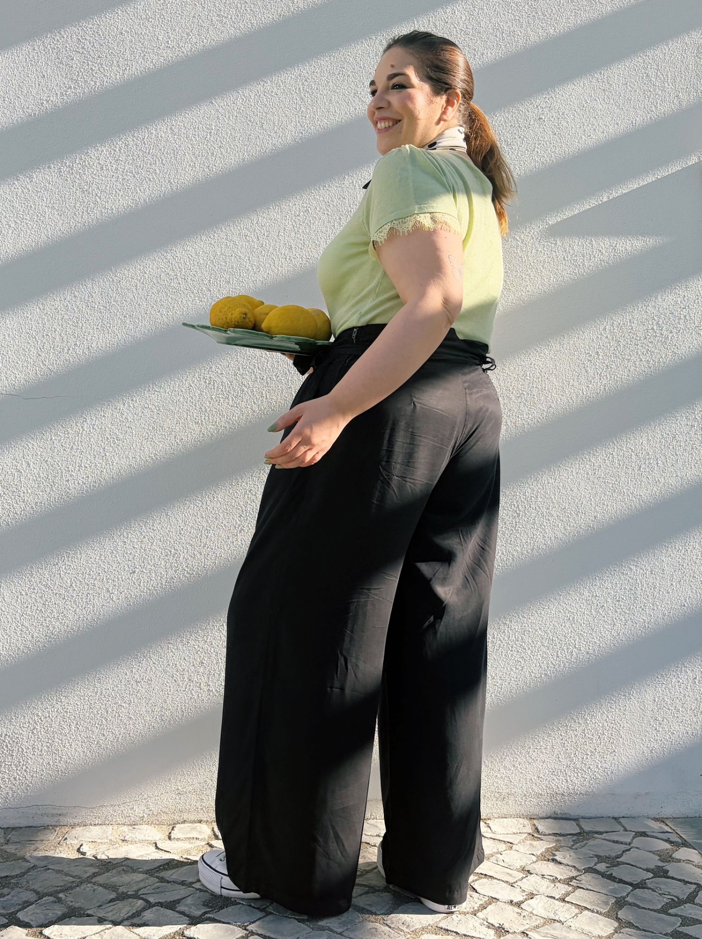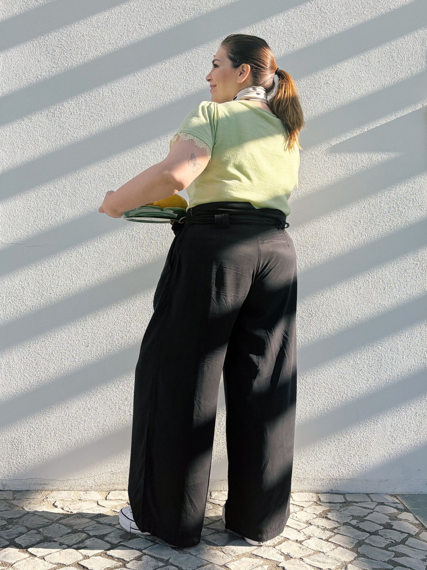 Calças estilo Pantalonas originais com presilhas e cinto (amovível).