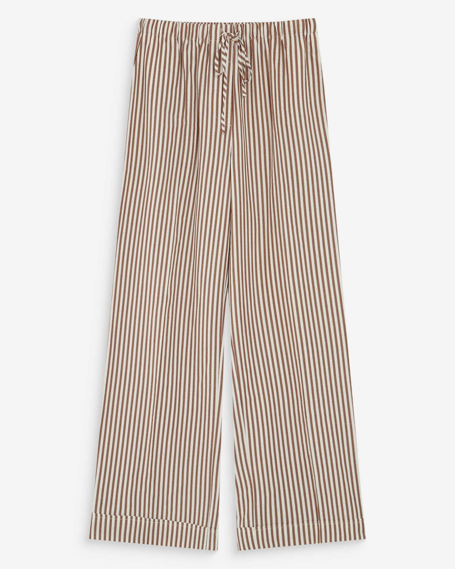 Calças de tecido estilo Pantalonas com padrão de riscas em tom de crú/castanho.