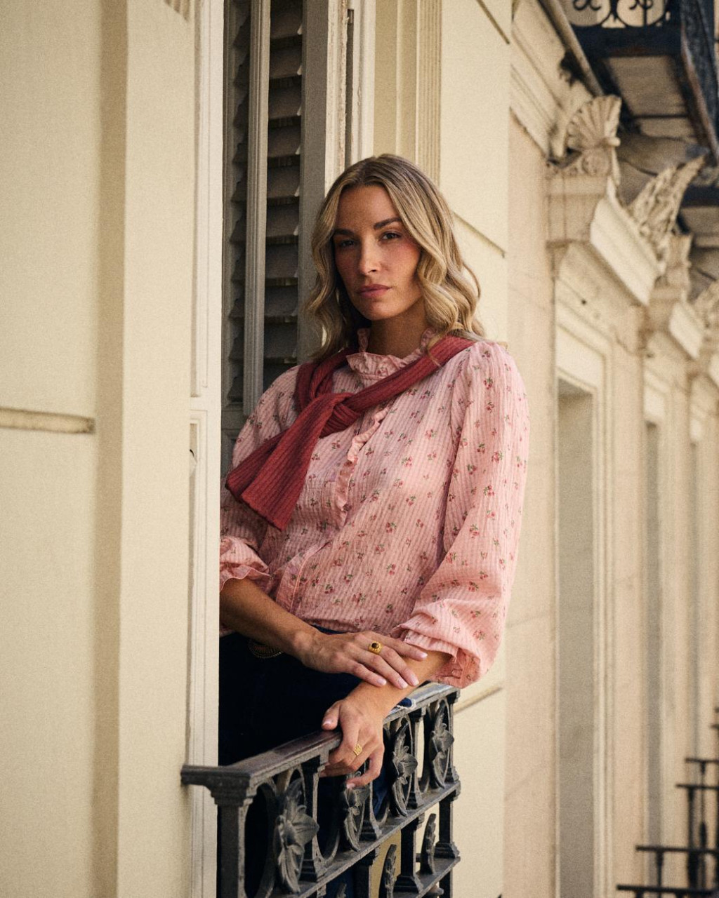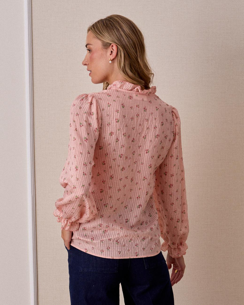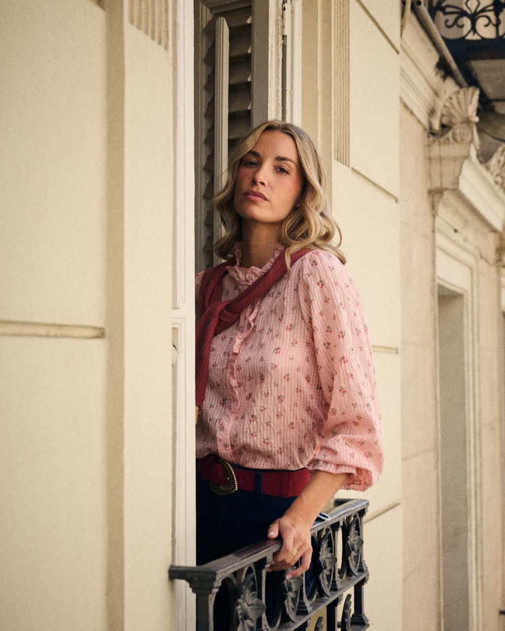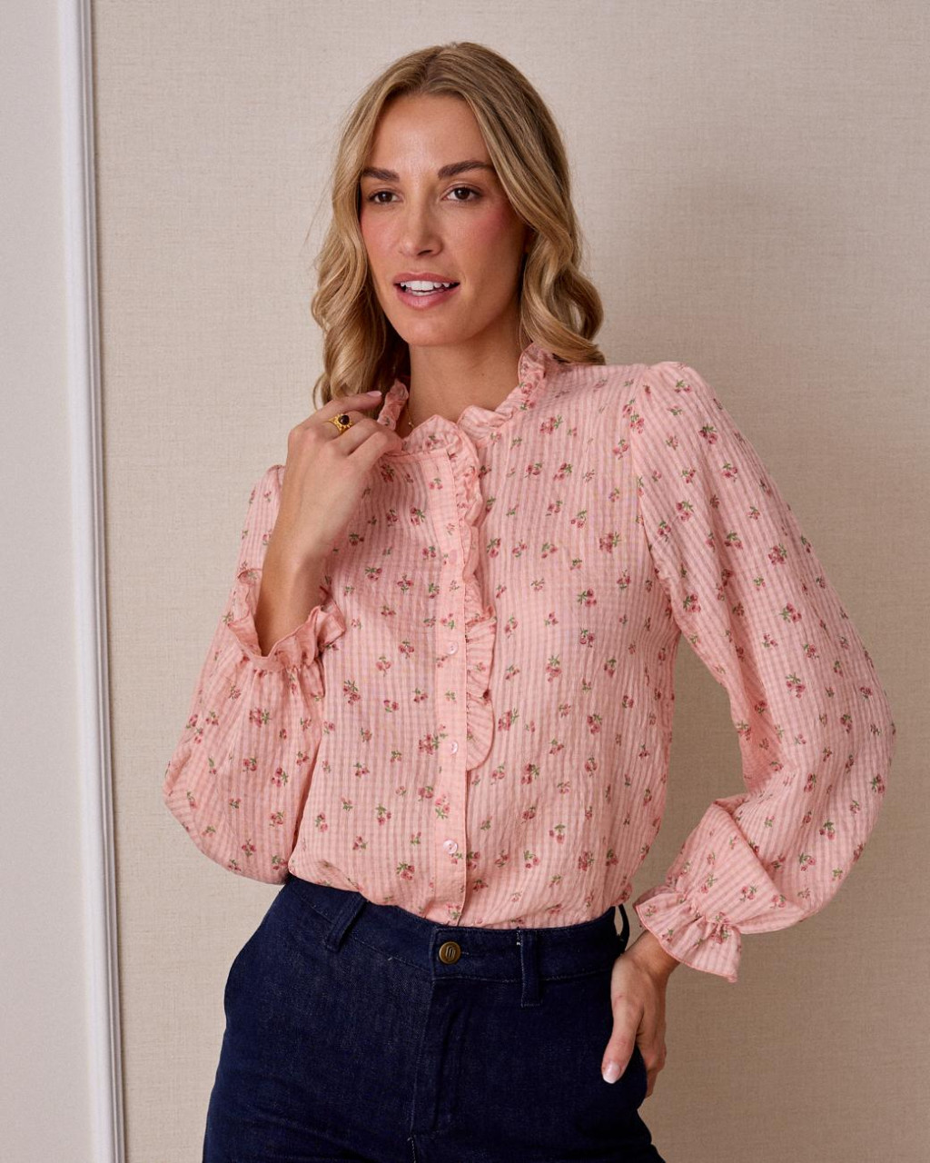 Camisa romântica vichy em tons de rosa e flores delicadas em contraste.