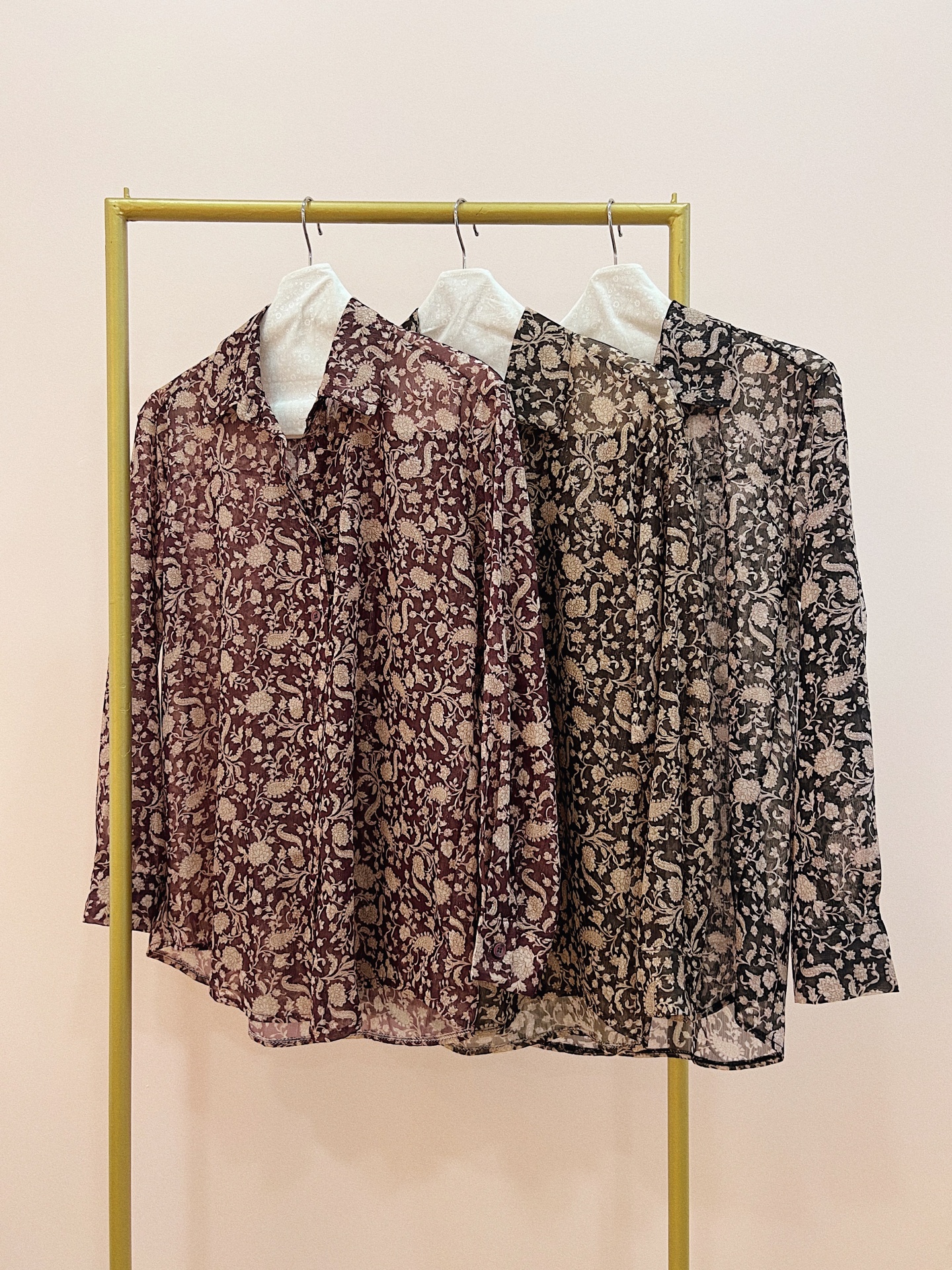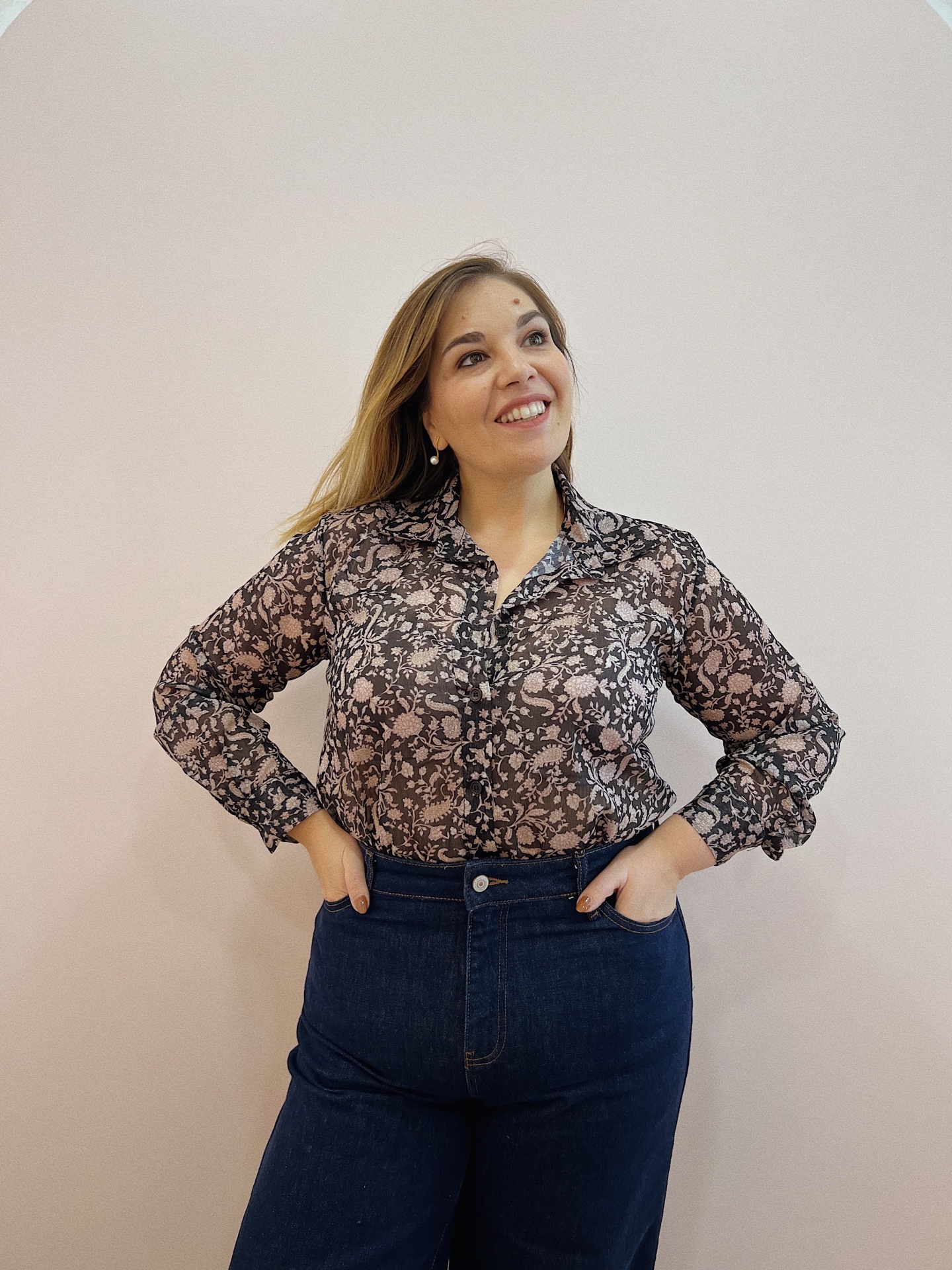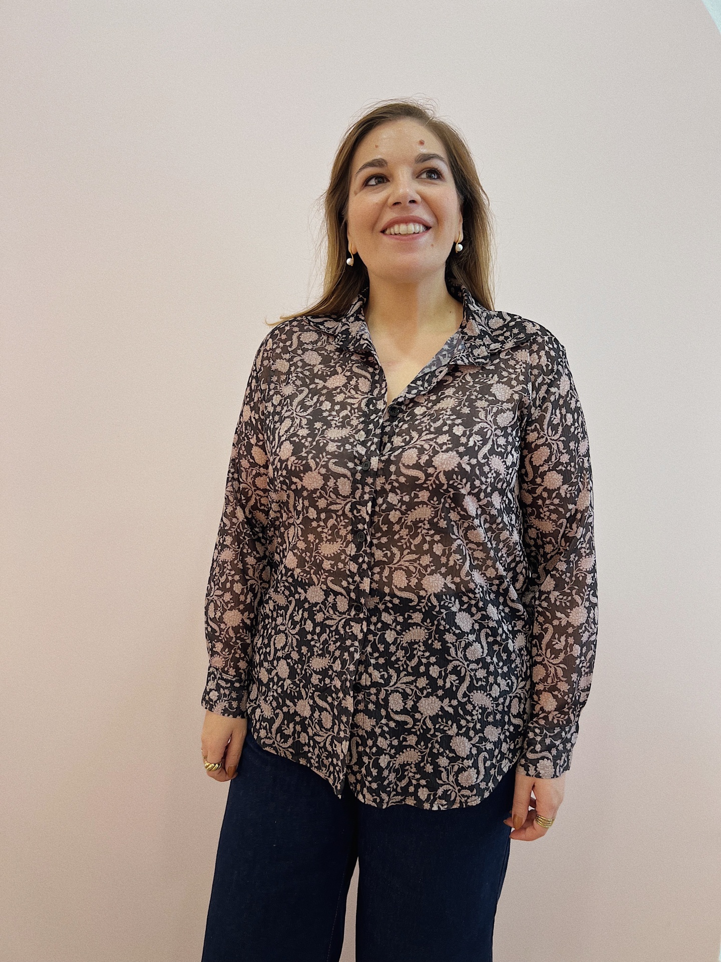 Camisa de ajuste regular com padrão floral delicado, num tecido leve (estilo crepe) com ligeira transparência e brilho.