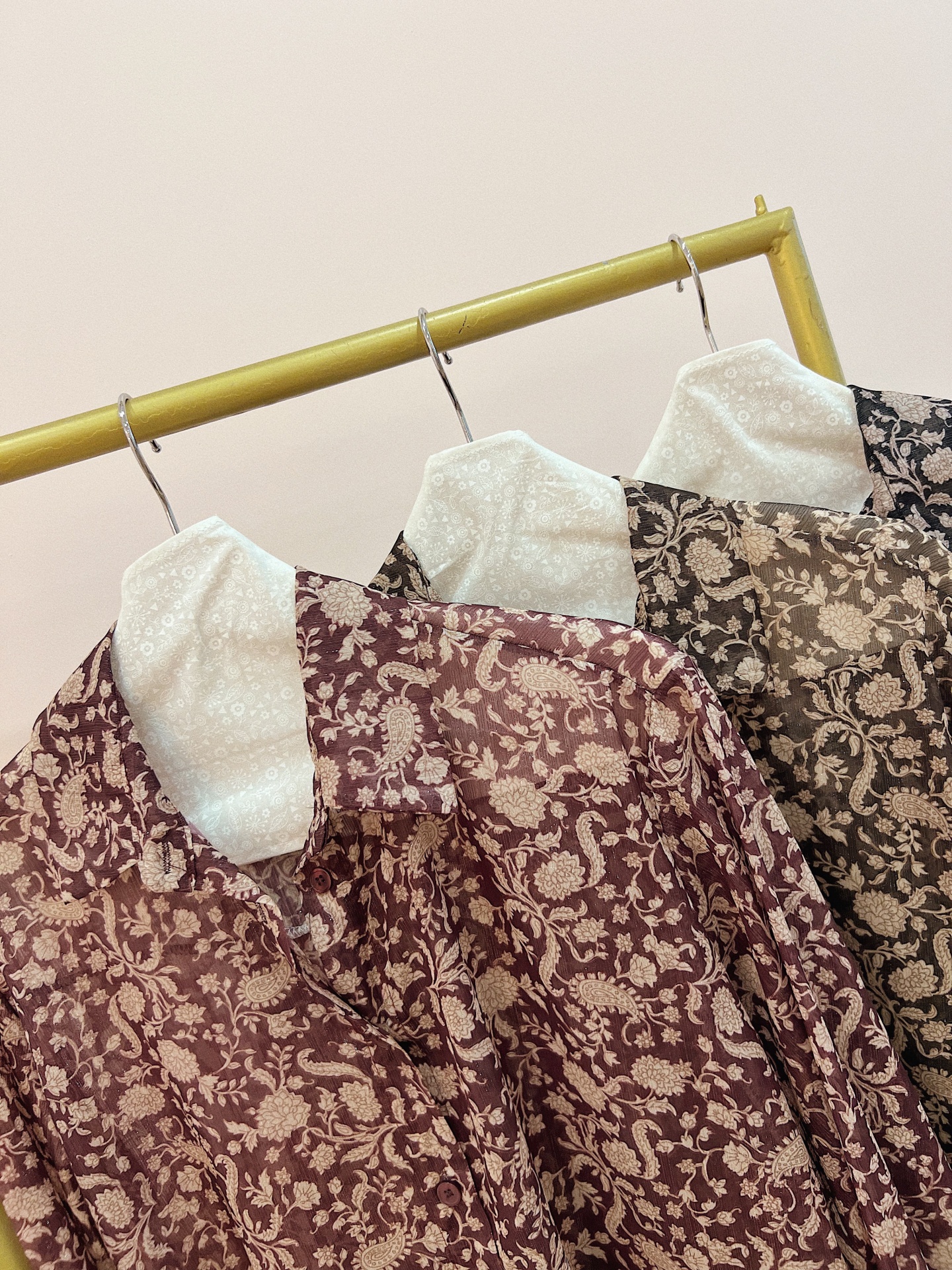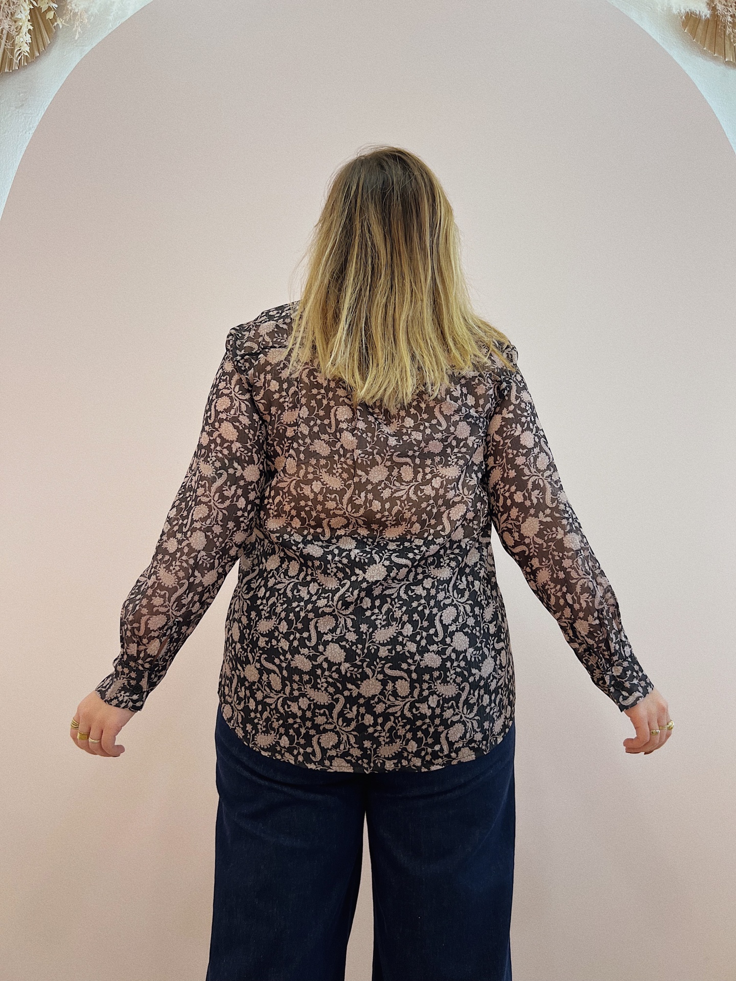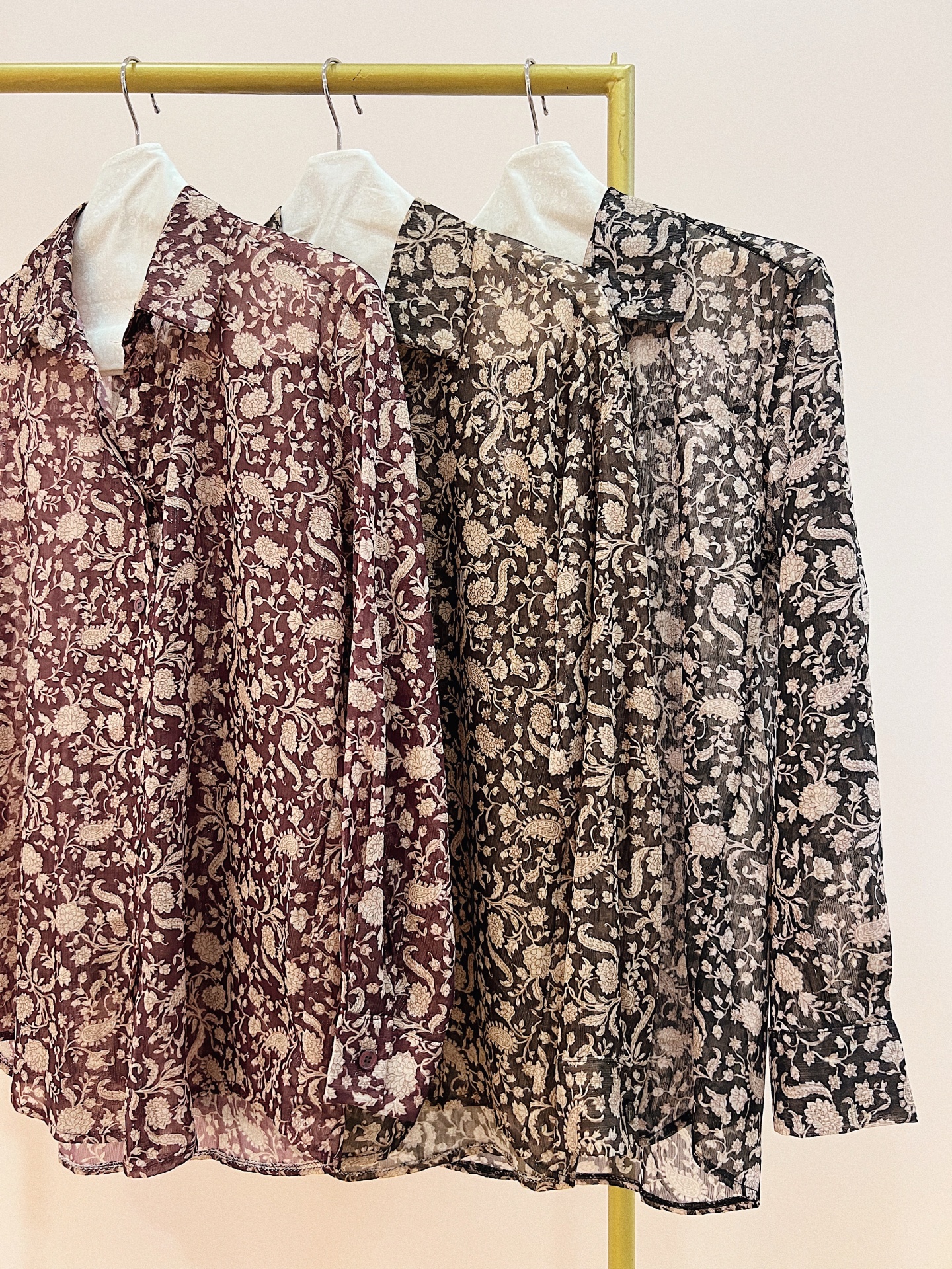 Camisa de ajuste regular com padrão floral delicado, num tecido leve (estilo crepe) com ligeira transparência e brilho.