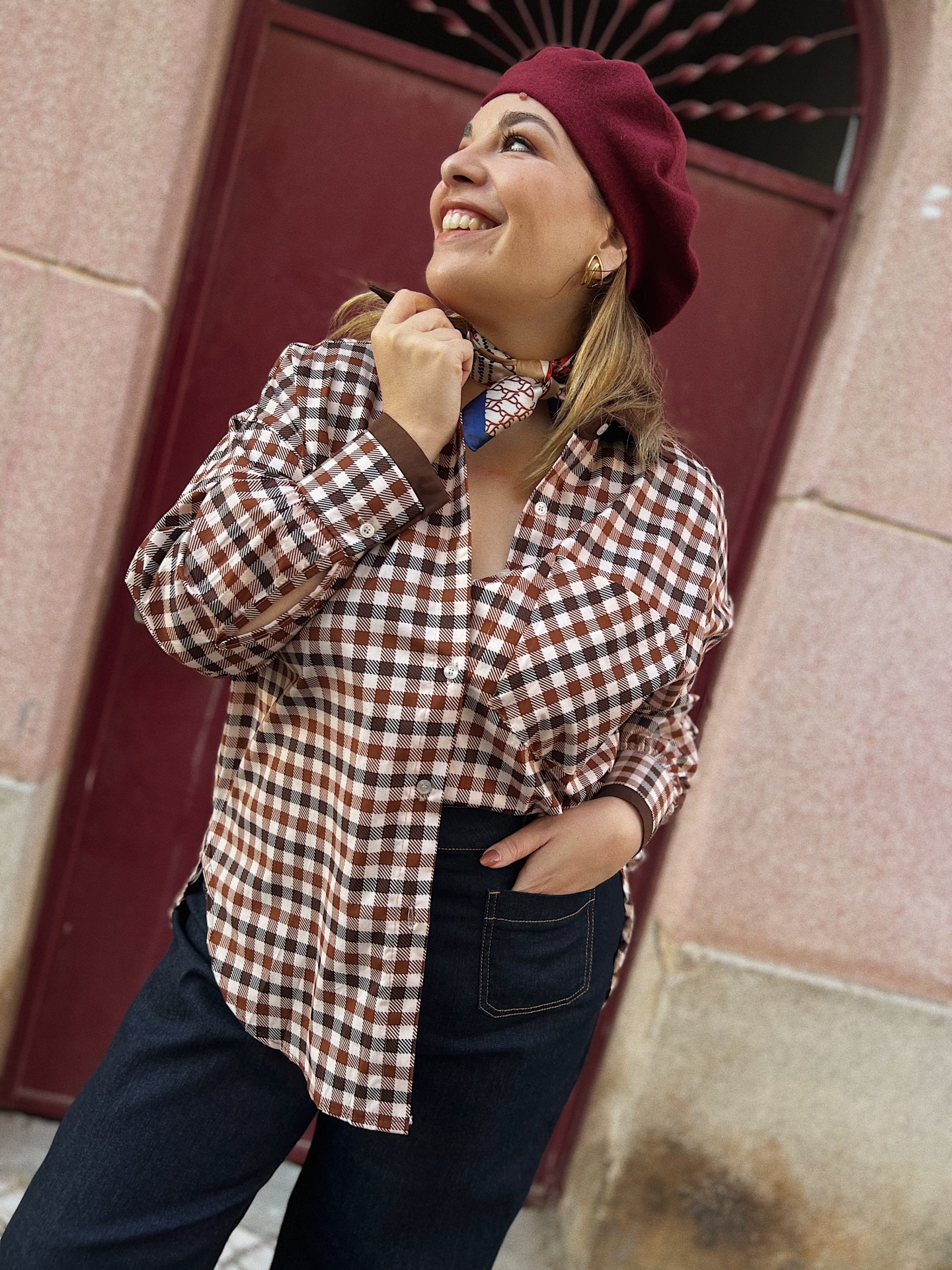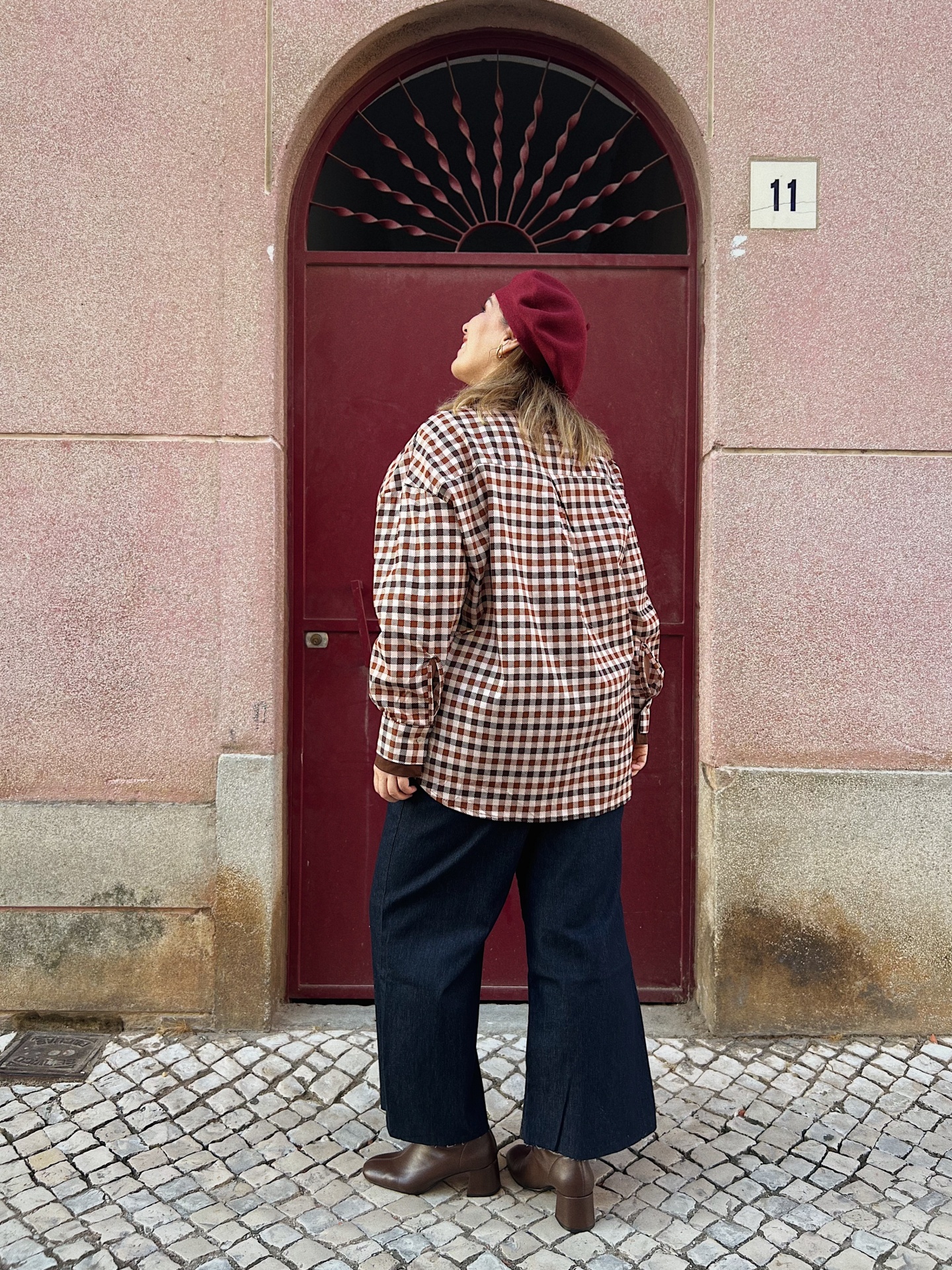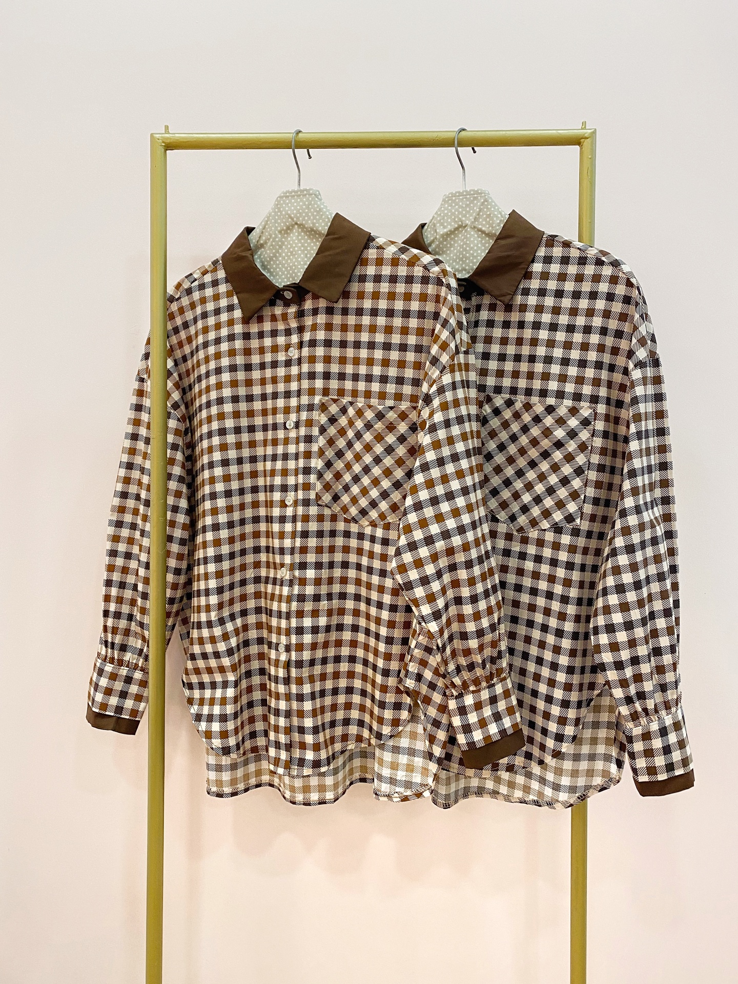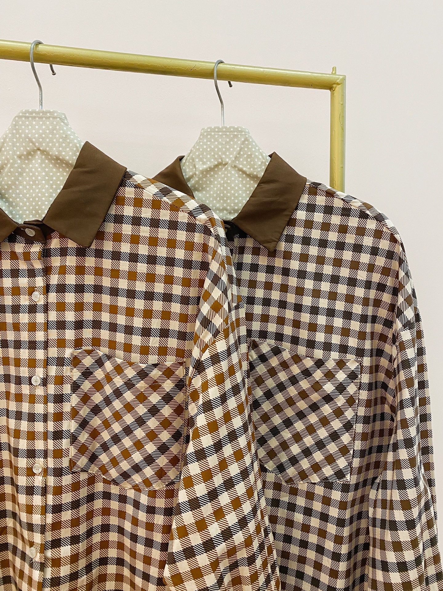 Gola clássica com botões á frente. Bolso na zona do peito. Padrão de xadrez/vichy.