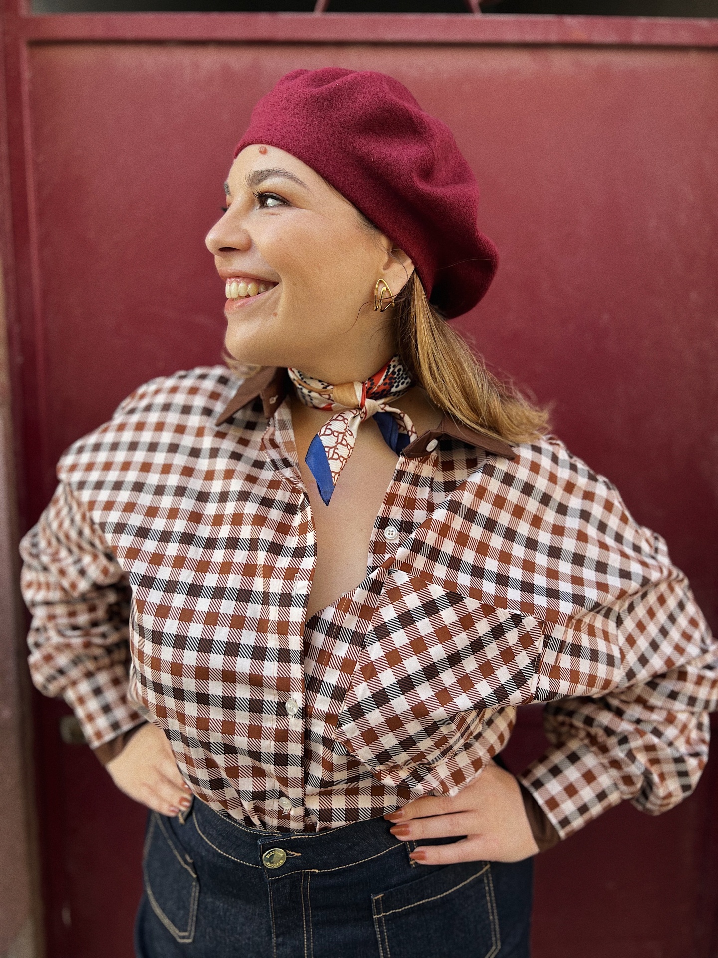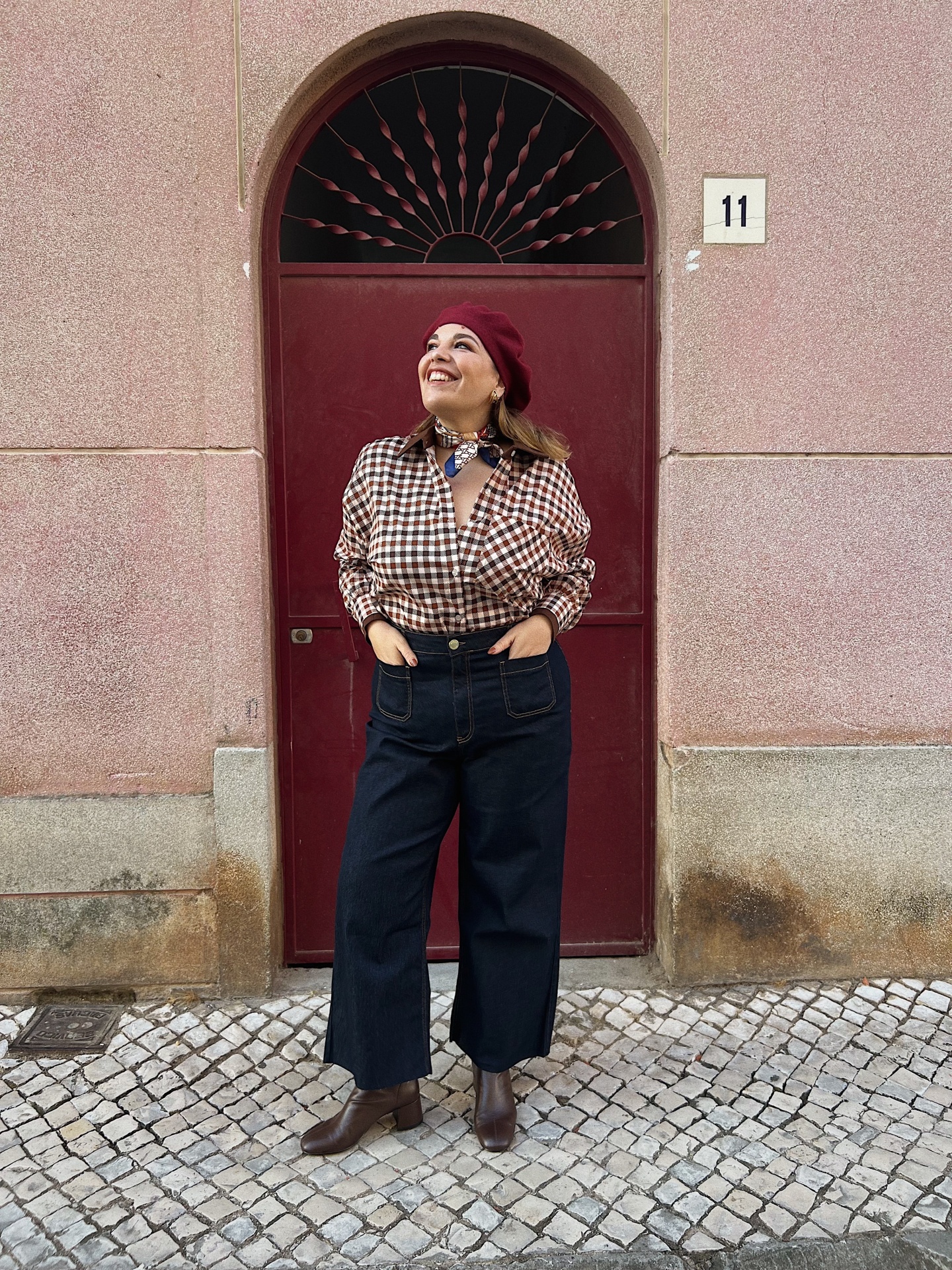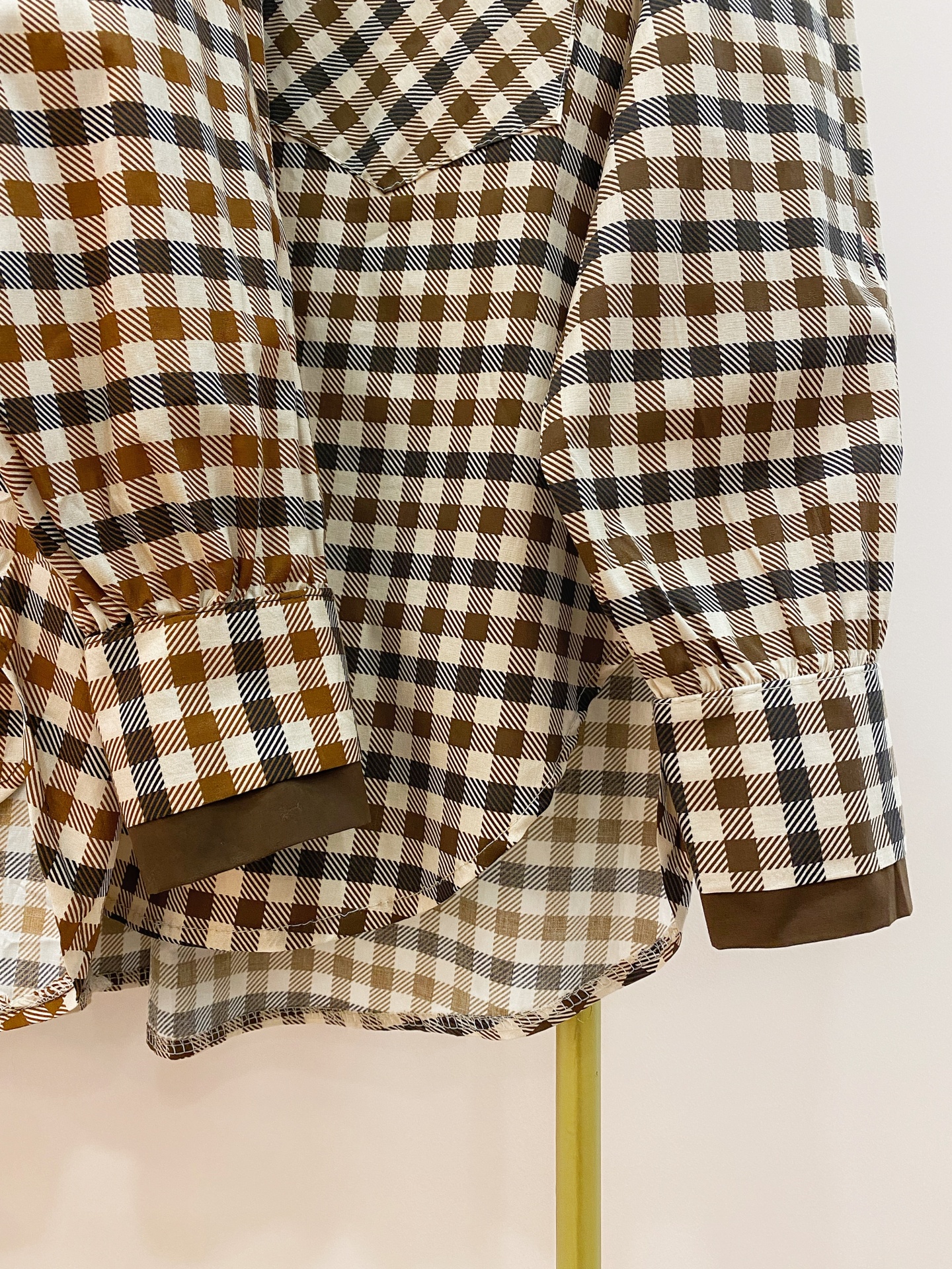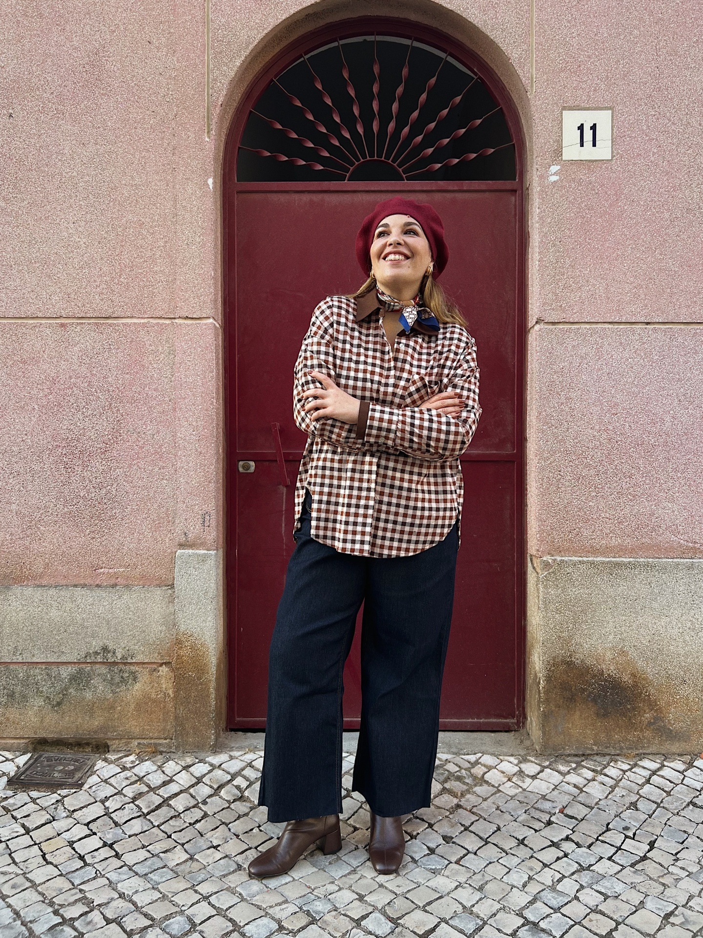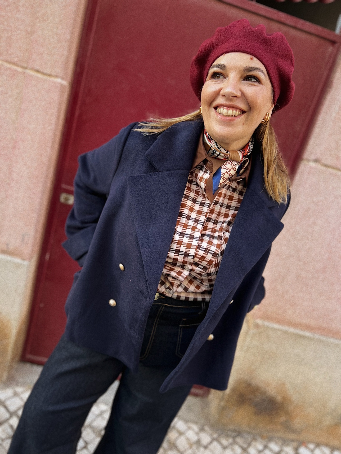 Gola clássica com botões á frente. Bolso na zona do peito. Padrão de xadrez/vichy.