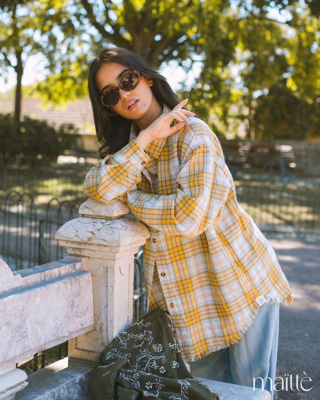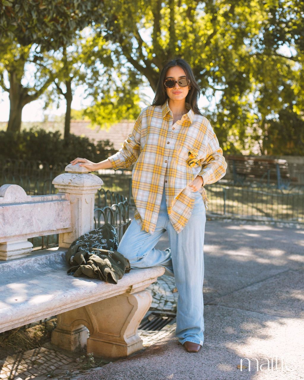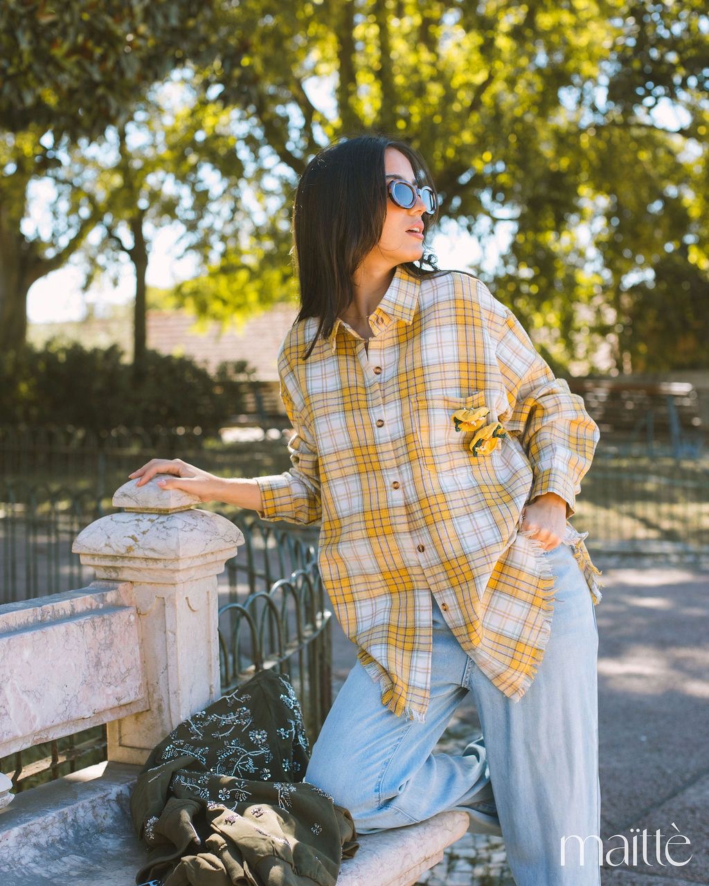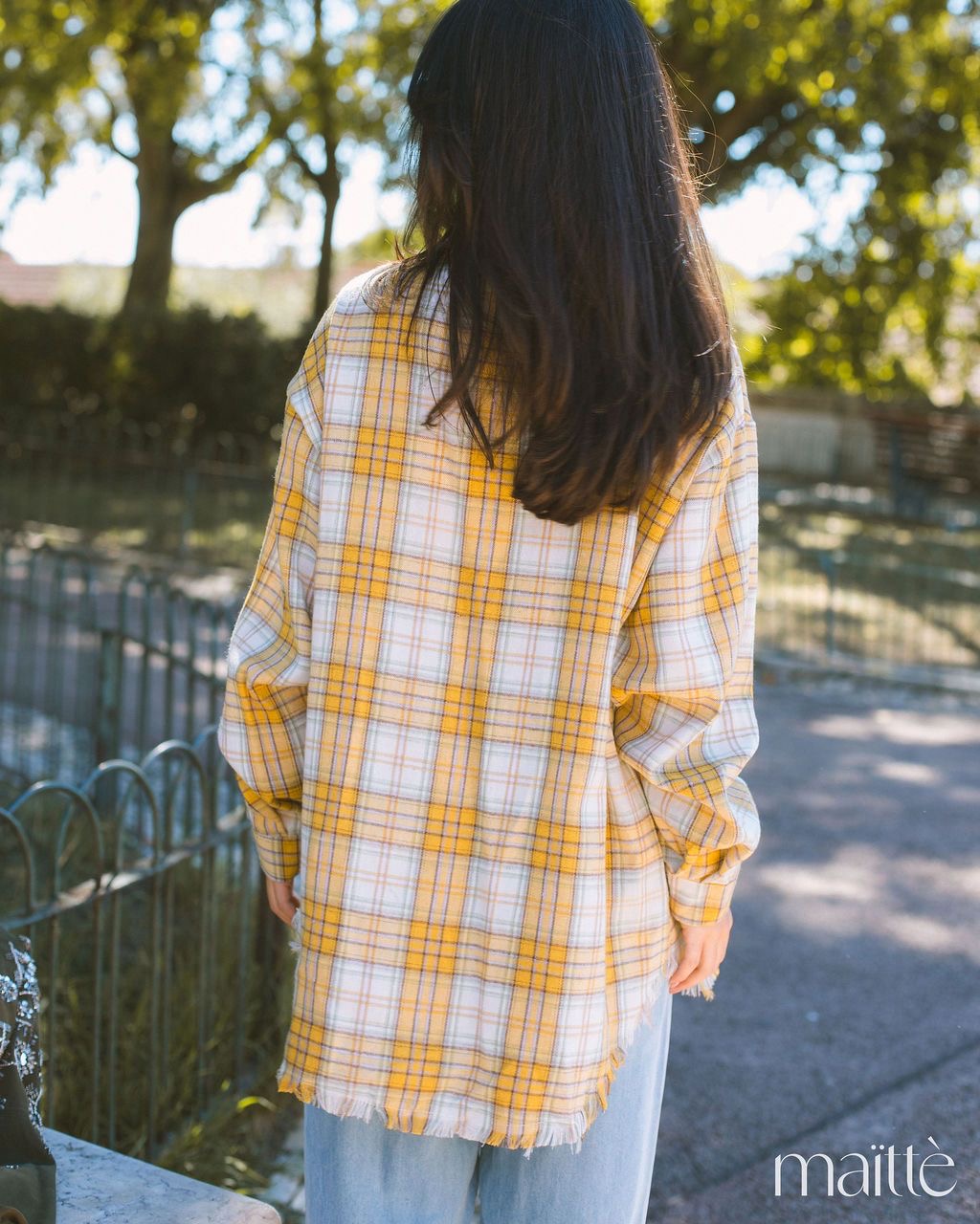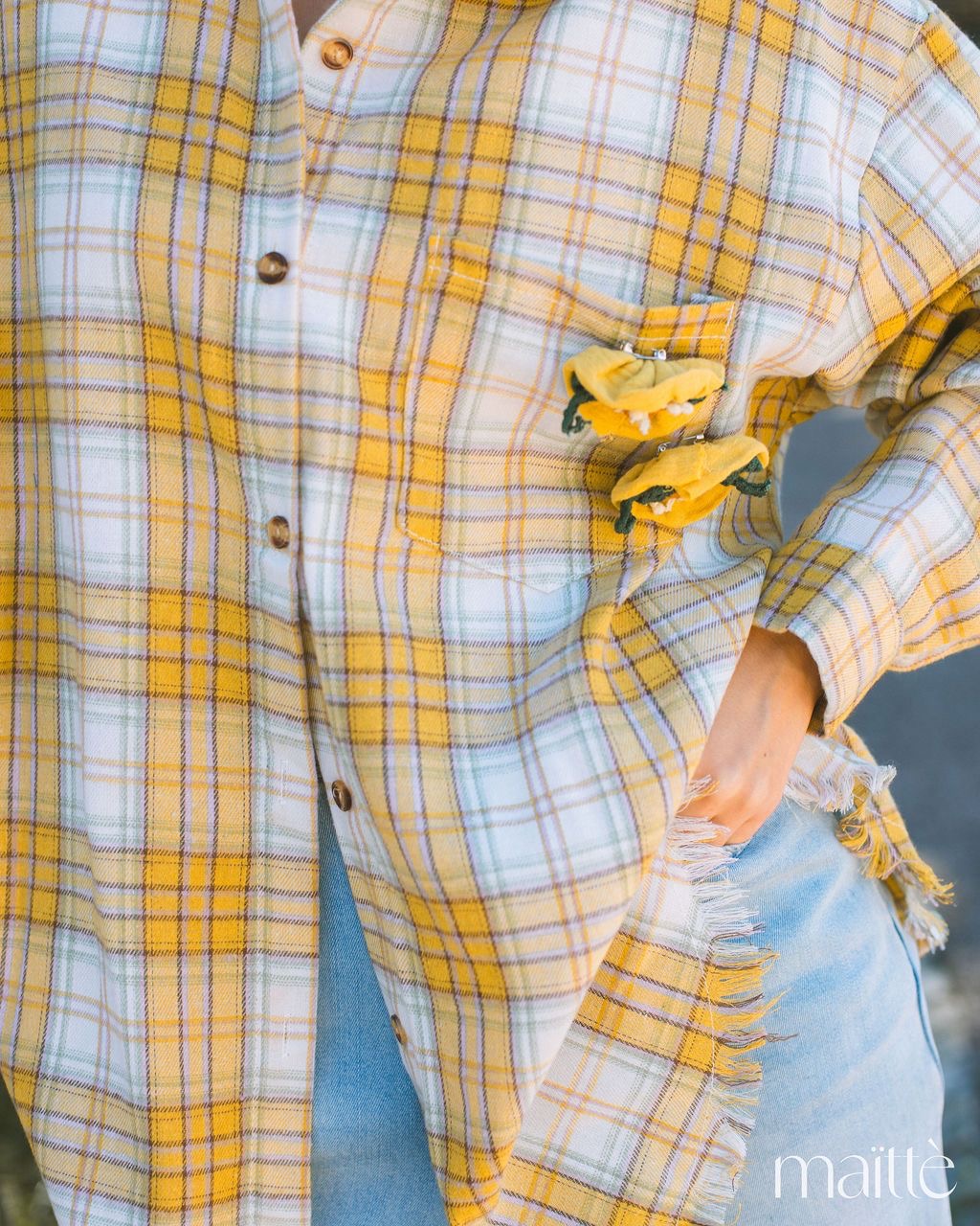 Camisa de flanela (suave) com padrão xadrez em tons de amarelo, roxo, branco e verde.